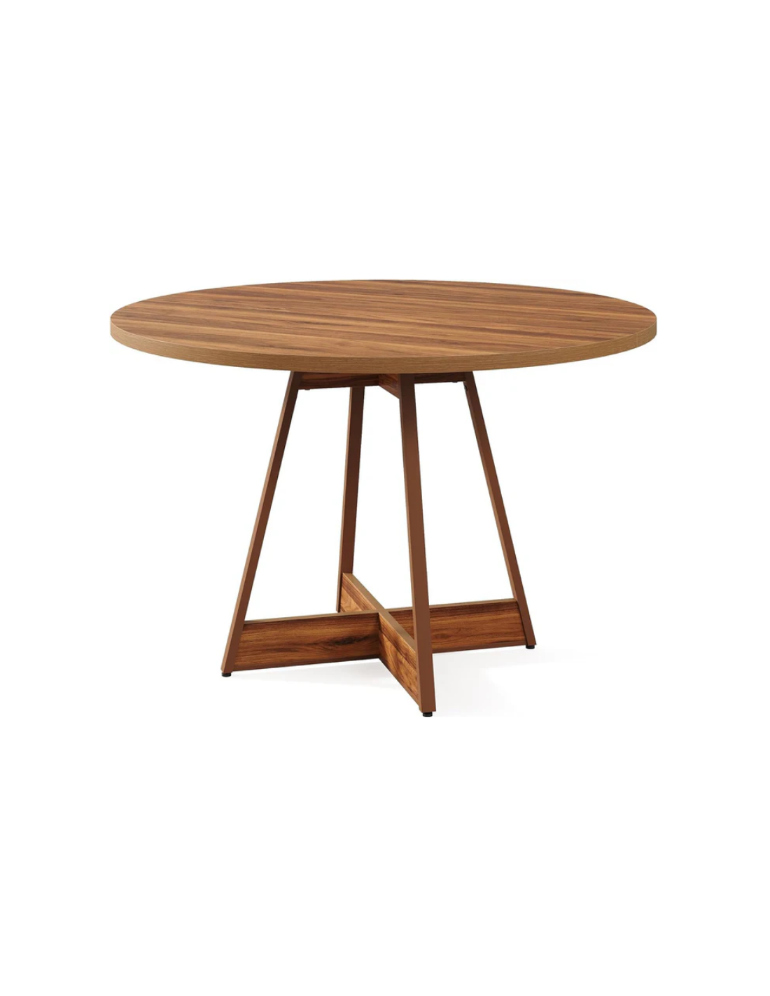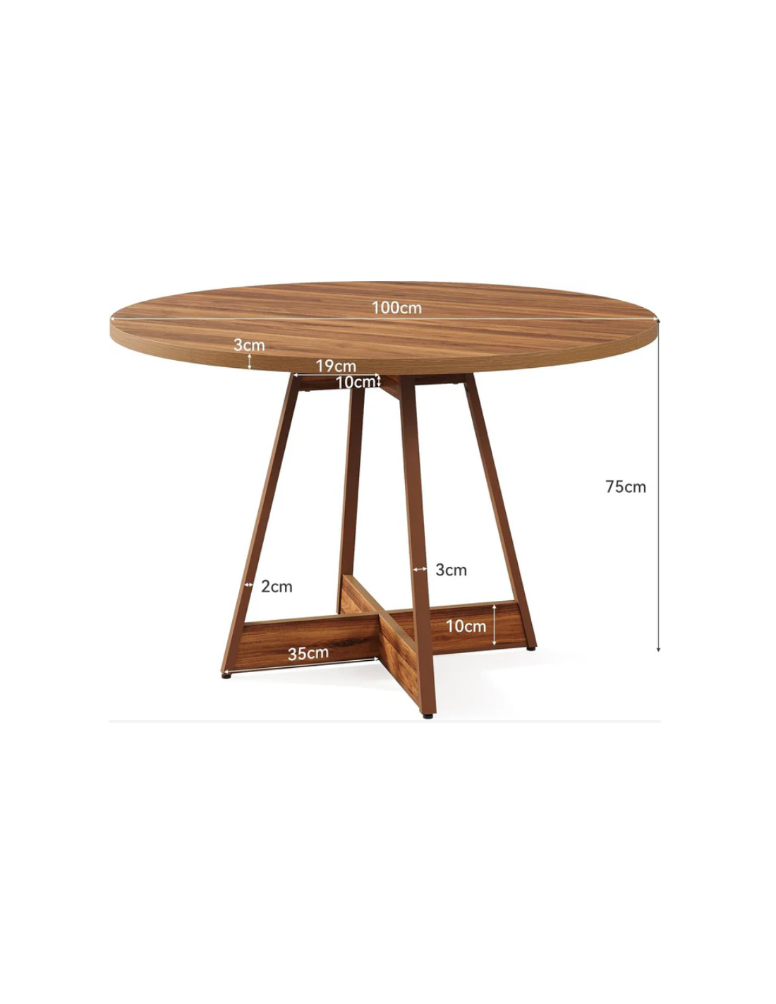 Rundt spisebord udført i et design af brun metal og møbelplade. Bordet måler 75 cm i højden og 100 cm i diameter.