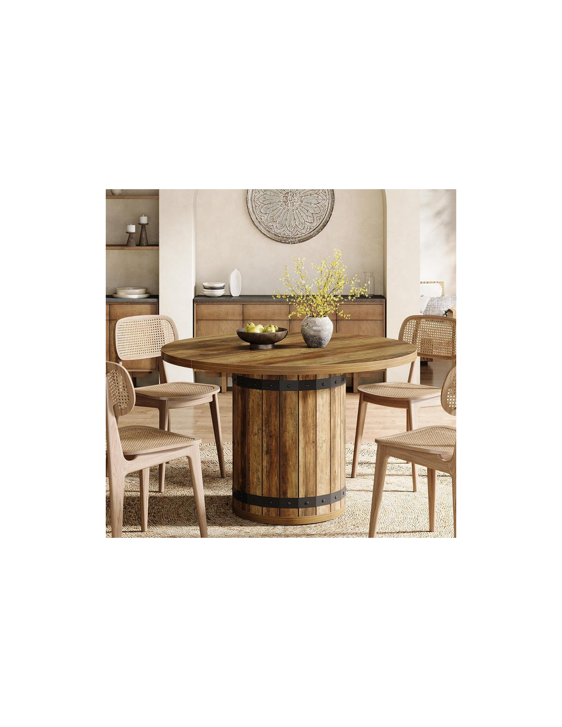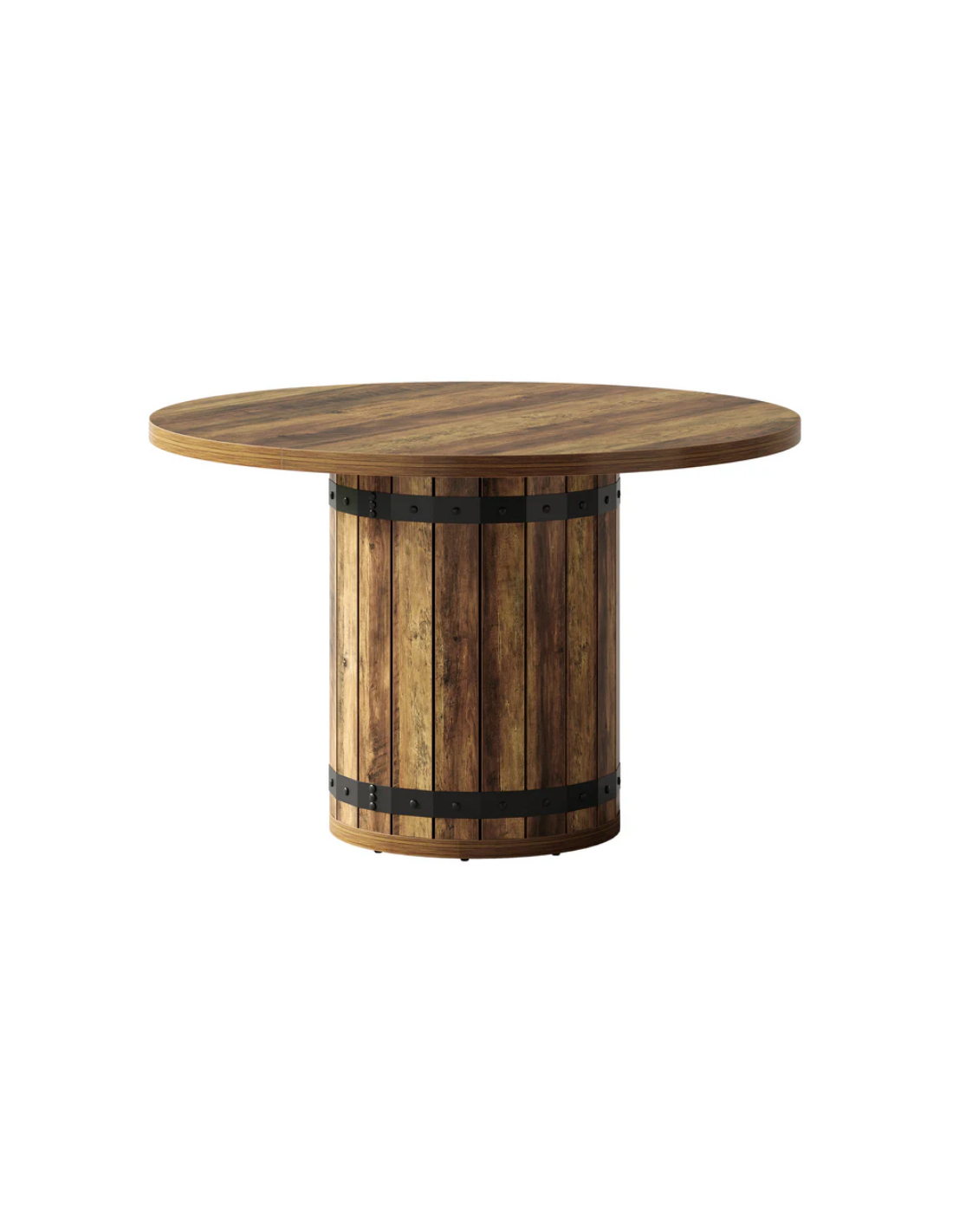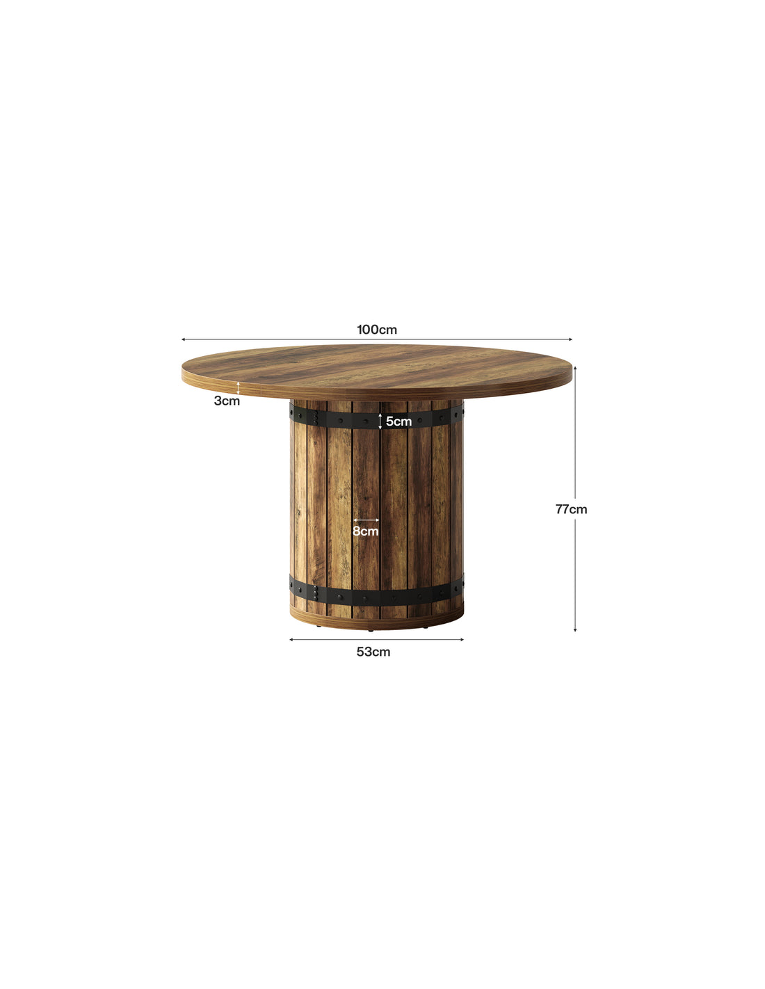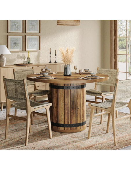 Rundt spisebord udført i et rustikt design af sortlakeret metal og brun MDF og møbelplade. Bordet måler 77 cm i højden og 100 cm i diameter.