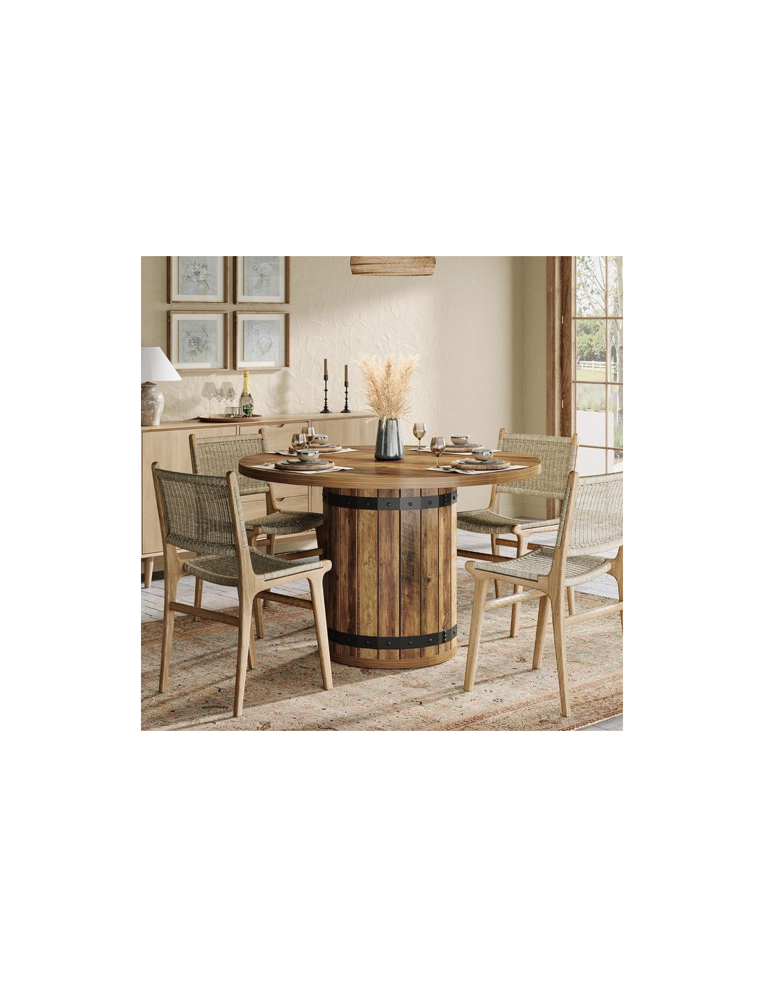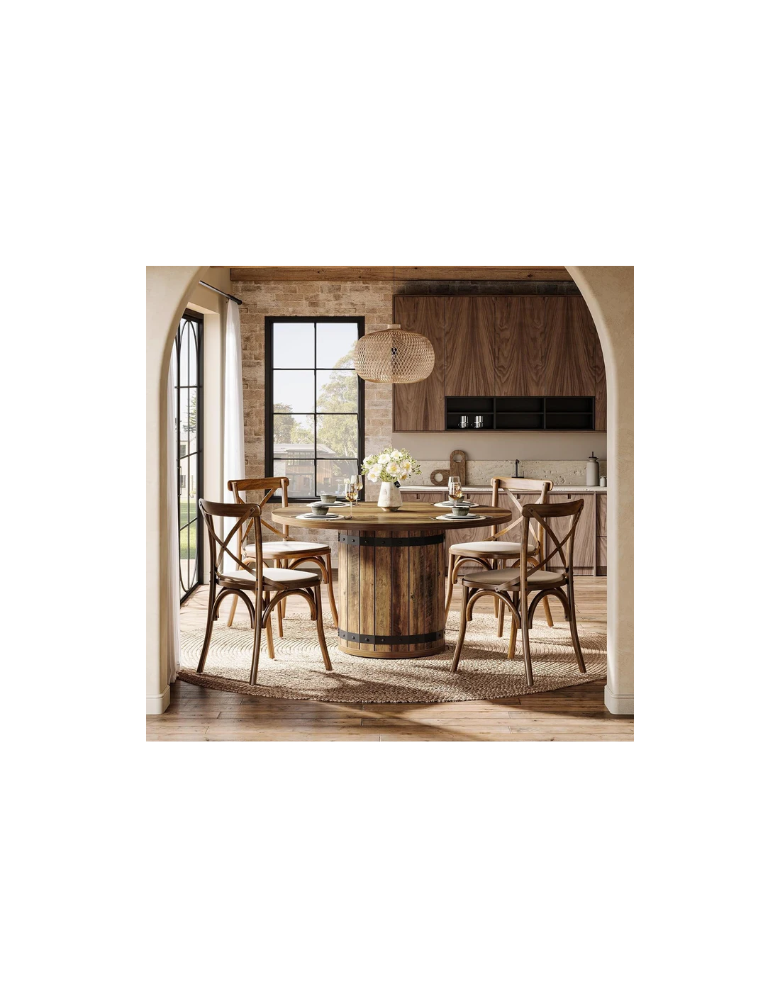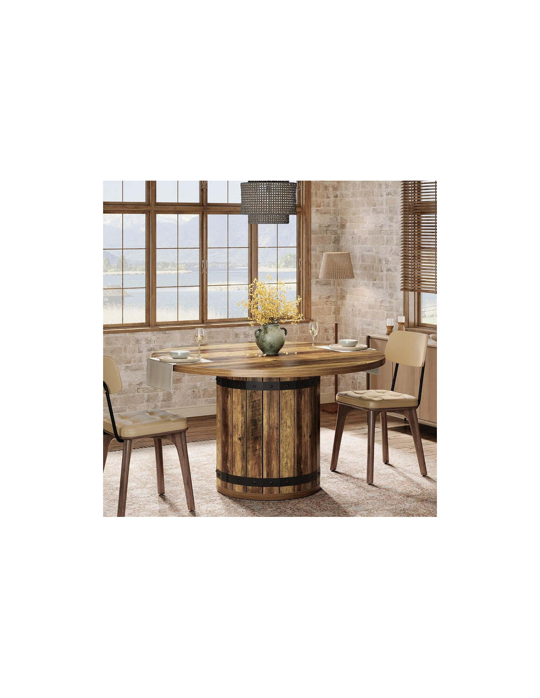 Rundt spisebord udført i et rustikt design af sortlakeret metal og brun MDF og møbelplade. Bordet måler 77 cm i højden og 100 cm i diameter.