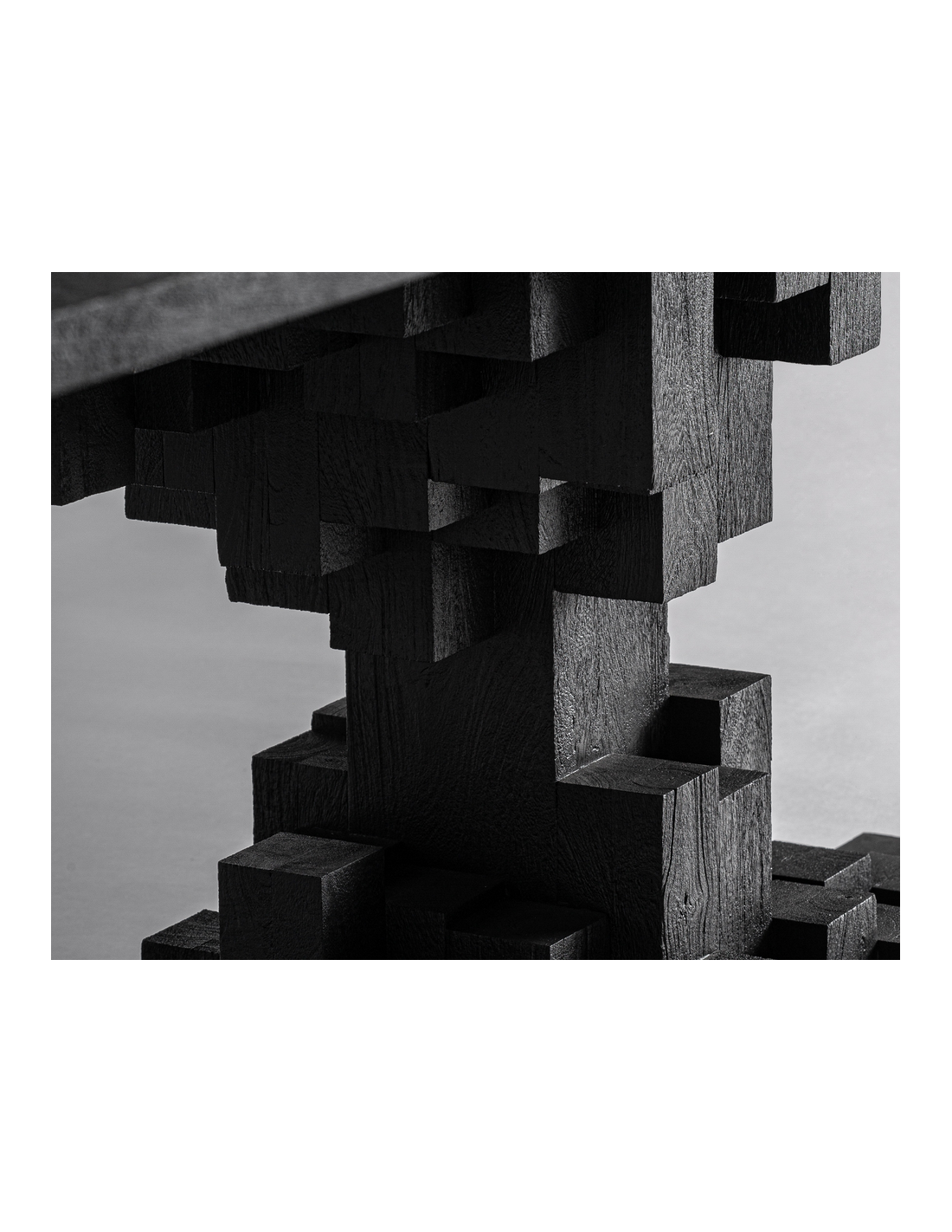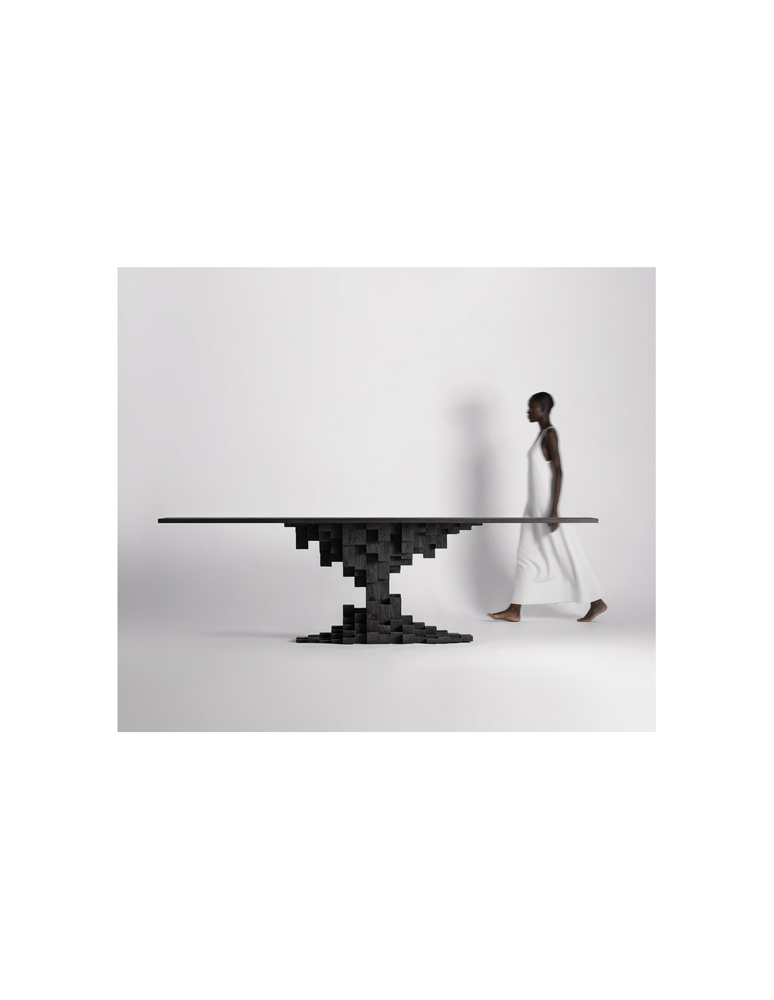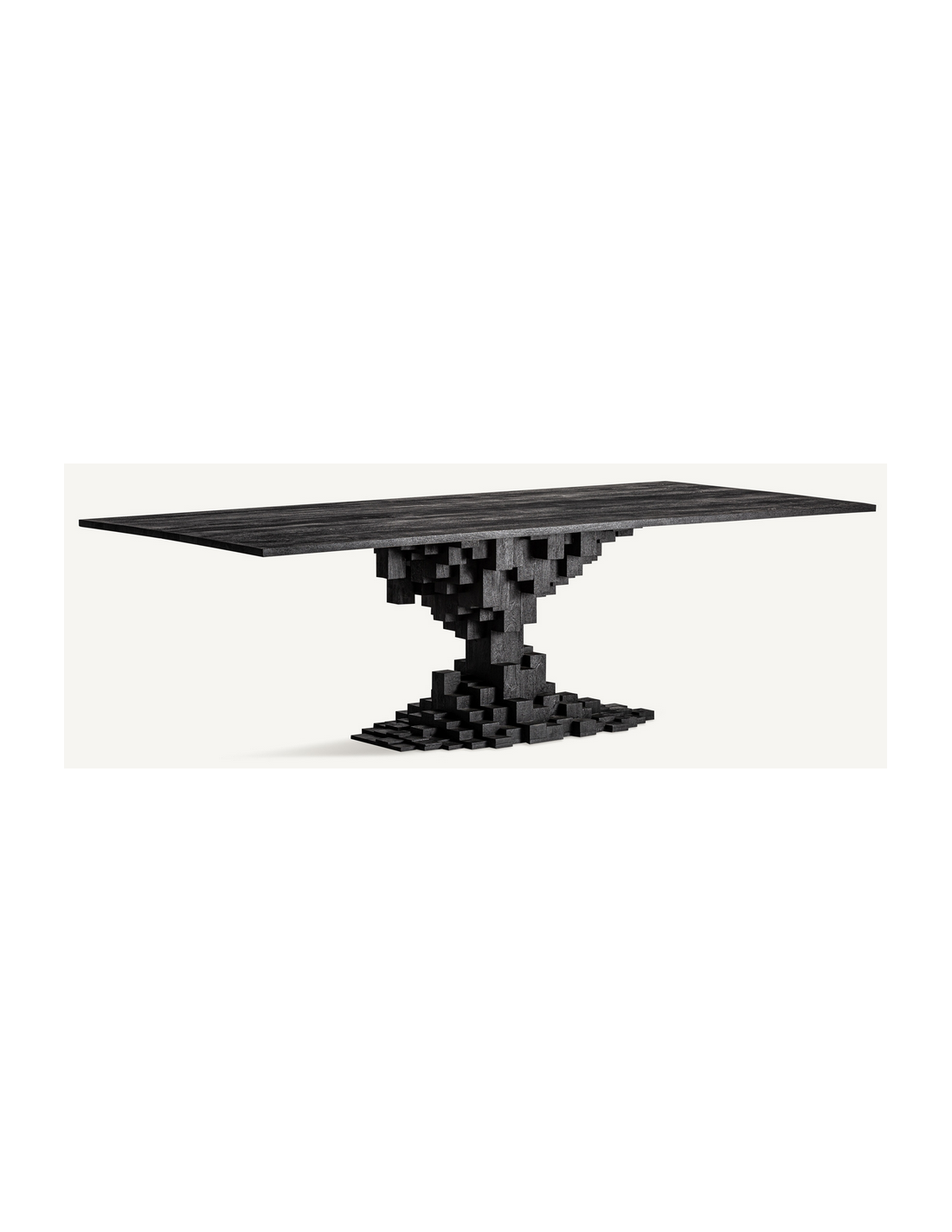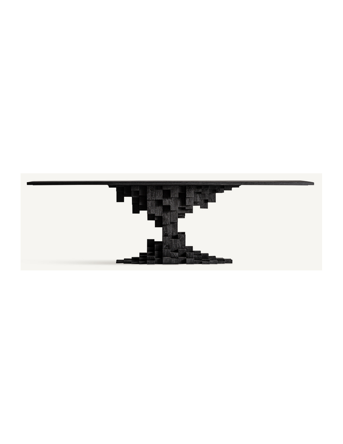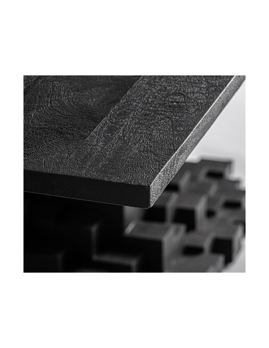 PETRIA Skulpturelt spisebord udført i et moderne design af sandblæst sortlakeret mangotræ. Spisebordet måler 75 cm i højden med en frihøjde under bordpladen på 72 cm. Spisebordet måler 250 x 110 cm i bredde og dybde og vejer 136 kg.