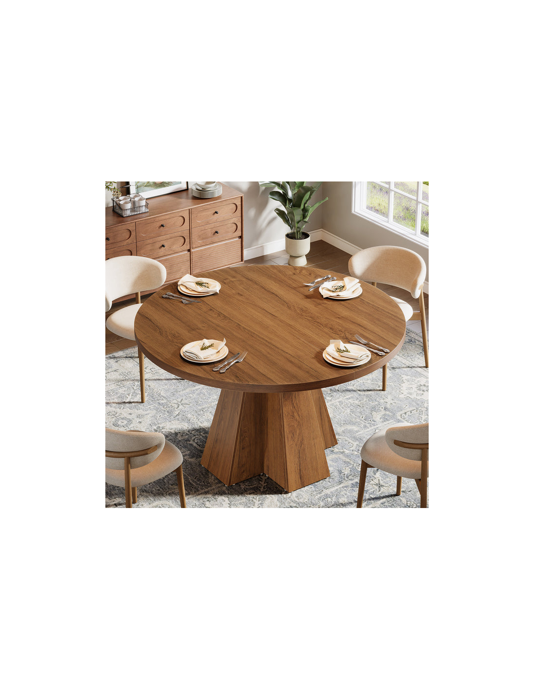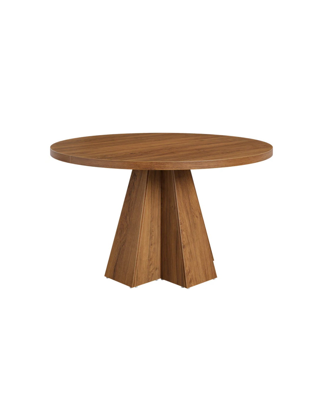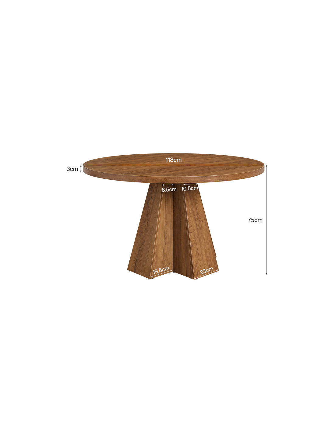 Rundt spisebord udført i et design af brun MDF. Bordet måler 75 cm i højden og 118 cm i diameter.
