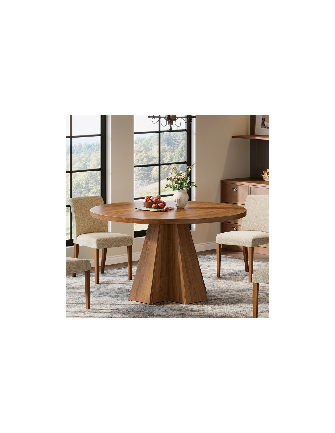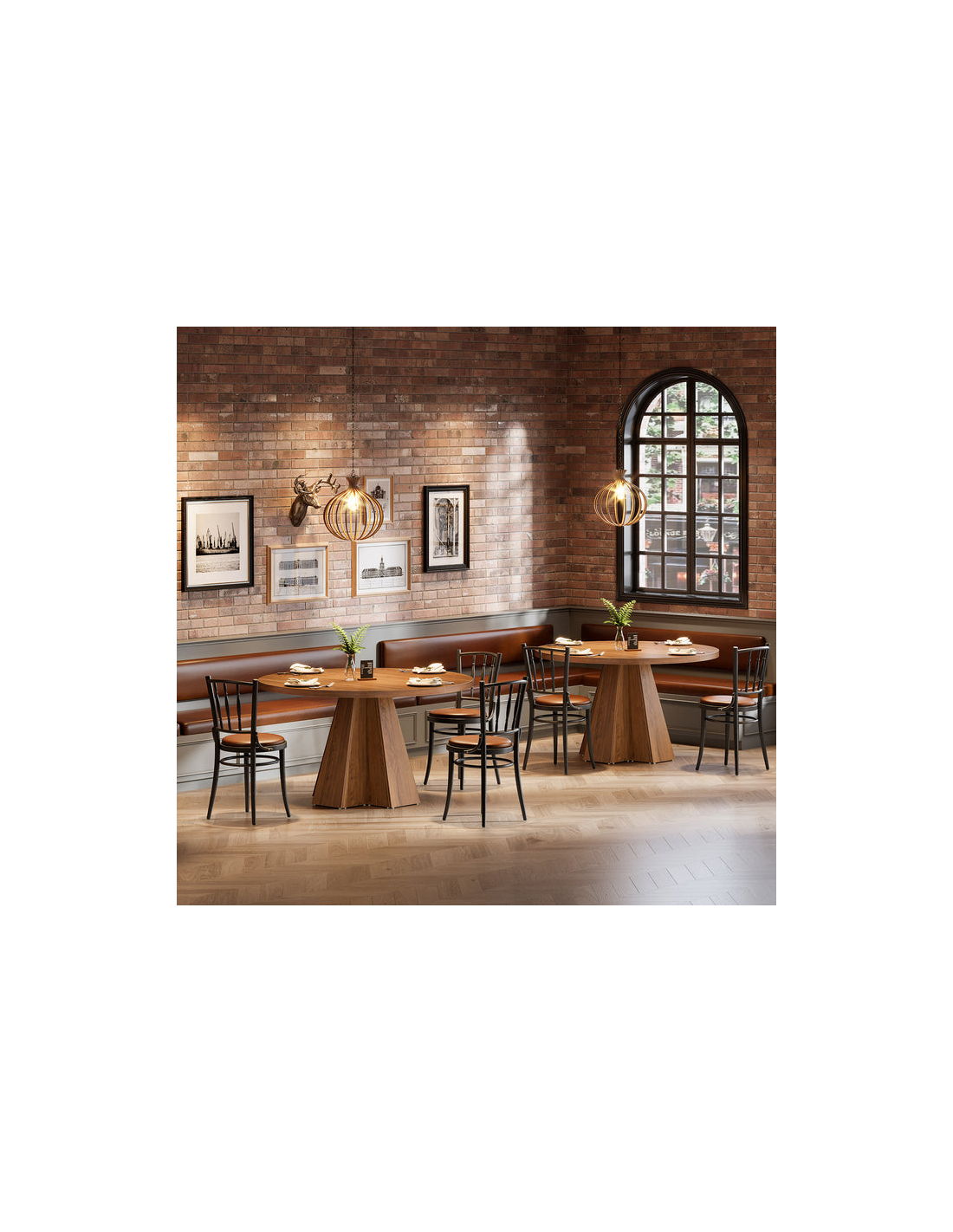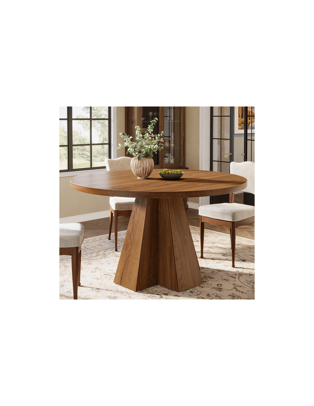 Rundt spisebord udført i et design af brun MDF. Bordet måler 75 cm i højden og 118 cm i diameter.