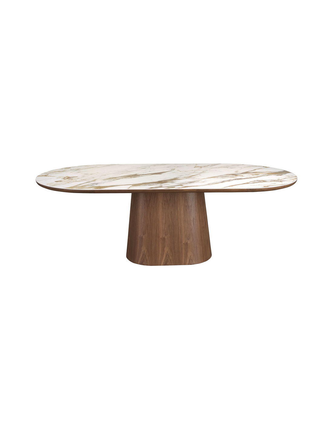 Ovalt spisebord udført i et moderne design fra Angel Cerdá. Spisebordet er fremstillet i valnøddefinér og porcelæn med hvid marmorlook. Spisebordet måler 76 cm i højden og 240 x 120 cm i bredde og dybde.