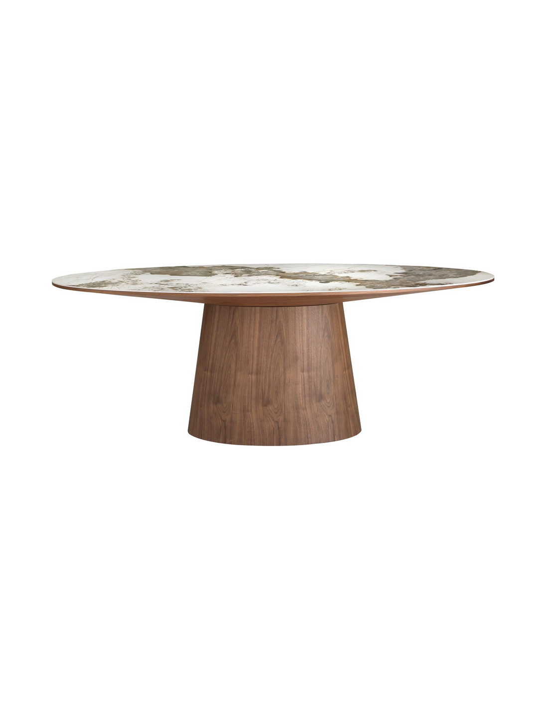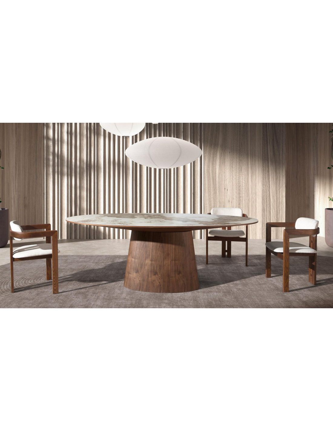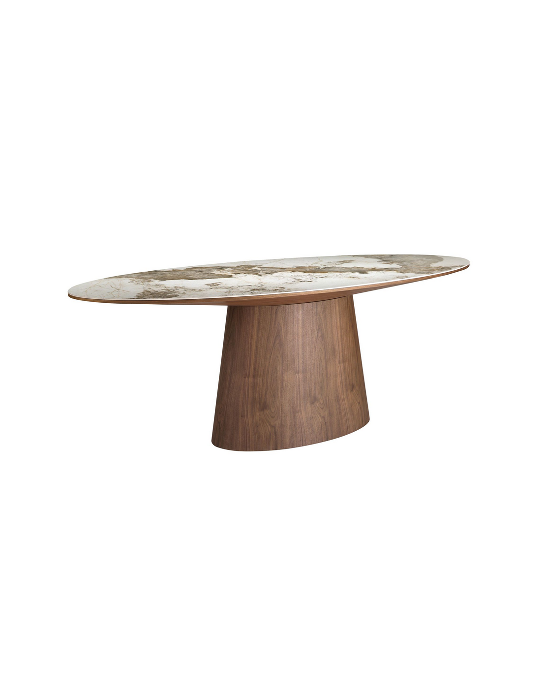 Ovalt spisebord udført i et moderne design fra Angel Cerdá. Spisebordet er fremstillet i valnøddefinér og porcelæn med hvid marmorlook. Spisebordet måler 76 cm i højden og 220 x 112 cm i bredde og dybde.