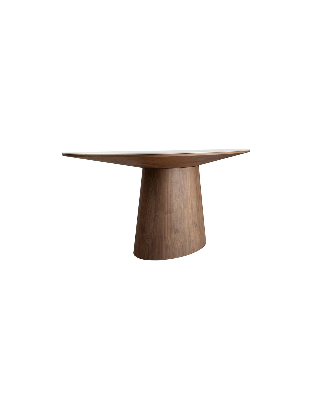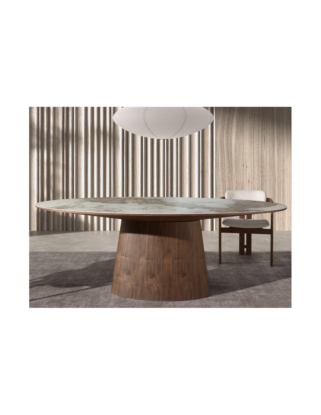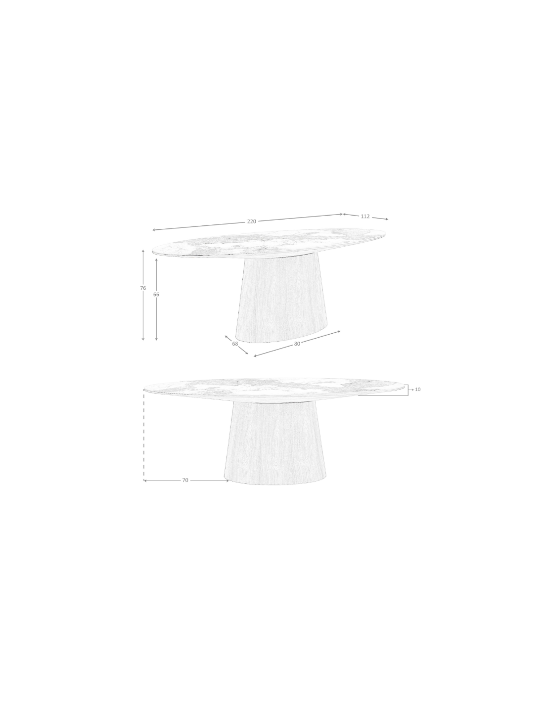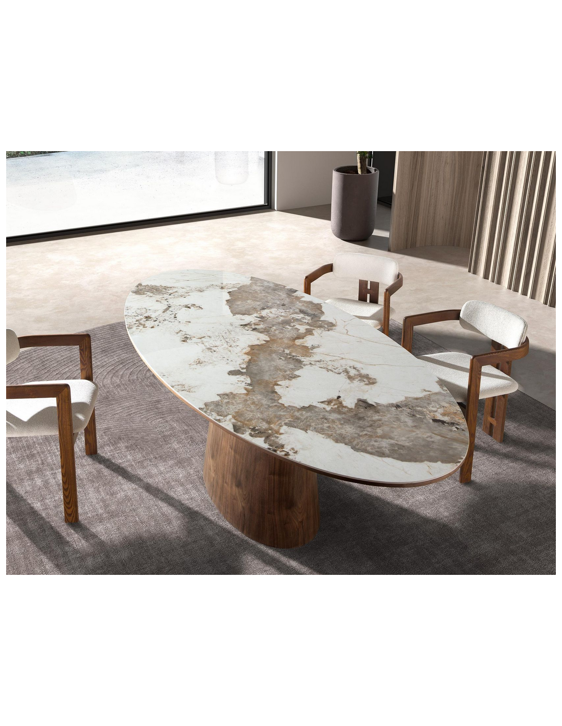 Ovalt spisebord udført i et moderne design fra Angel Cerdá. Spisebordet er fremstillet i valnøddefinér og porcelæn med hvid marmorlook. Spisebordet måler 76 cm i højden og 220 x 112 cm i bredde og dybde.