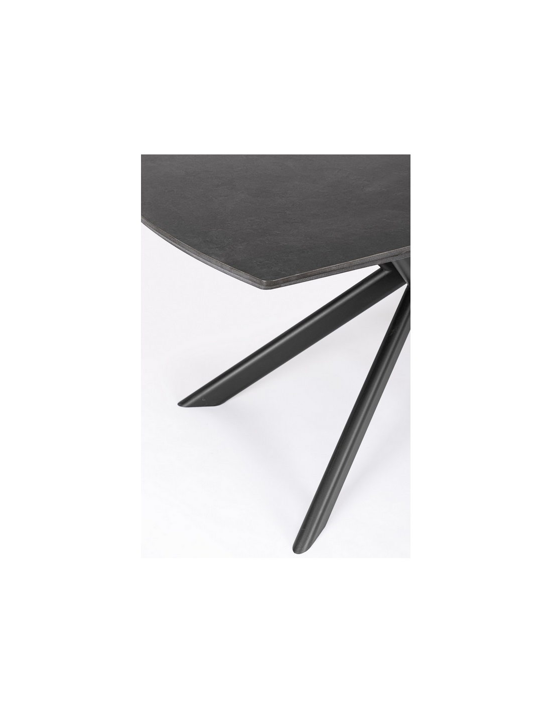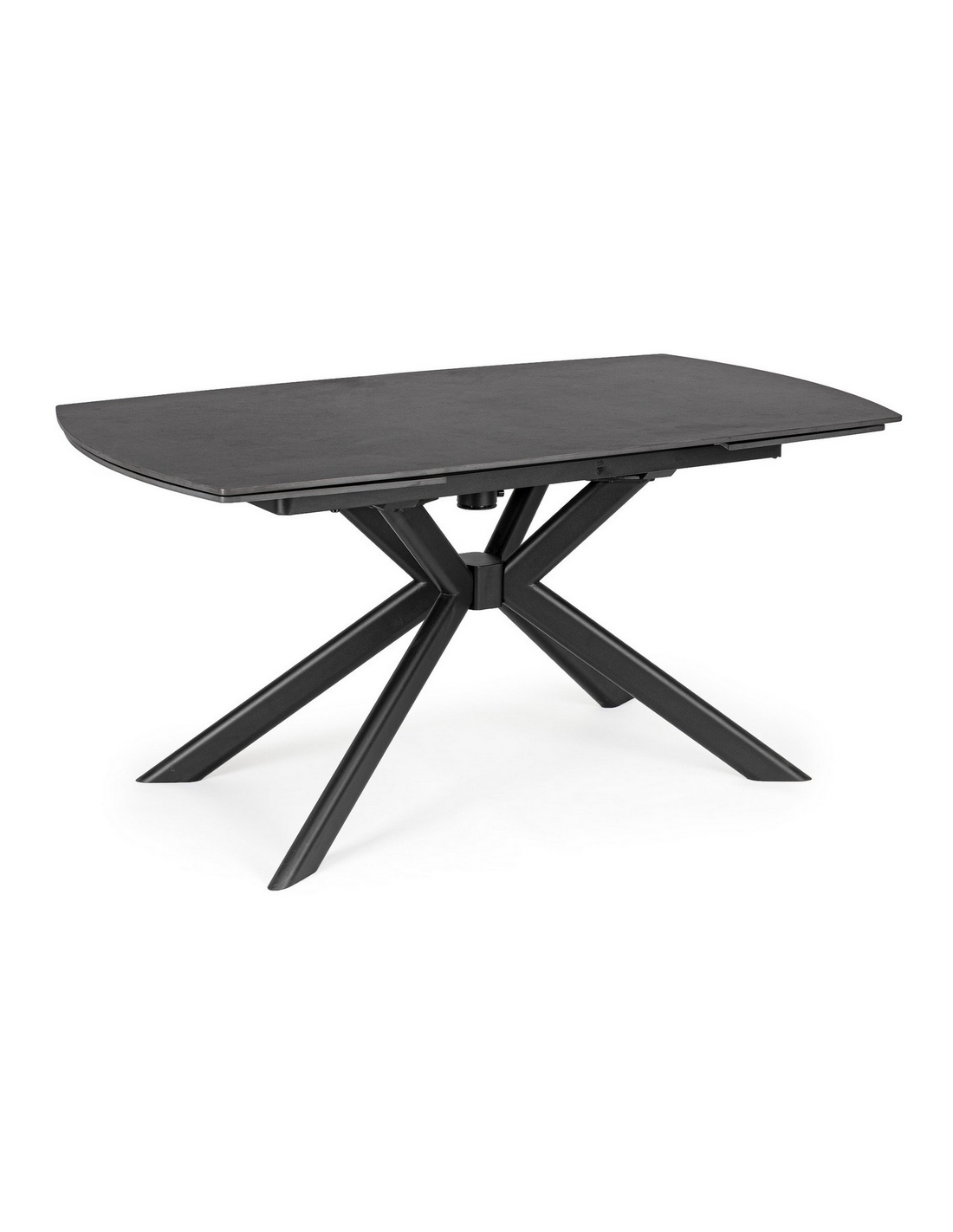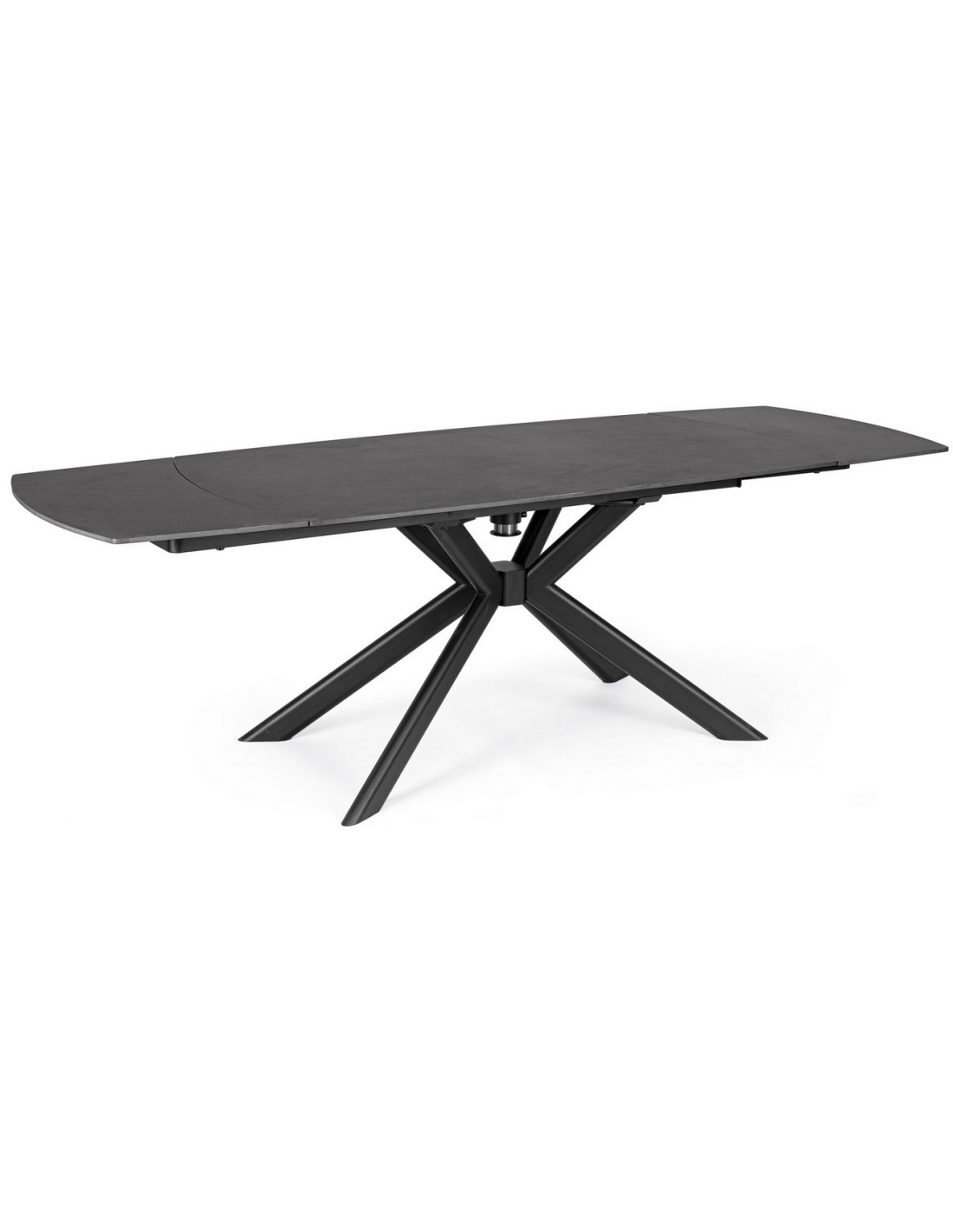 JANIKA Spisebord med udtræk, udført i et moderne design af sortlakeret stål og med bordplade i porcelæn med stengrå look. Spisebordet måler 77 cm i højden og 160 - 240 x 90 cm i bredde og dybde. Tillægspladen er under bordet når den ikke er i brug.