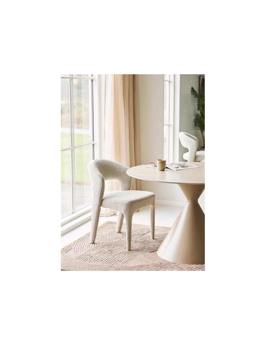 Rundt spisebord udført i et moderne design af sandfarvet stål og travertin farvet keramik. Spisebordet måler 76 cm i højden og 120 cm i diameter.