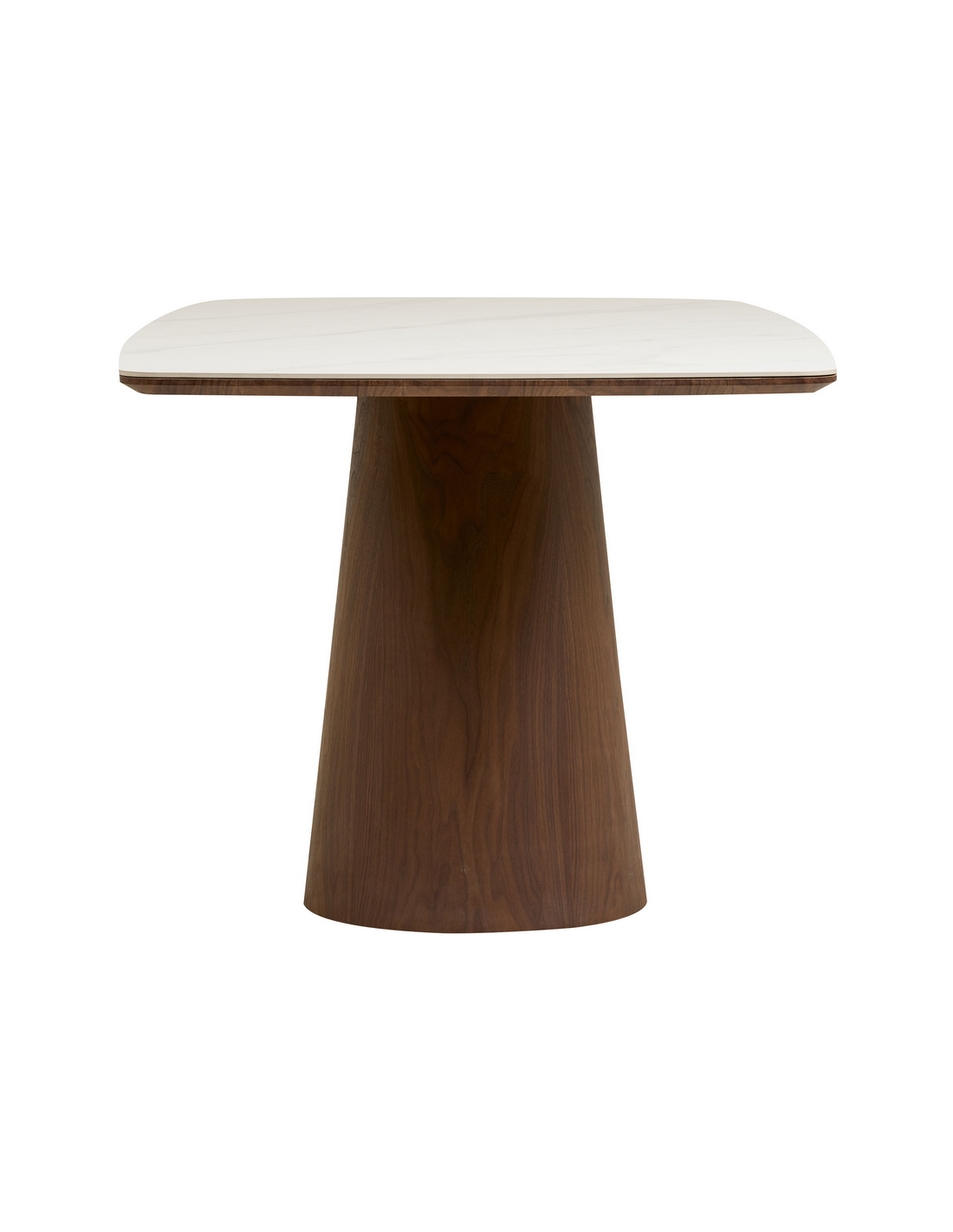 Spisebord udført i et moderne design af mørkebrun askfinér og hvid marmoriseret keramik. Spisebordet måler 76 cm i højden og 200 x 90 cm i bredde og dybde.