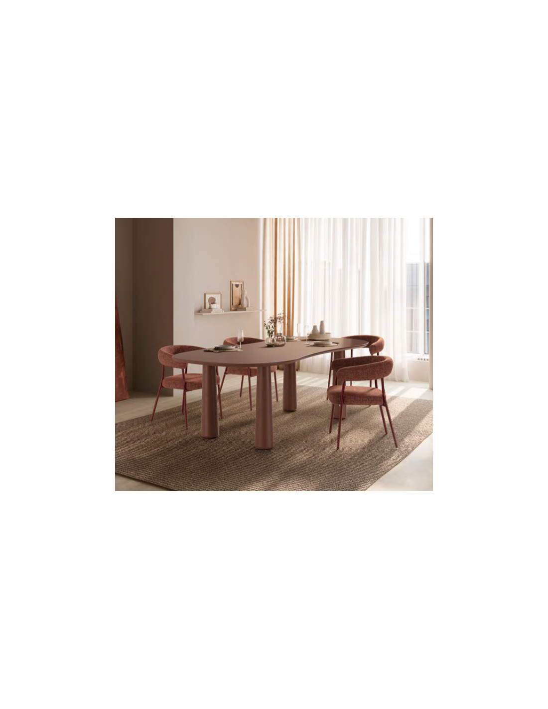 NAHIA Organisk spisebord udført i et Skandinavisk design af terracotta farvet fyrretræ og MDF. Spisebordet måler 76 cm i højden og 220 x 110 cm i bredde og dybde.