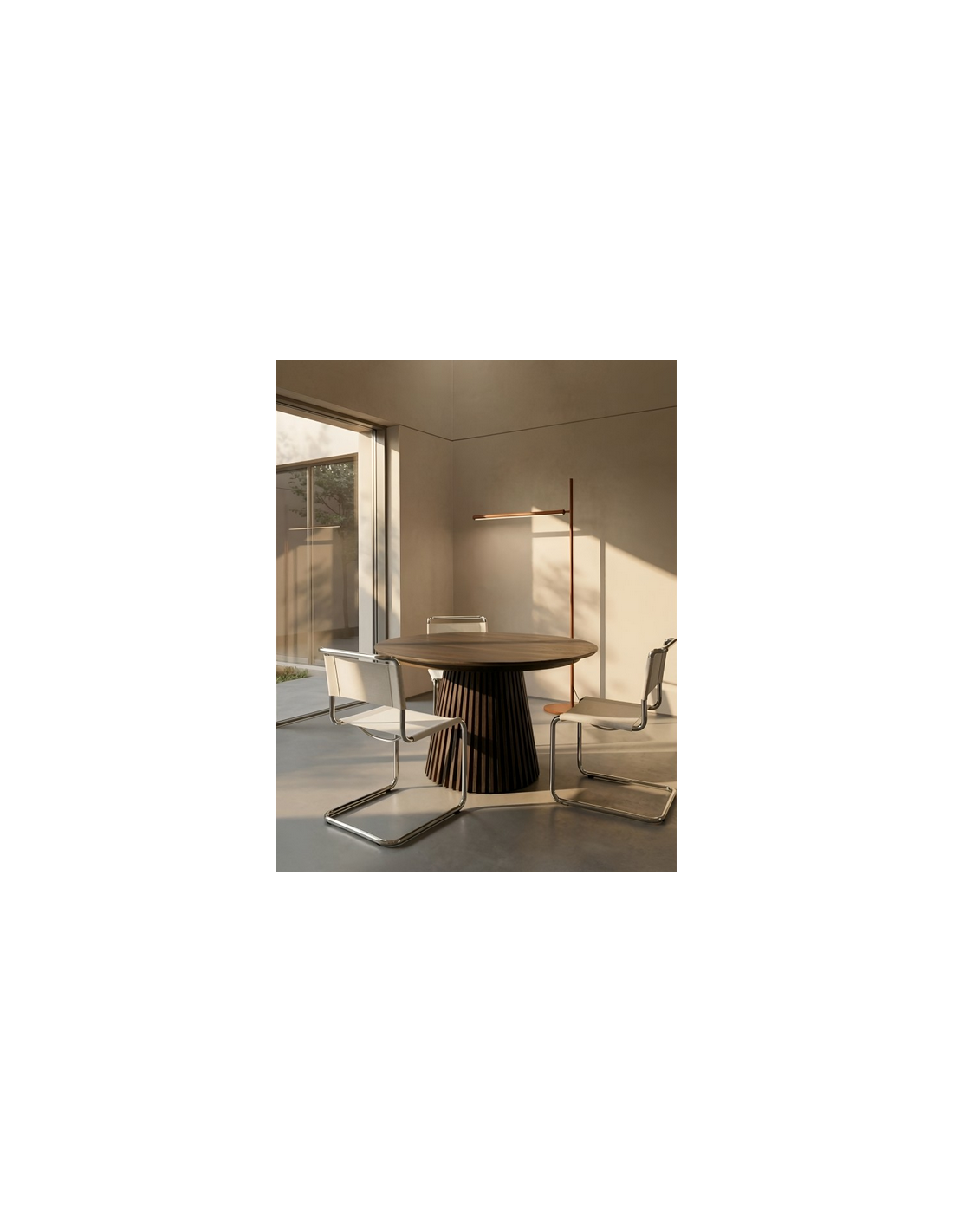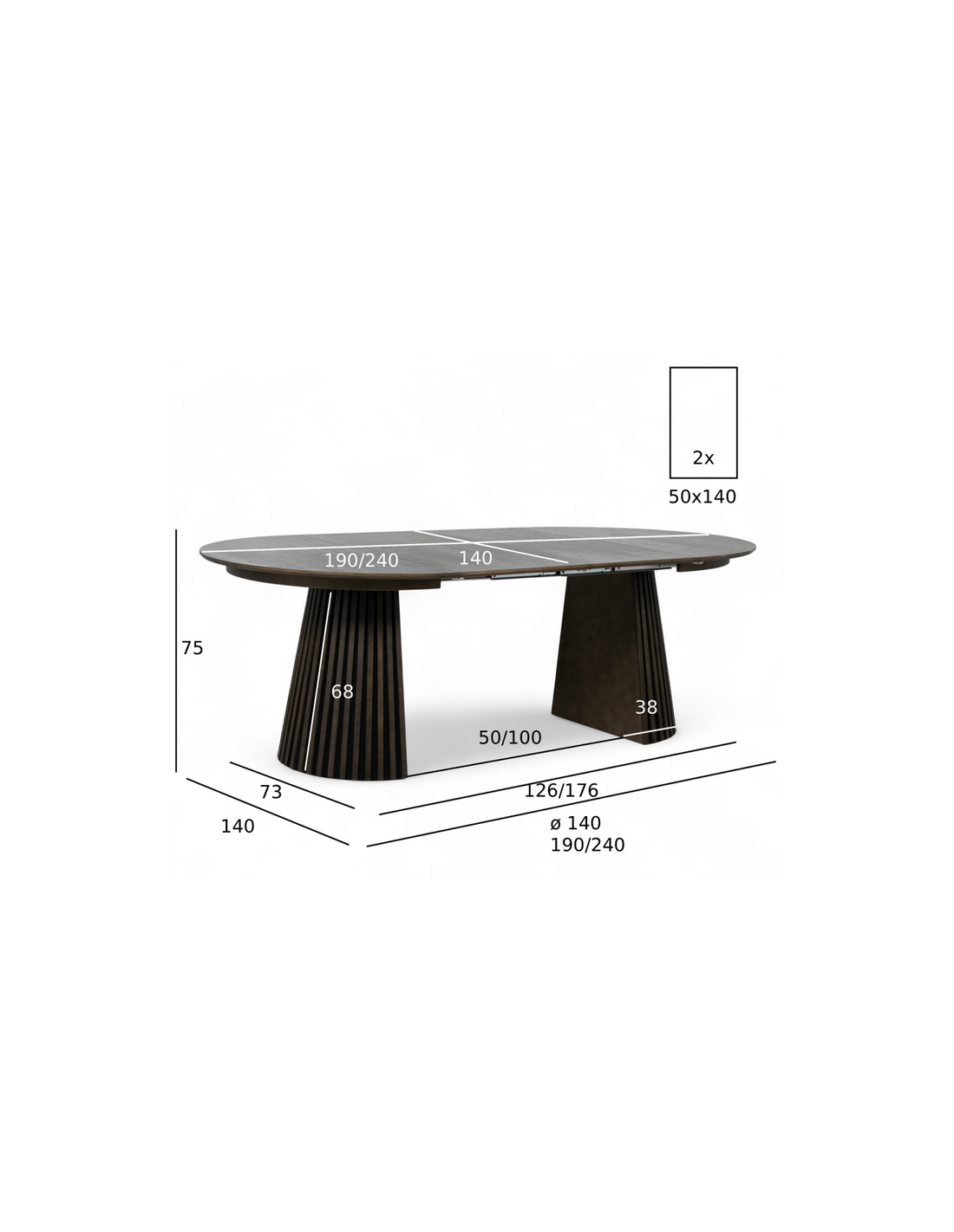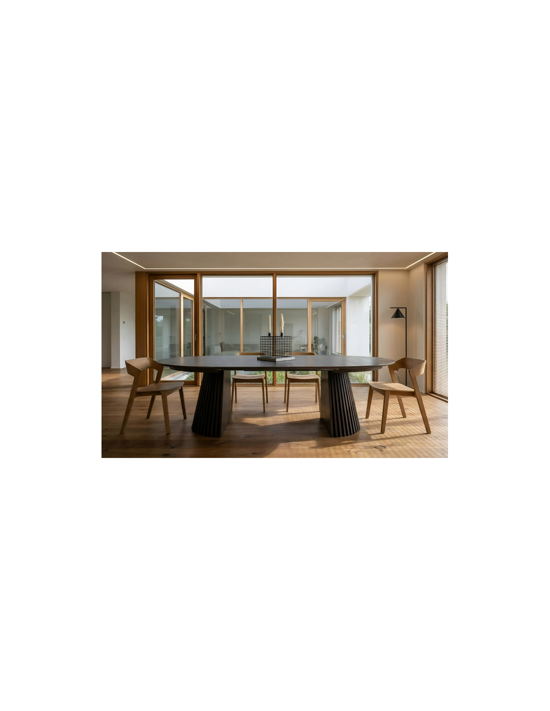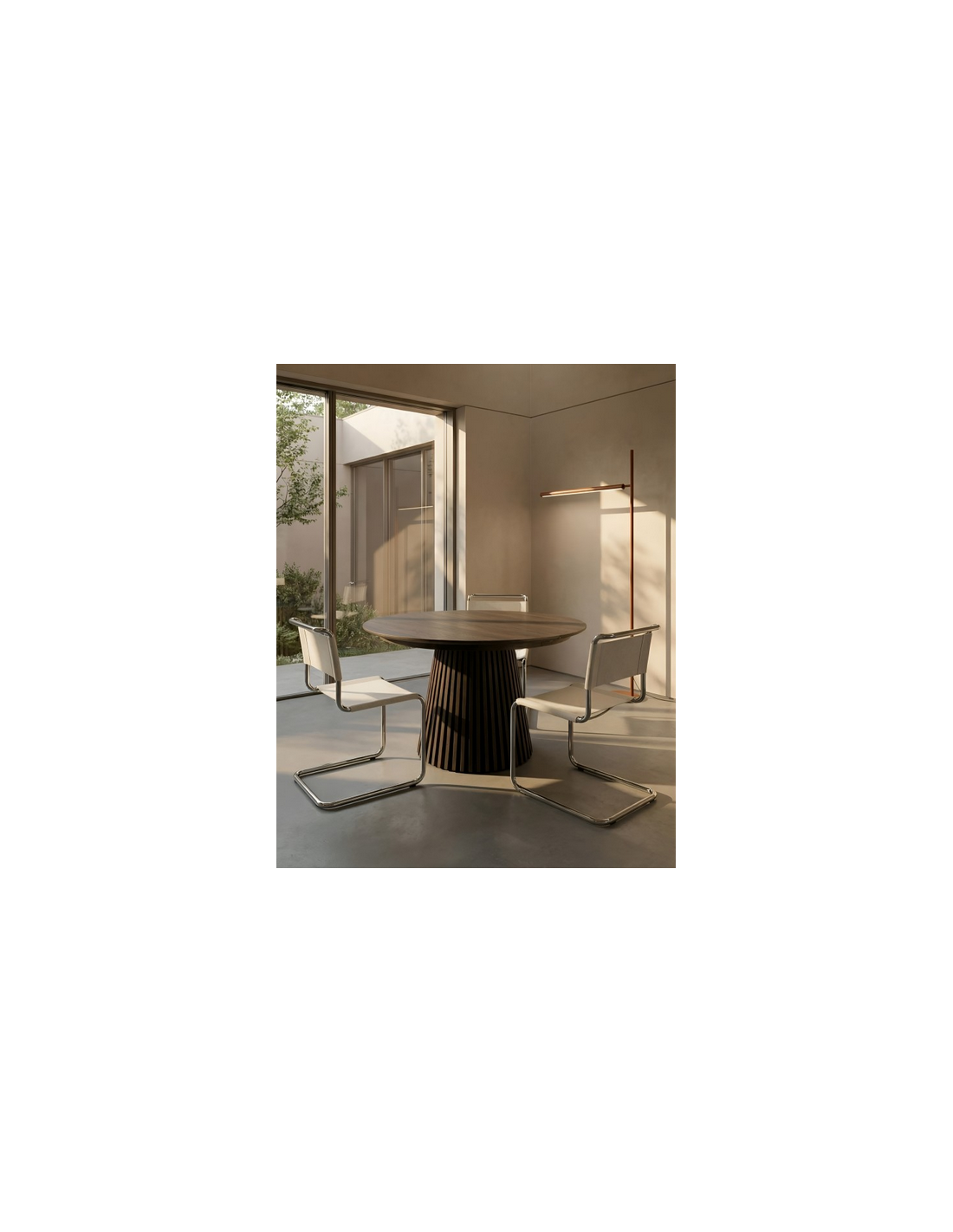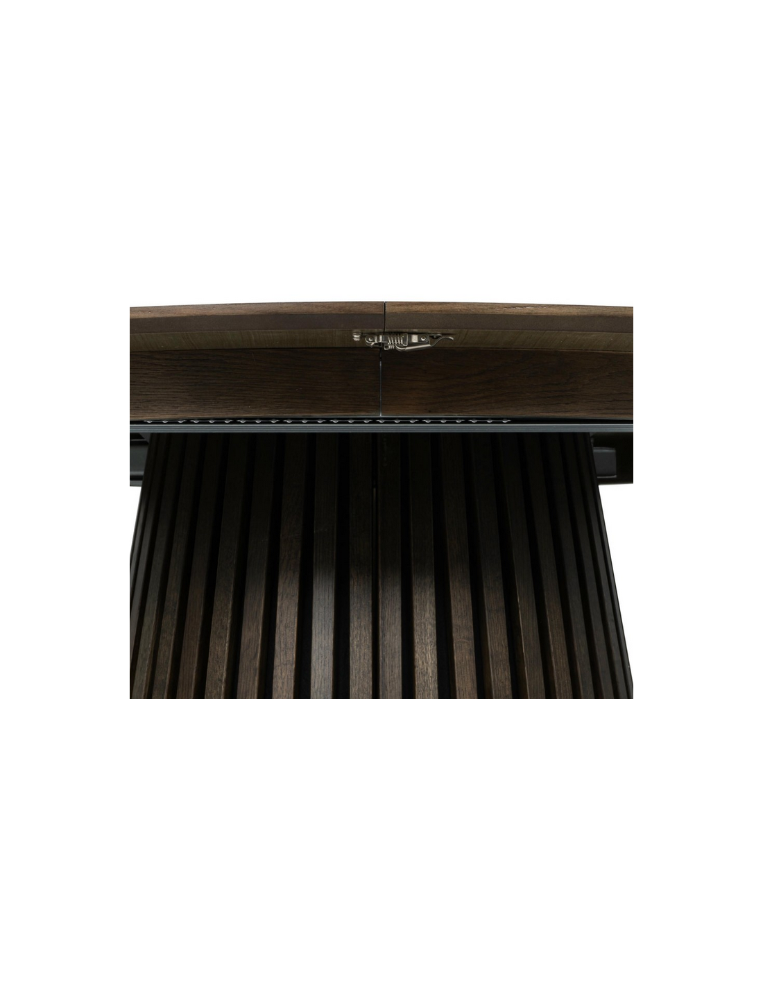 Bordets unikke fod består af stilfulde lodrette lameller, der tilfører et moderne og eksklusivt look, samtidig med at de giver stabilitet. Med den praktiske udtræksfunktion kan bordet nemt udvides, så der er plads til ekstra gæster – perfekt til både hverdag og festlige lejligheder.