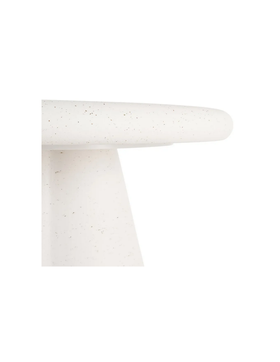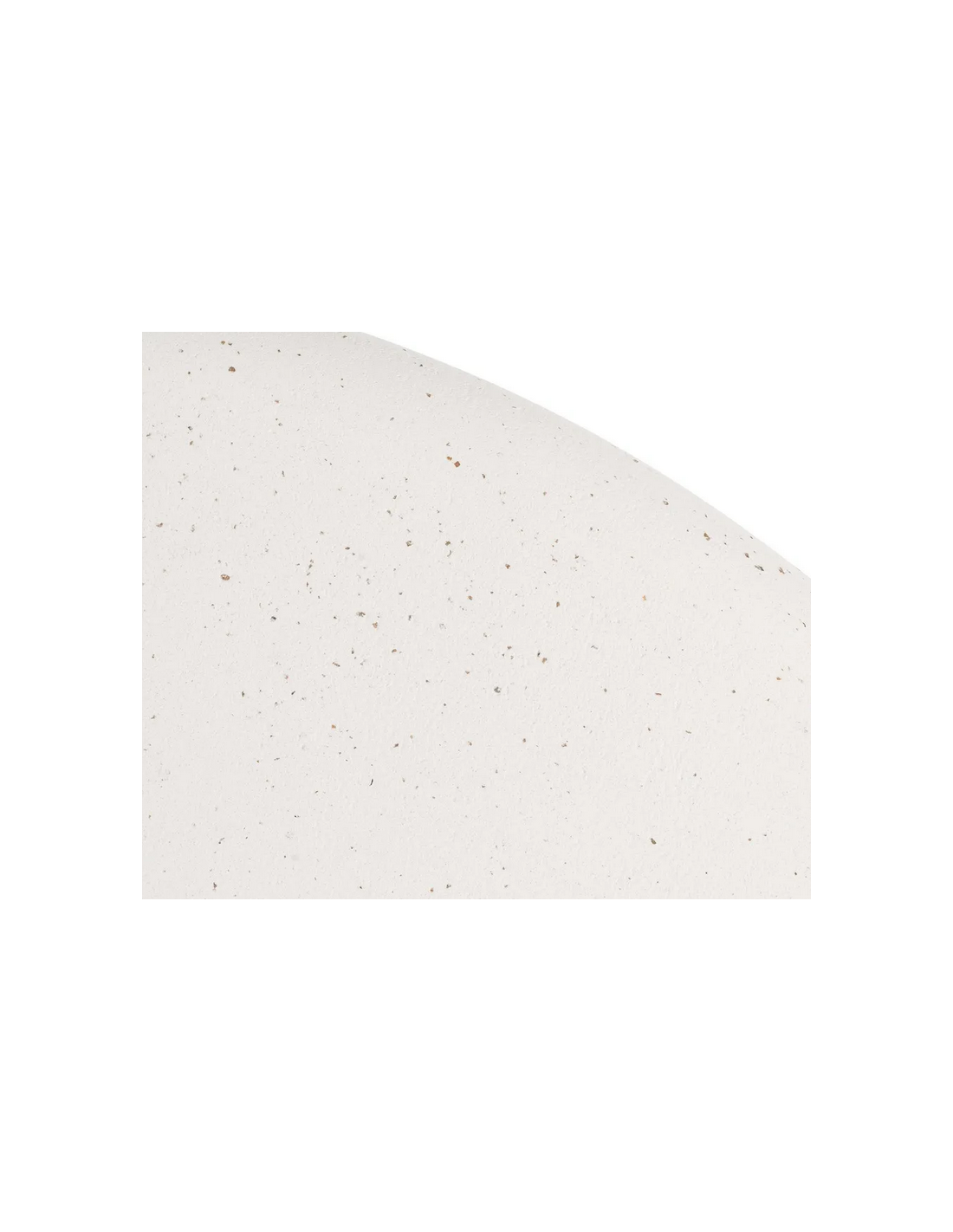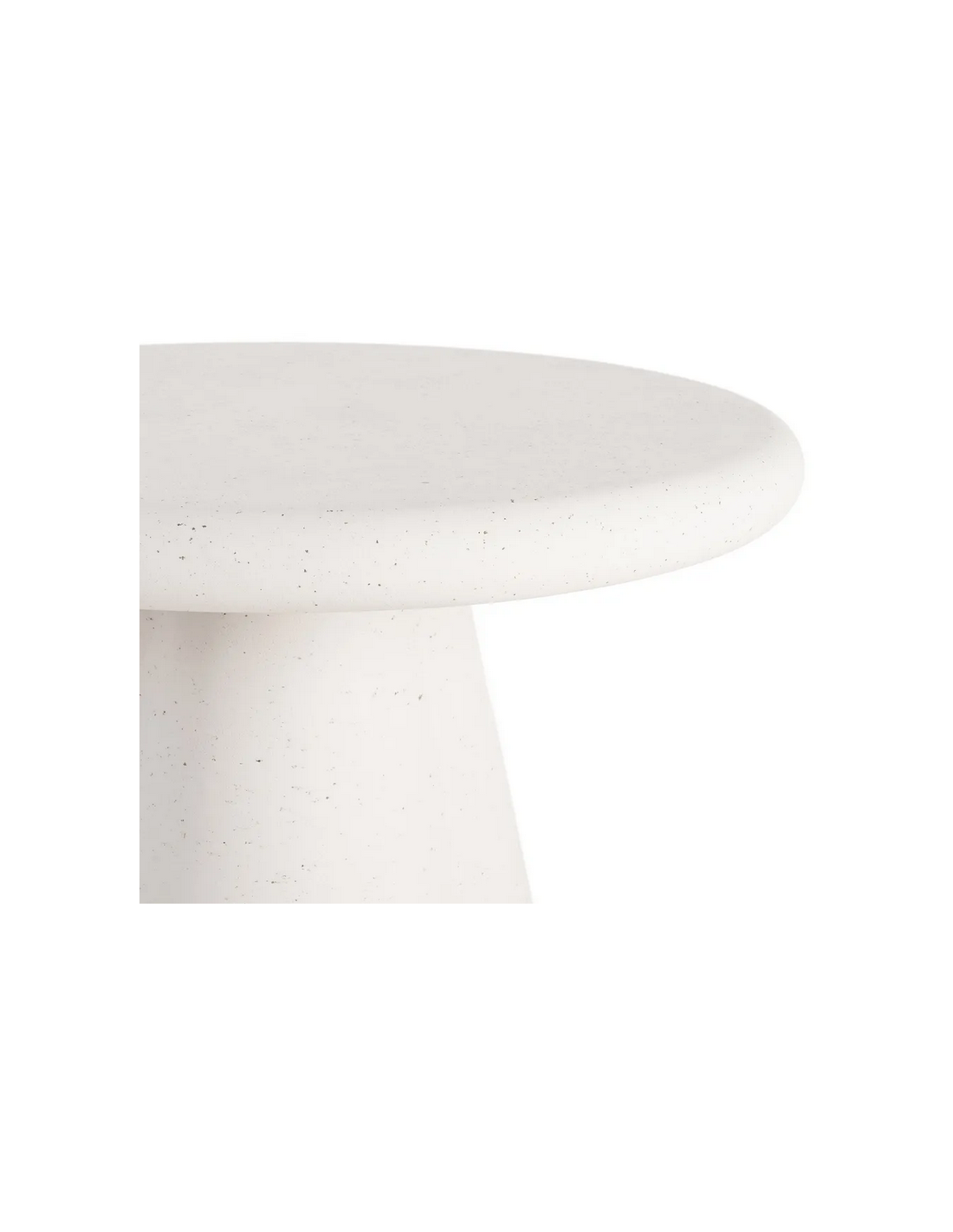 Rundt spisebord udført i et rustikt design af hvid terrazzo farvet MDF og microcement. Spisebordet måler 76 cm i højden og 120 cm i diameter.