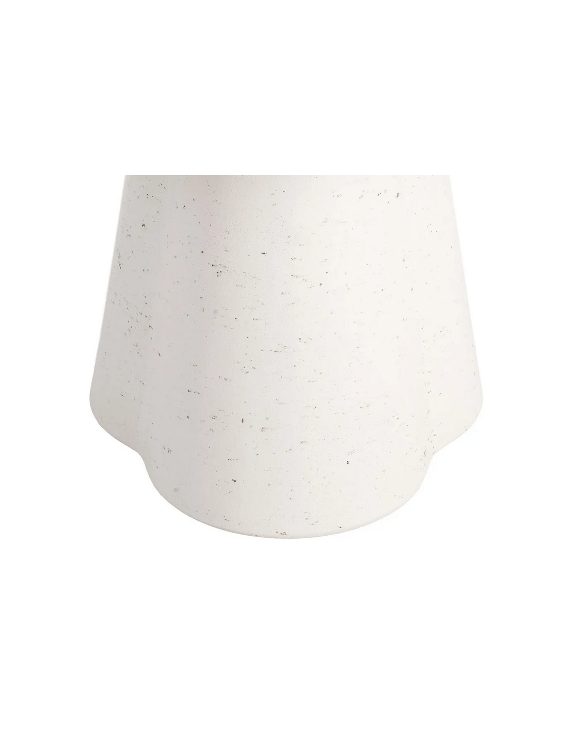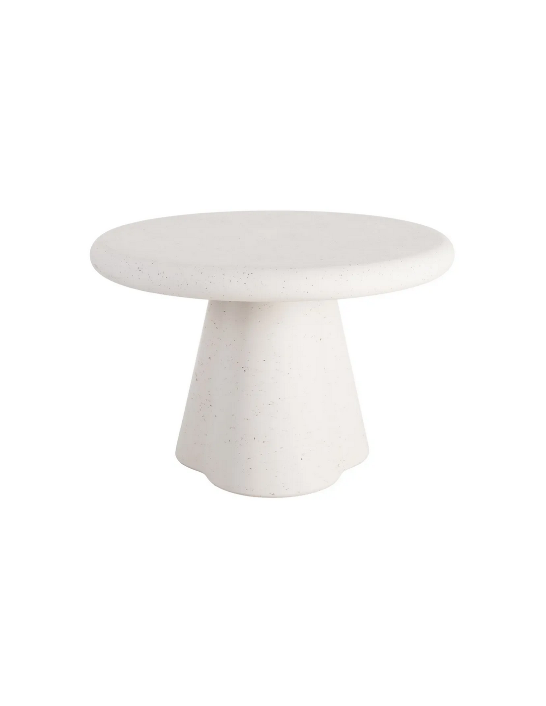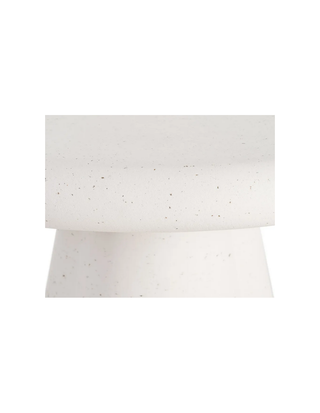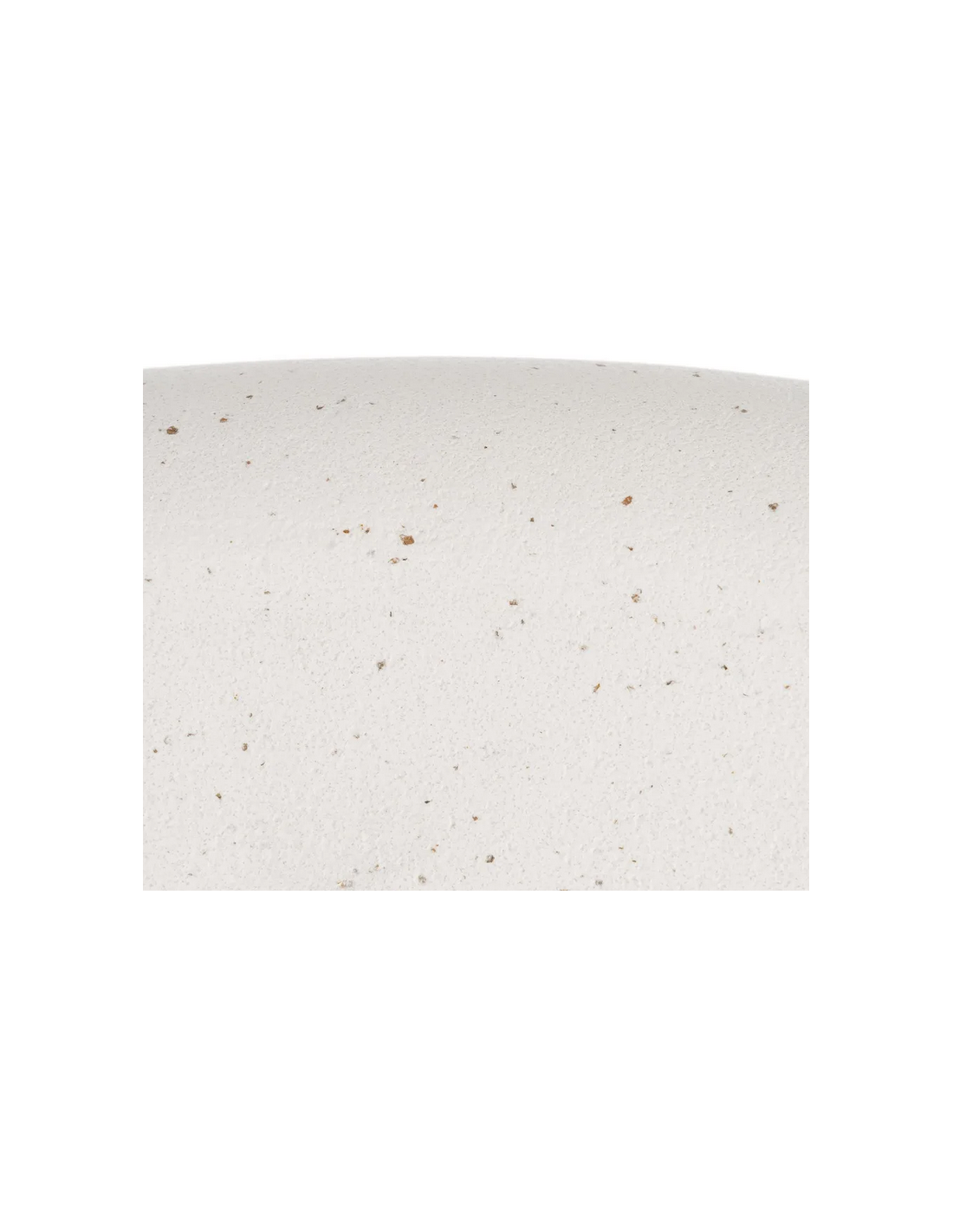 Rundt spisebord udført i et rustikt design af hvid terrazzo farvet MDF og microcement. Spisebordet måler 76 cm i højden og 120 cm i diameter.