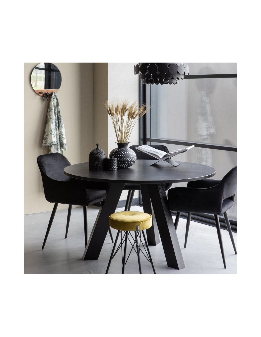 RHONDA Rundt spisebord udført i et design, fremstillet i rustik sortlakeret egetræ. Spisebordet måler 75 cm i højden og 129 cm i diameter. Frihøjden under bordpladen er 72 cm.