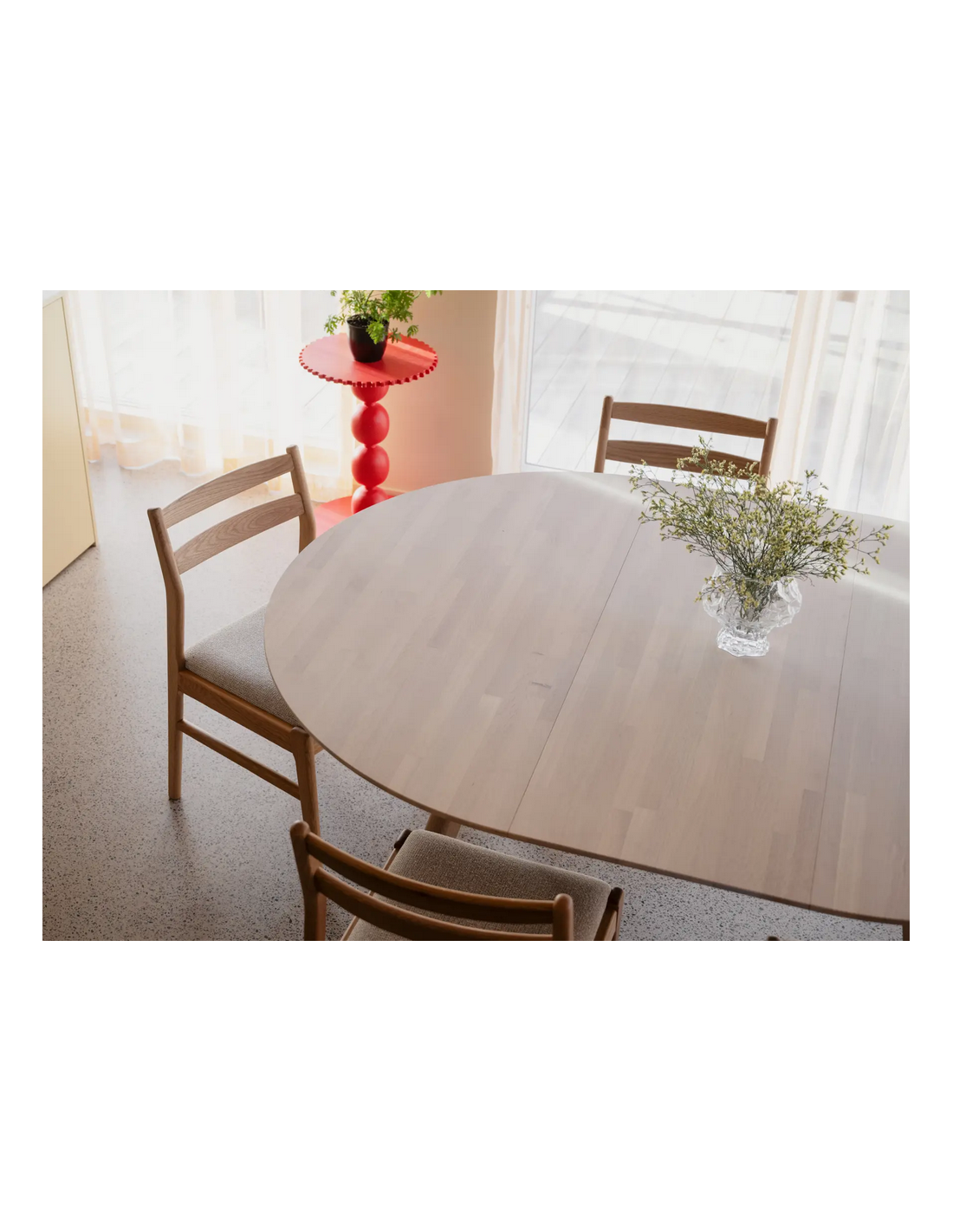 Clapperton tillægsplade til de runde Clapperton spiseborde fra Svenske Rowico Home, udført i et moderne og Skandinavisk design af white wash egetræ. Tillægspladen måler 50 x 140 cm i bredde og dybde.