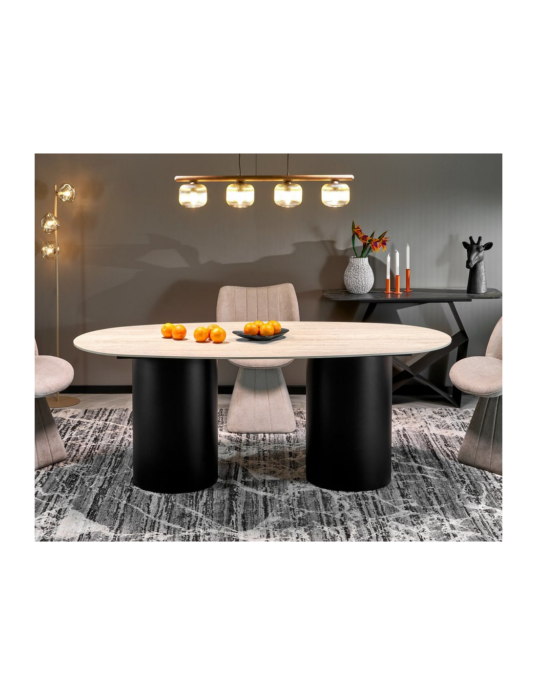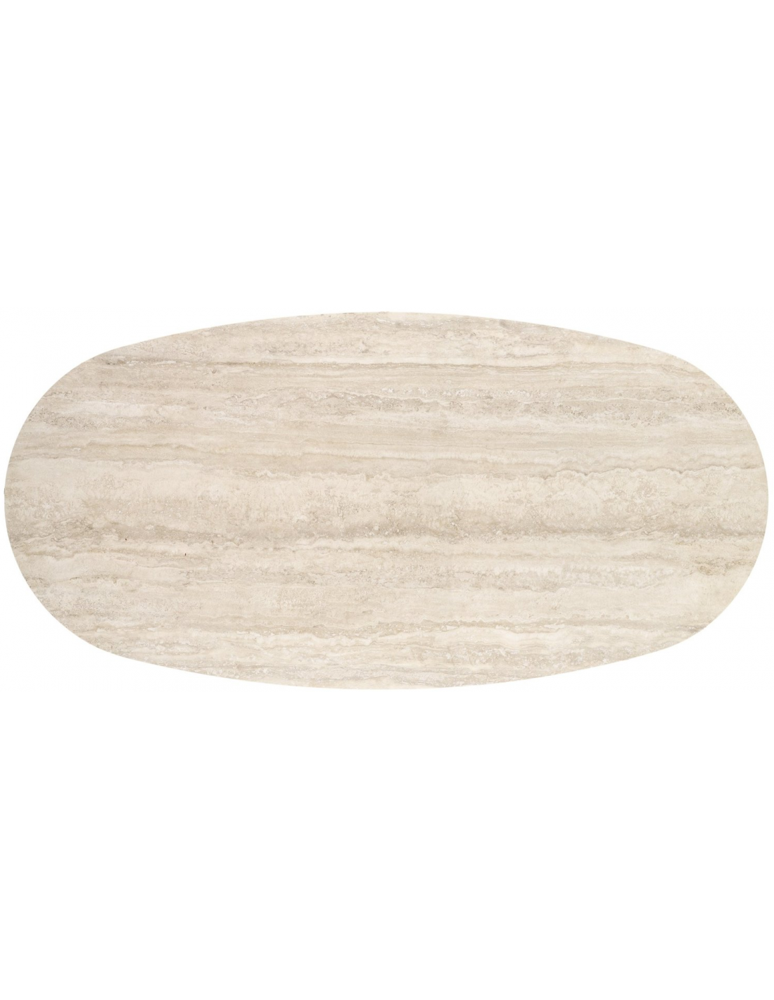 Ovalt spisebord udført i et moderne design af mat sort pulverlakeret stål og med bordplade i travertinfarvet keramisk sten. Spisebordet måler 77 cm i højden og 200 x 100 cm i bredde og dybde.