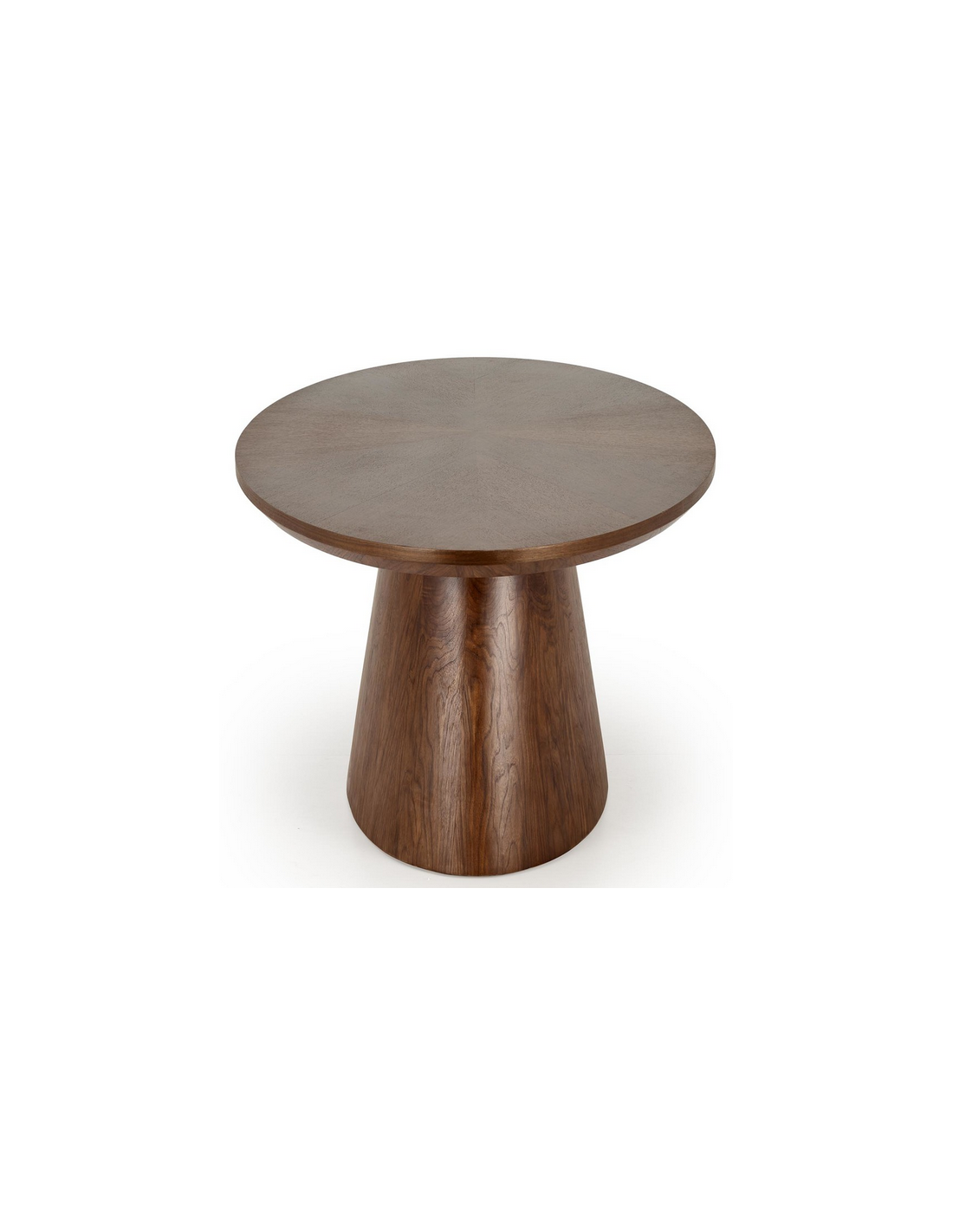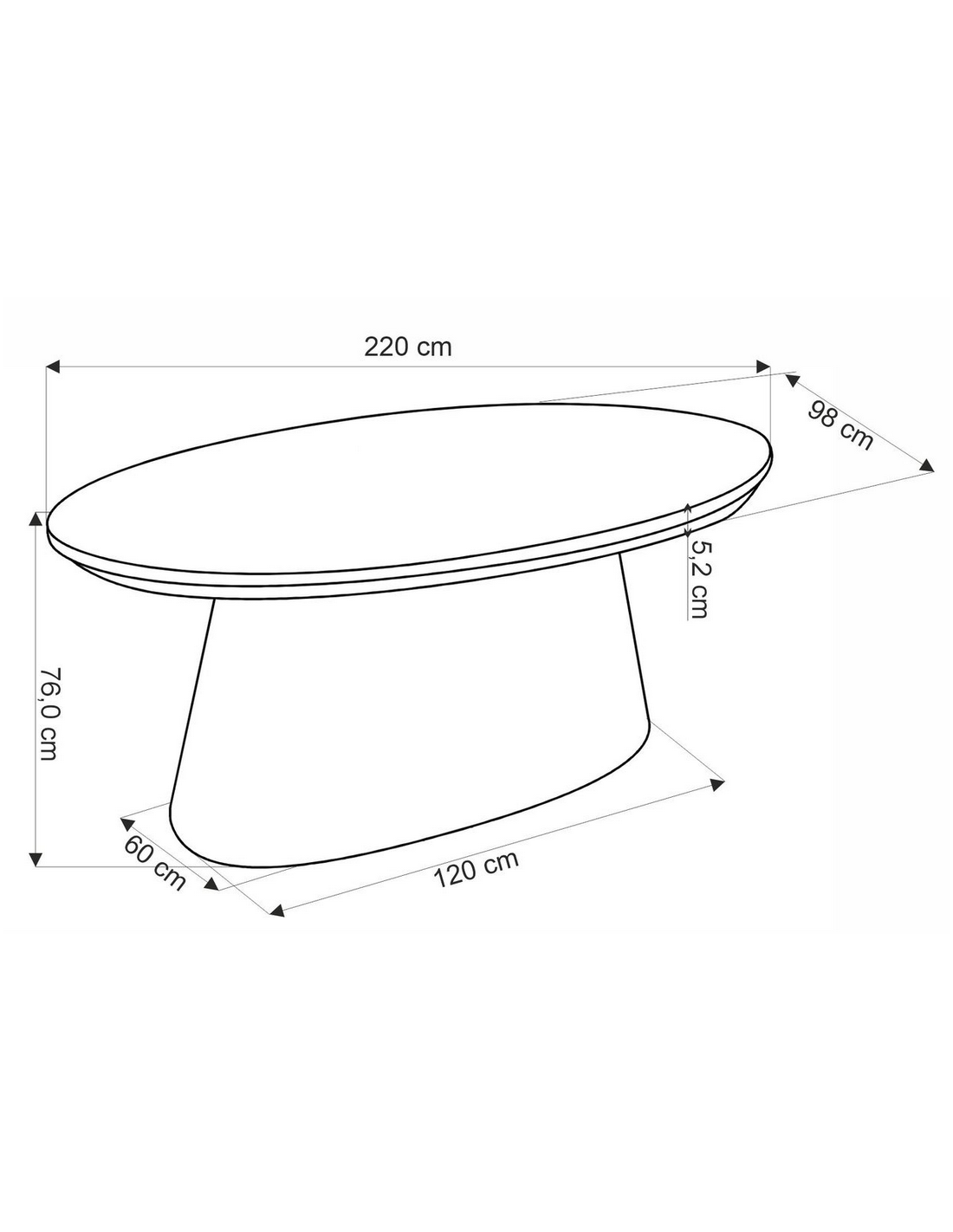 Ovalt spisebord udført i et moderne design af valnøddefinér og MDF. Spisebordet måler 76 cm i højden og 220 x 98 cm i bredde og dybde.