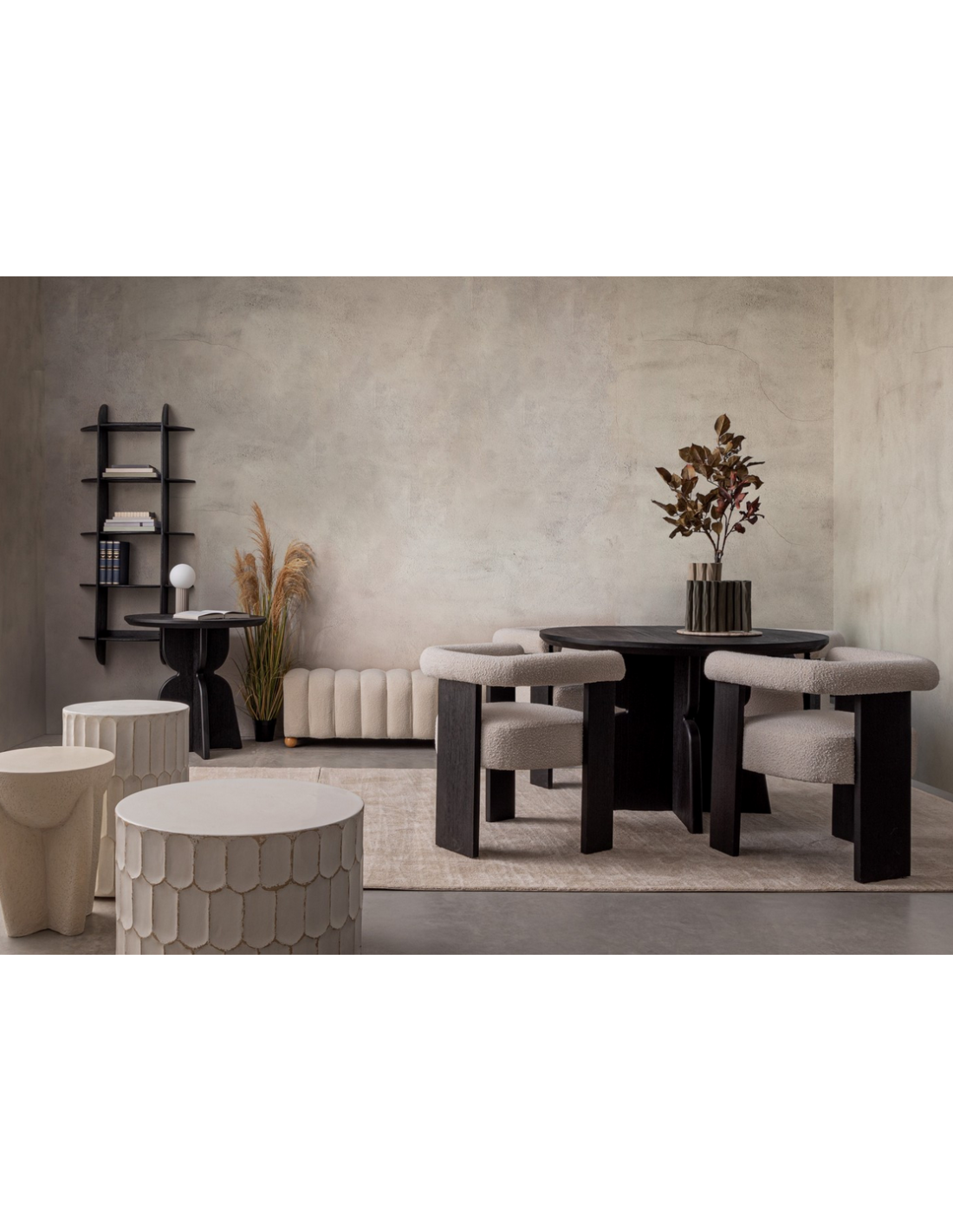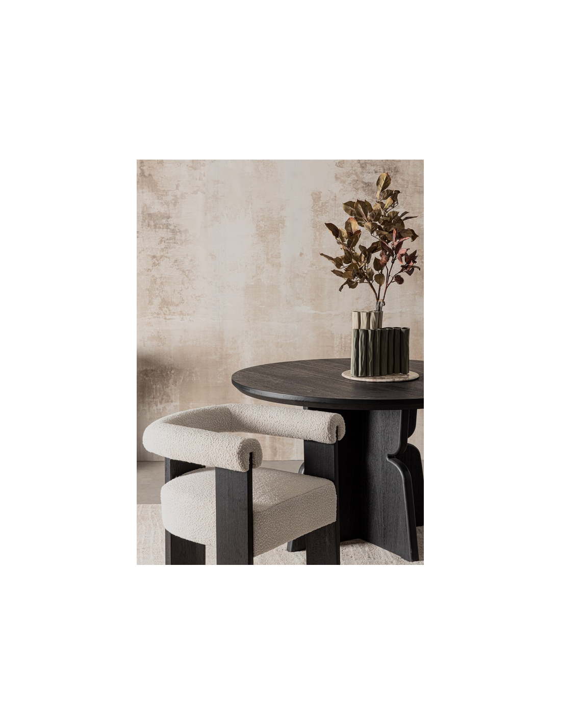 Agape spisebordsstol udført i et moderne design, fremstillet i sortlakeret fyrretræ og naturfarvet polyester med bouclé effekt. Spisebordsstolen måler 71 cm i højden over ryggen og har en siddehøjde på 50 cm.