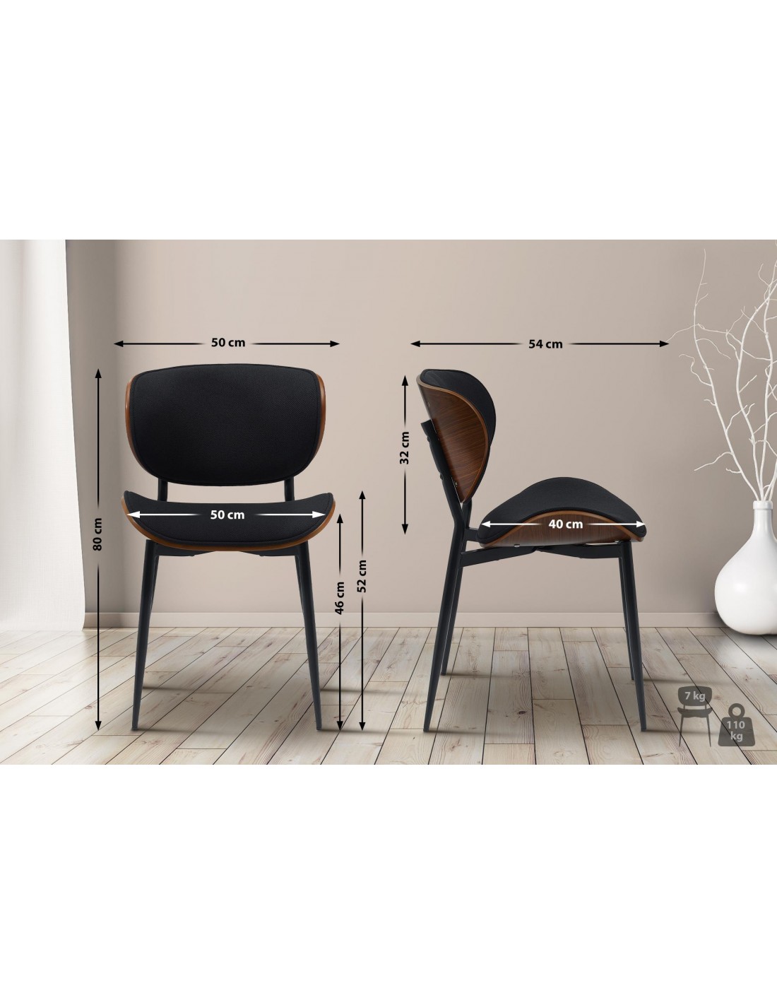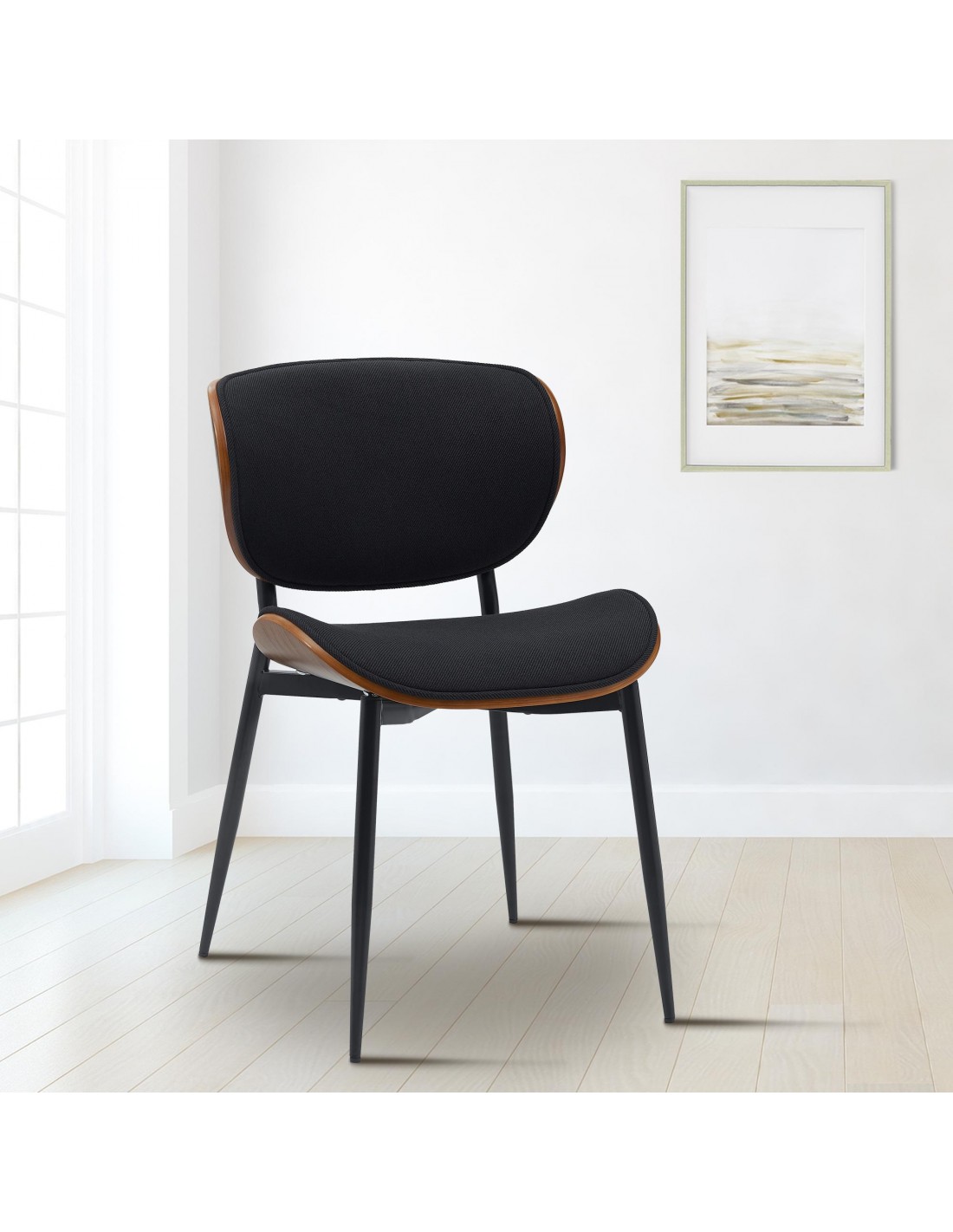 Spisebordsstol udført i et moderne og komfortabelt design, fremstillet med sæde i sort polyester og valnøddefarvet finér. Stolen måler 80 cm i højden over ryggen og med en siddehøjde på 46 cm.