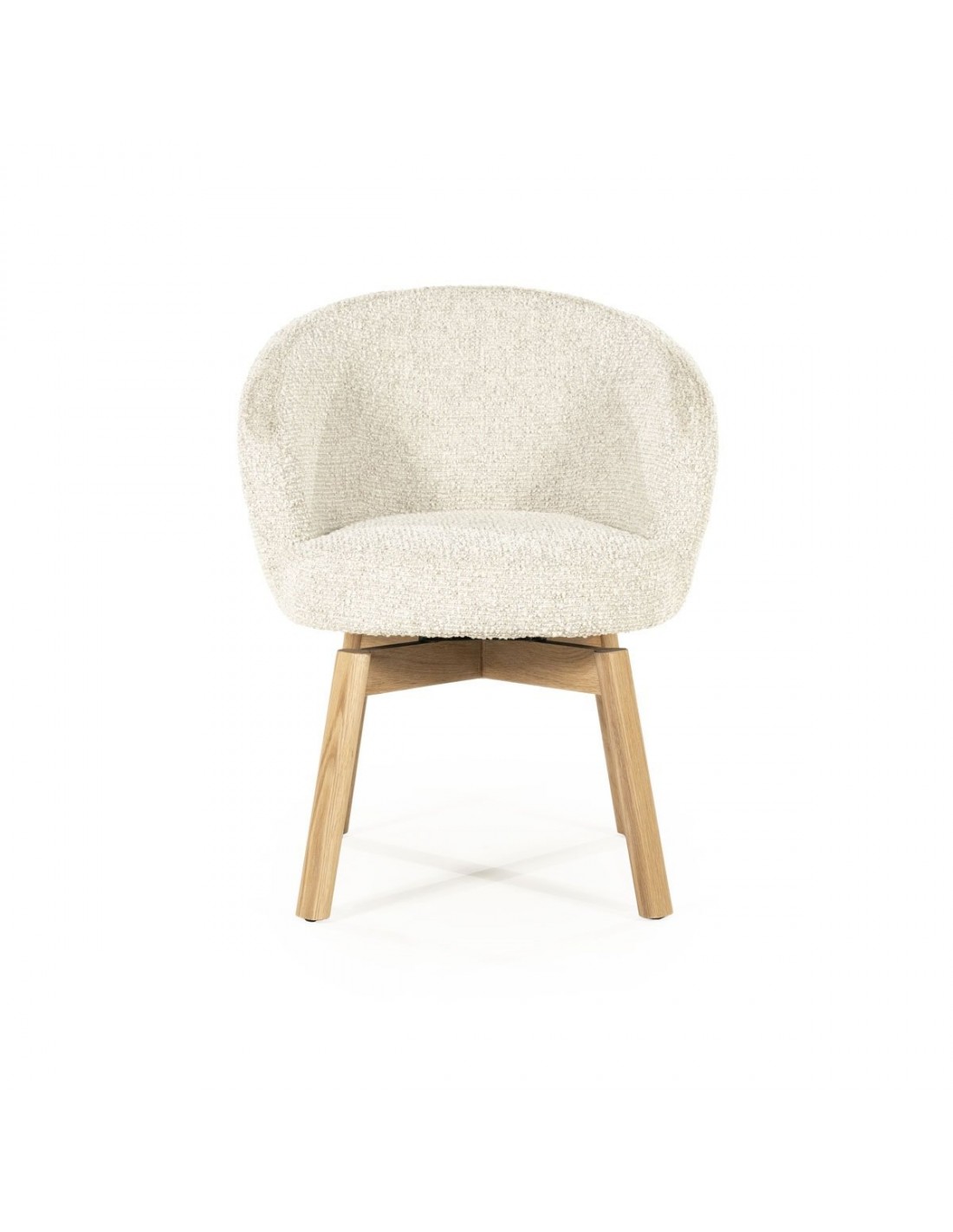 LIVIA Spisebordsstol med armlæn og drejefod, udført i et moderne design af egetræ og beige bouclé polyester. Stolen måler 80 cm over ryggen og med en siddehøjde på 50 cm.