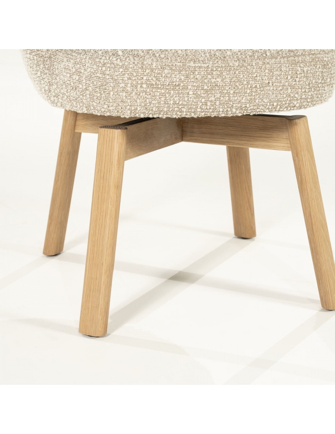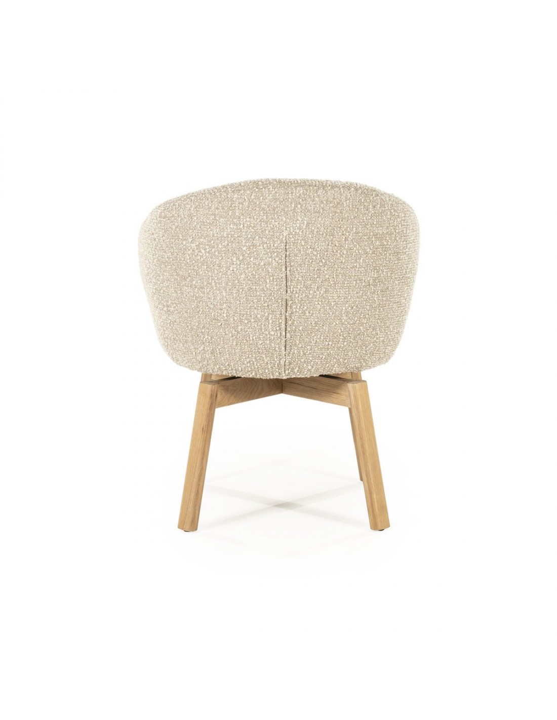 LIVIA Spisebordsstol med armlæn og drejefod, udført i et moderne design af egetræ og taupefarvet bouclé polyester. Stolen måler 80 cm over ryggen og med en siddehøjde på 50 cm.