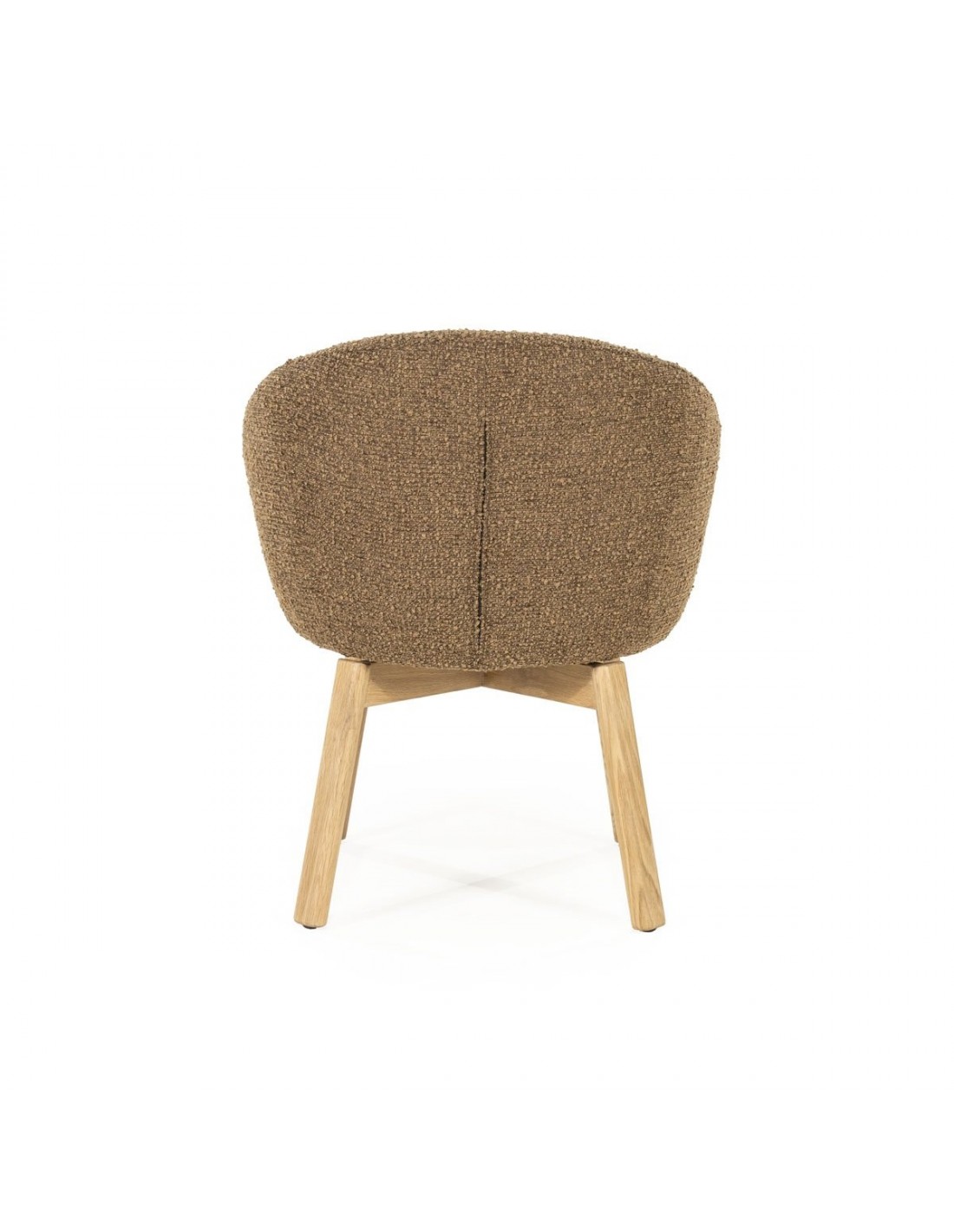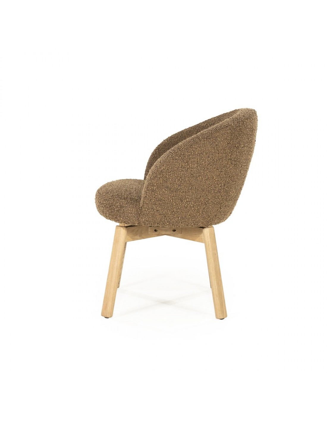 LIVIA Spisebordsstol med armlæn og drejefod, udført i et moderne design af egetræ og brun bouclé polyester. Stolen måler 80 cm over ryggen og med en siddehøjde på 50 cm.