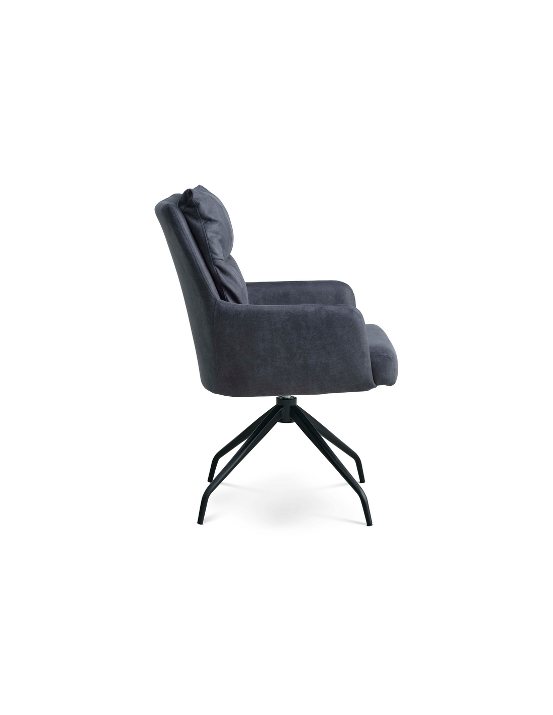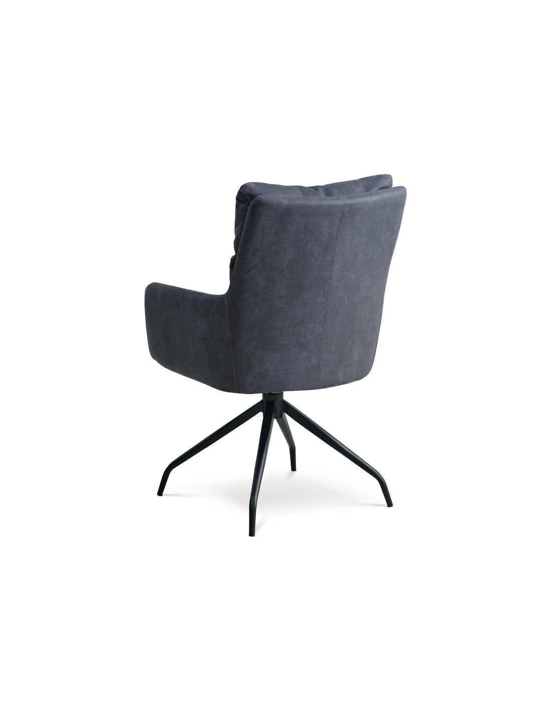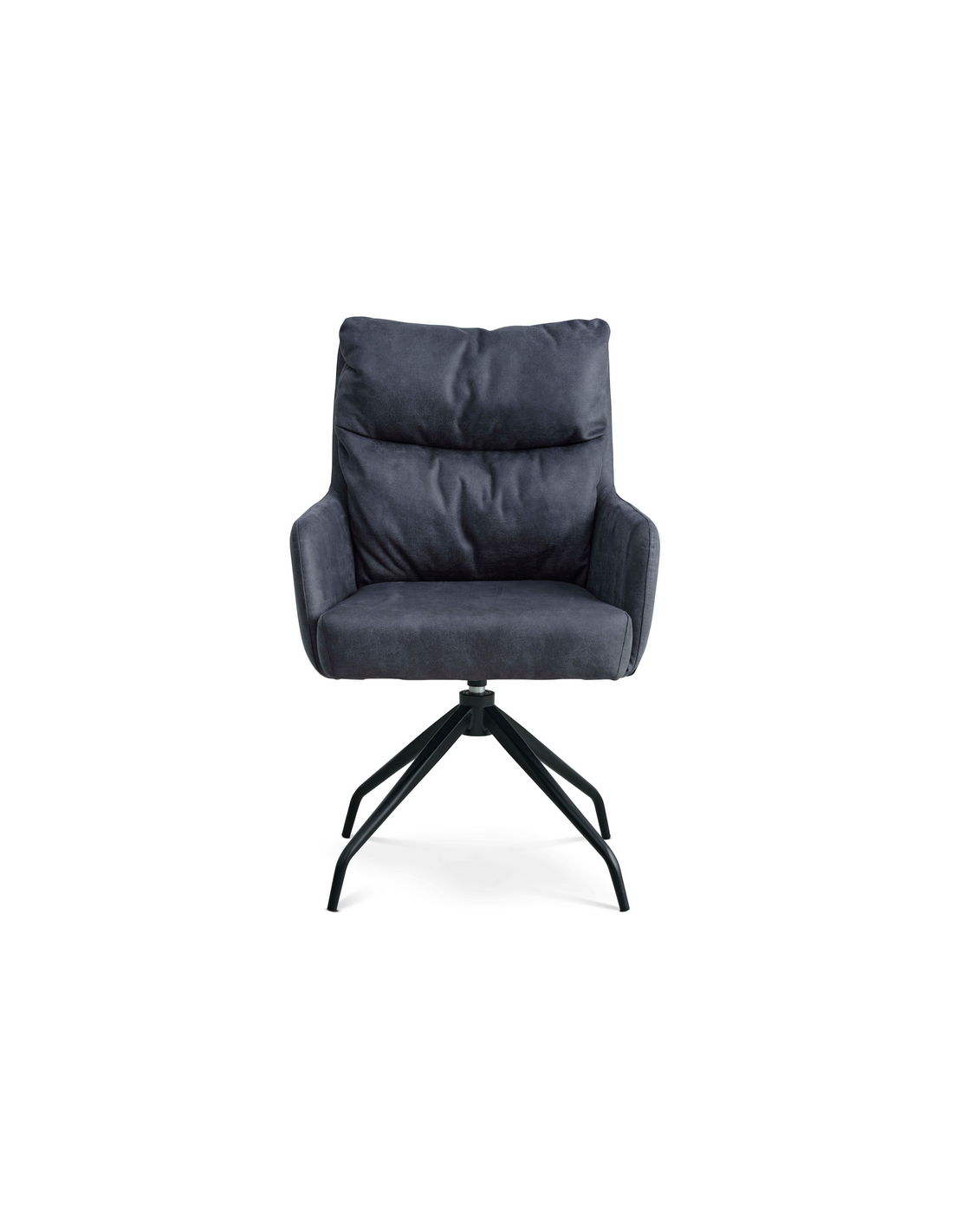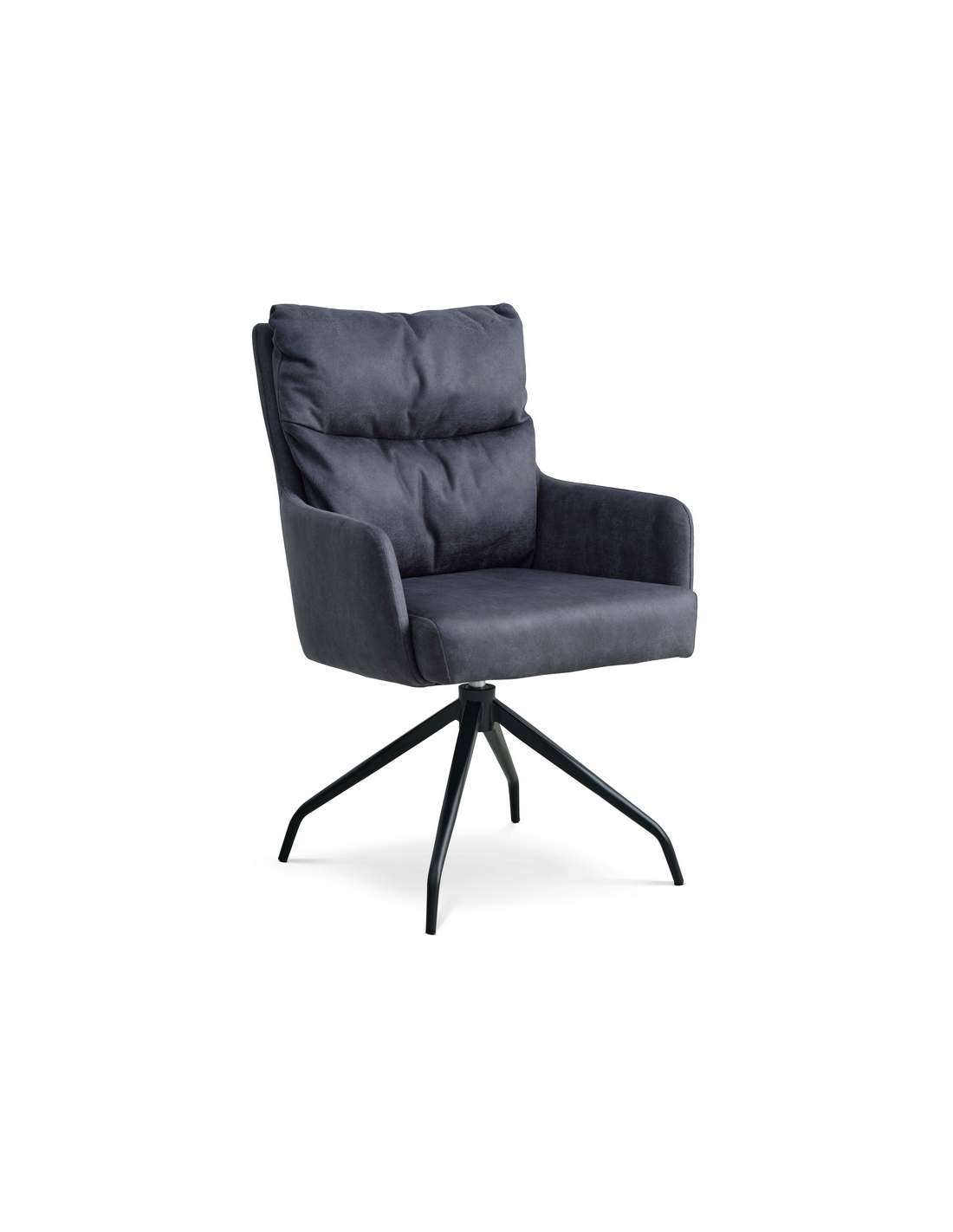 LOTUS Spisebordsstol med armlæn og drejefod, udført i et moderne design fremstillet med sæde i vintage mørkeblå microlæder og stel i sortlakeret metal. Stolen måler 91,5 cm i højden over ryggen og med siddehøjde på 51,5 cm. Stellet er drejbart 180 grader med auto-return.