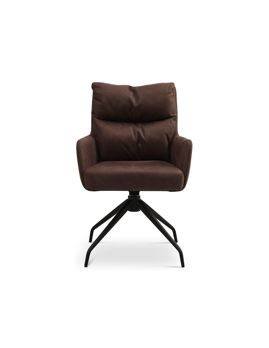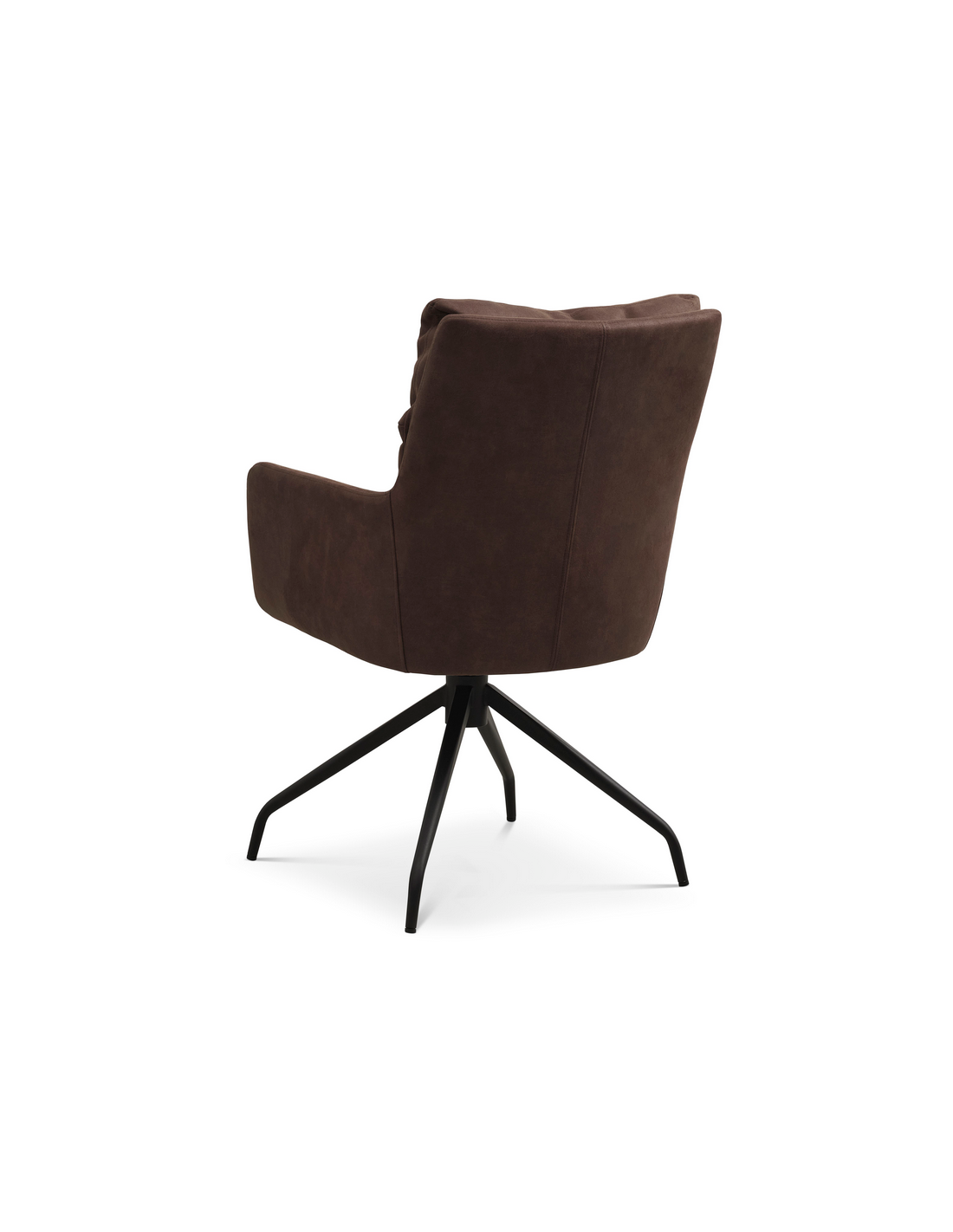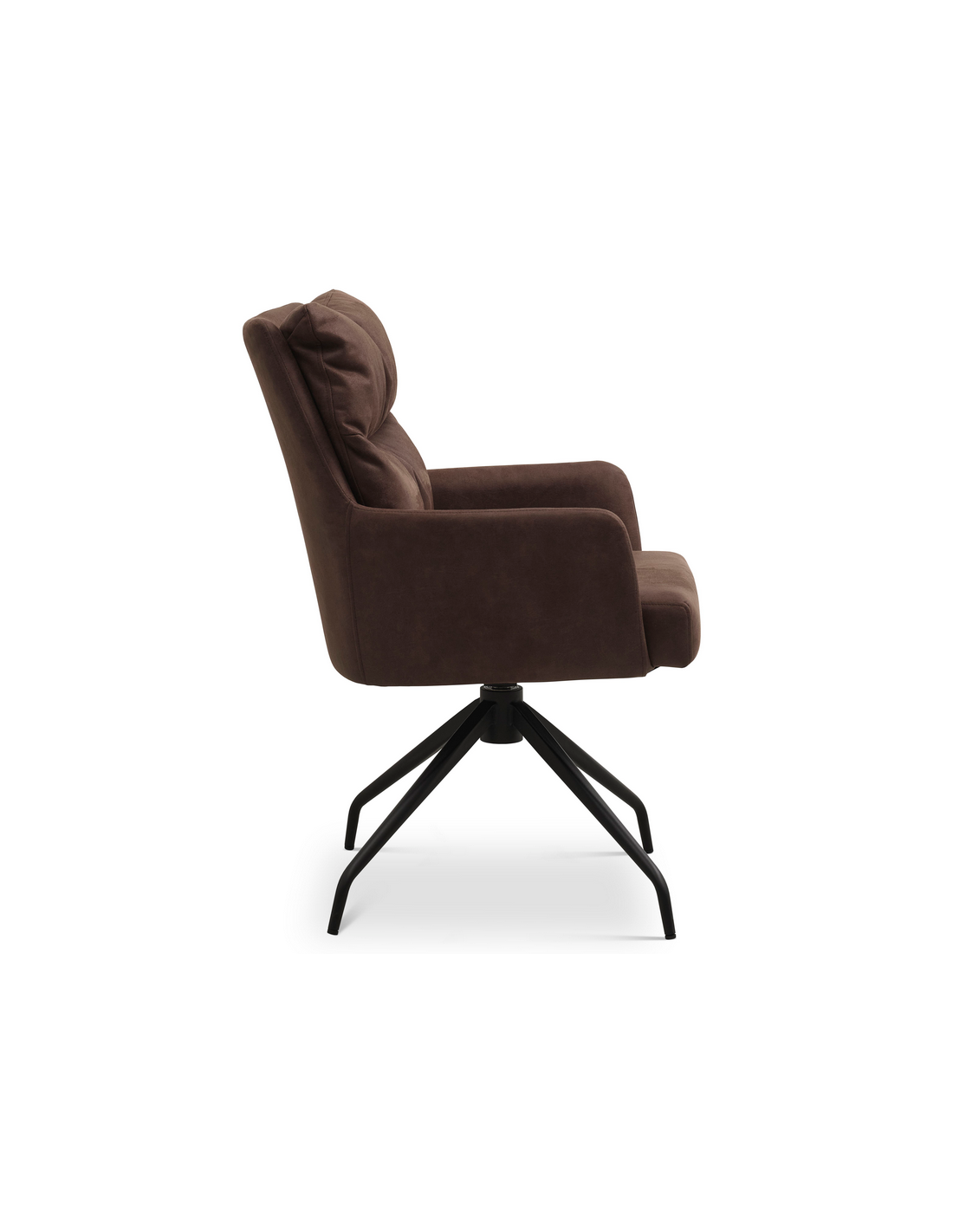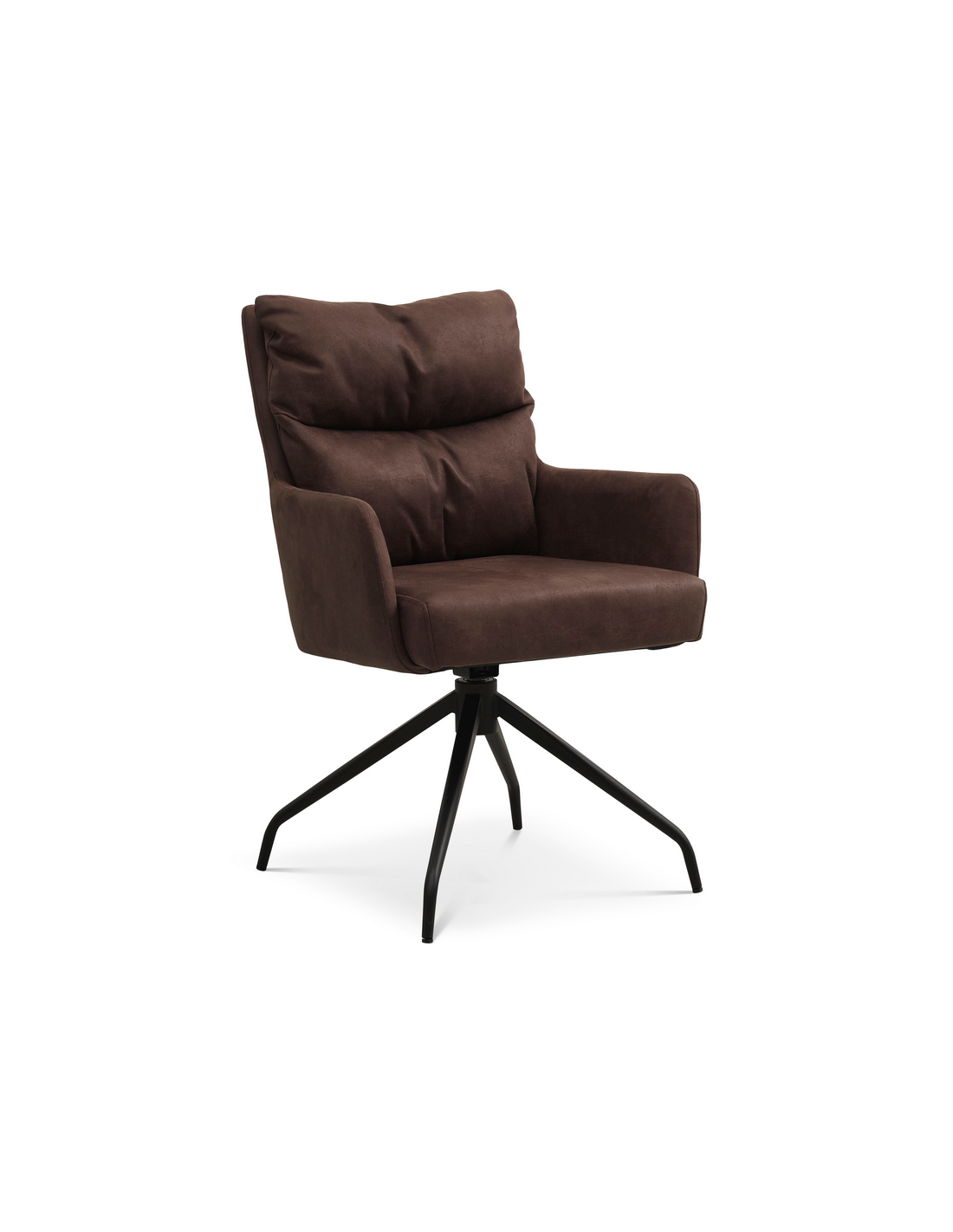 LOTUS Spisebordsstol med armlæn og drejefod, udført i et moderne design fremstillet med sæde i vintage brun microlæder og stel i sortlakeret metal. Stolen måler 91,5 cm i højden over ryggen og med siddehøjde på 51,5 cm. Stellet er drejbart 180 grader med auto-return.