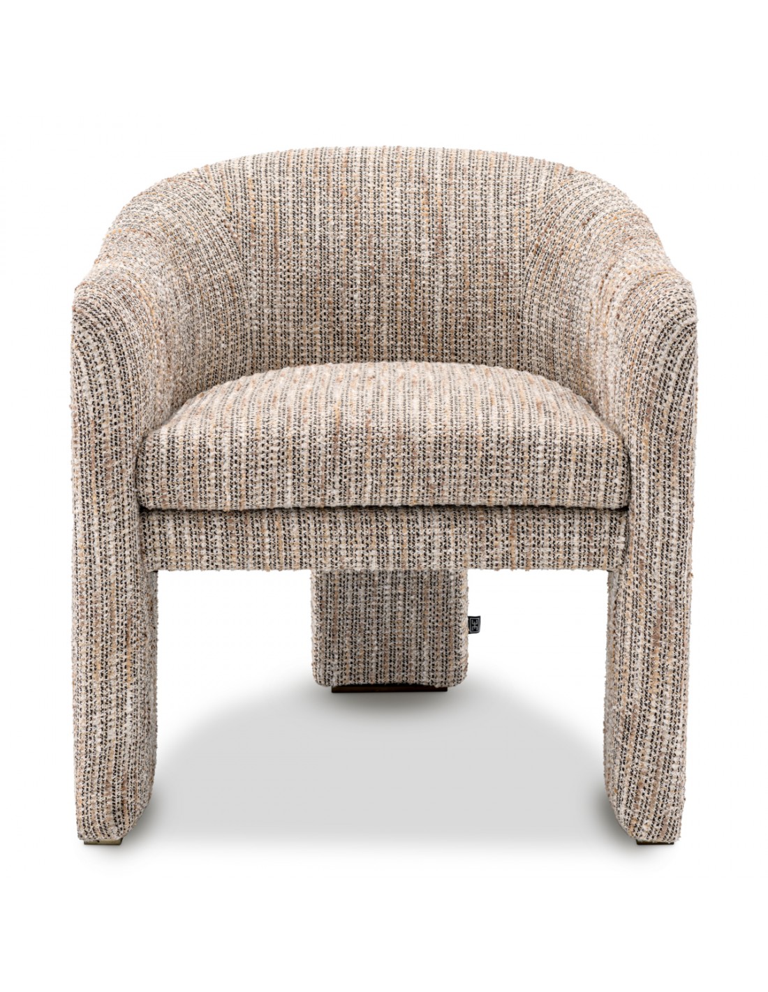 Eichholtz Pebbles spisebordsstol med armlæn, udført i et moderne og luksuriøst design af meleret beige polyester. Stolen måler 69 cm i højden over ryggen og med en siddehøjde på 45 cm.