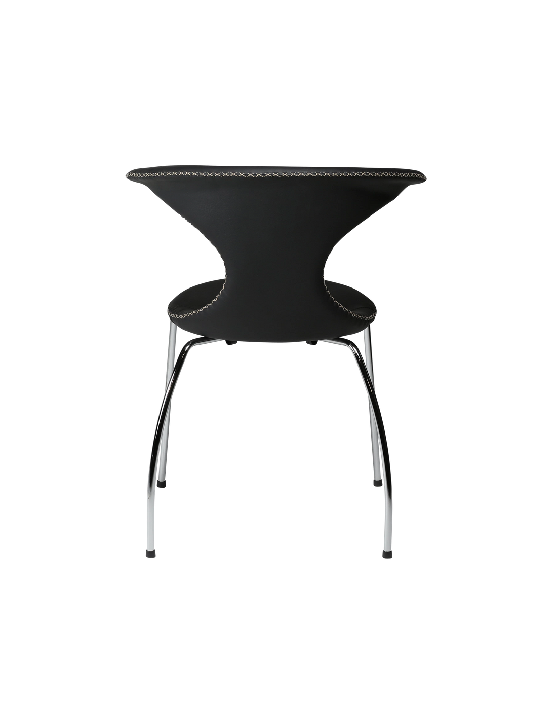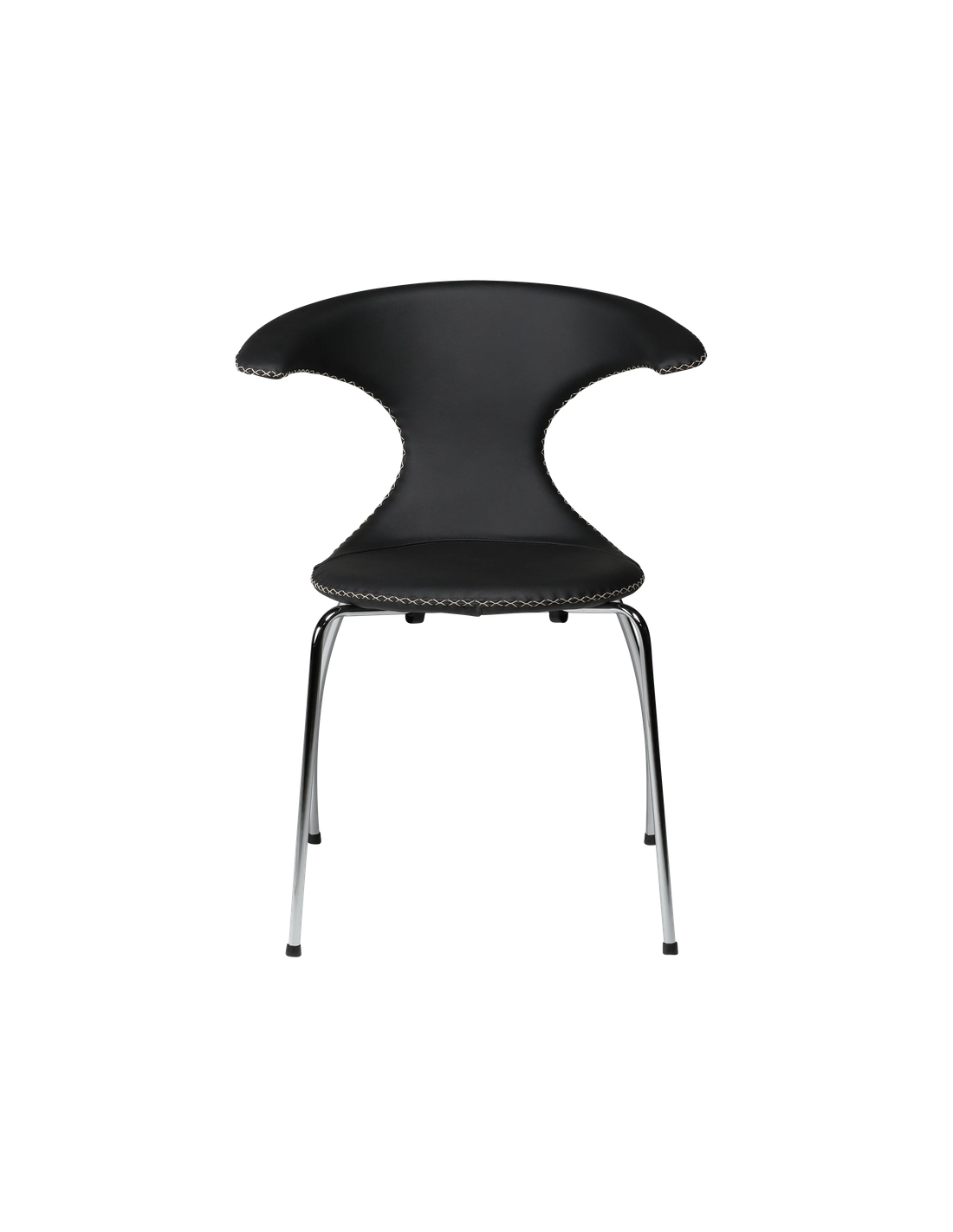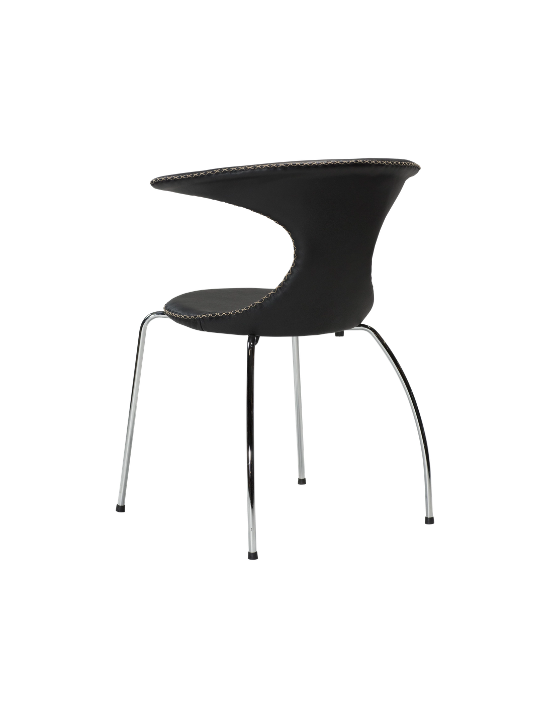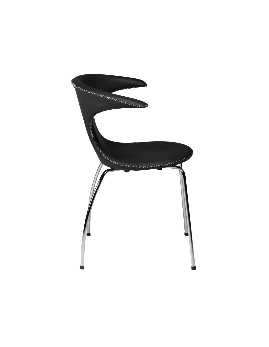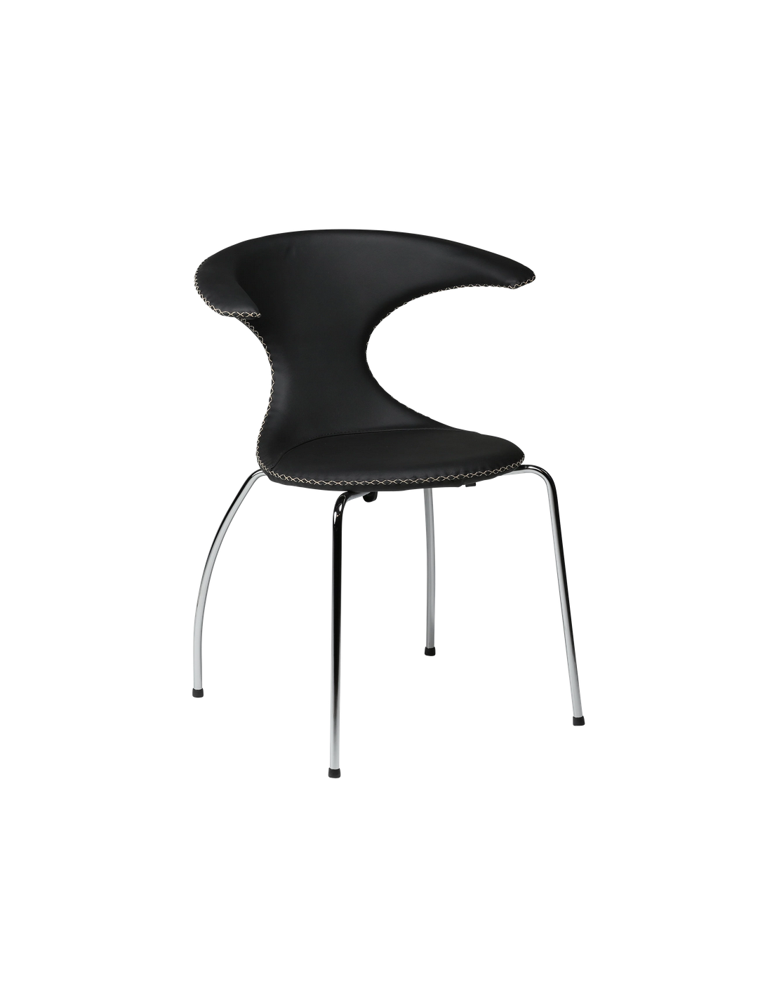 FLAIR Spisebordsstol udført i et dansk design fra danske Dan-Form, fremstillet af kromlakeret metal og sort ægte læder med tydelige syninger. Stolen måler 83,5 cm i højden over ryggen og 65 x 56,5 cm i bredde og dybde og er polstret med højkvalitets skum.