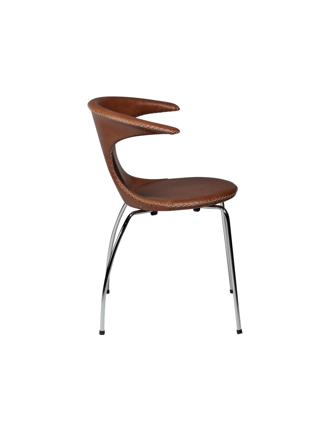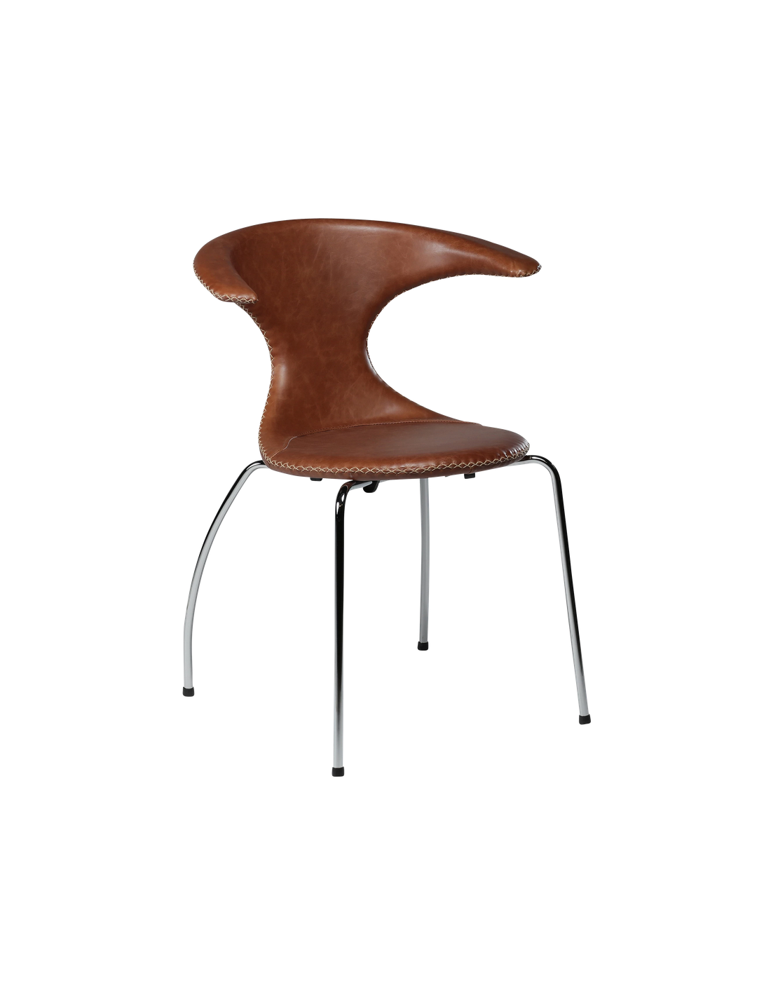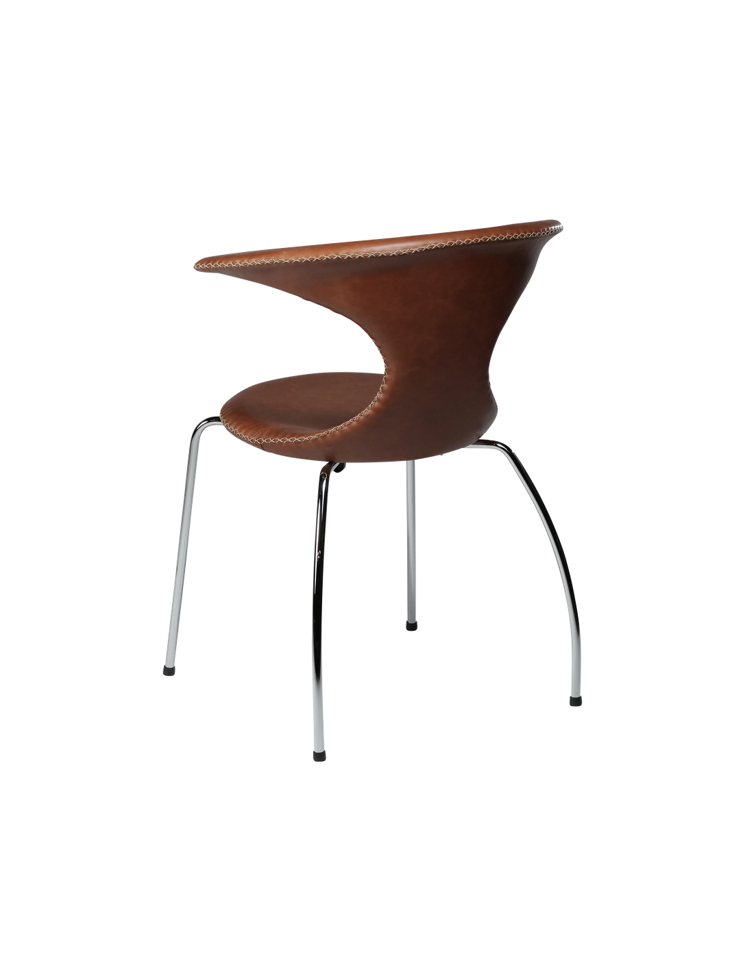 FLAIR Spisebordsstol udført i et dansk design fra danske Dan-Form, fremstillet af kromlakeret metal og brun ægte læder med tydelige syninger. Stolen måler 83,5 cm i højden over ryggen og 65 x 56,5 cm i bredde og dybde og er polstret med højkvalitets skum.