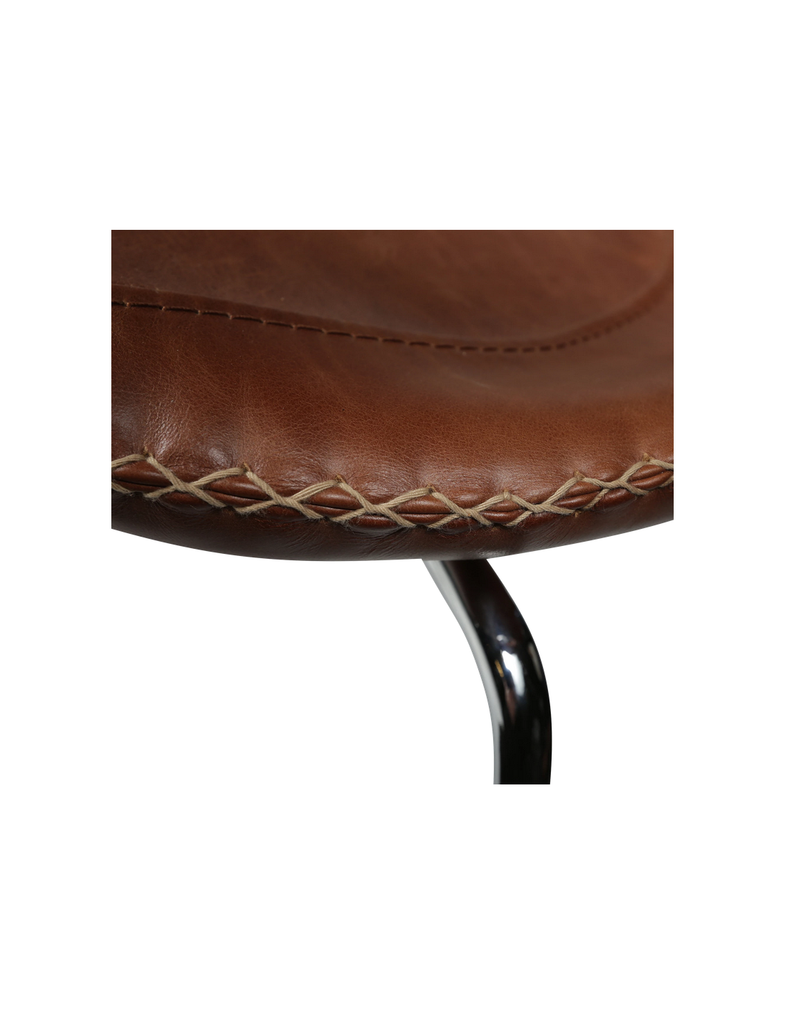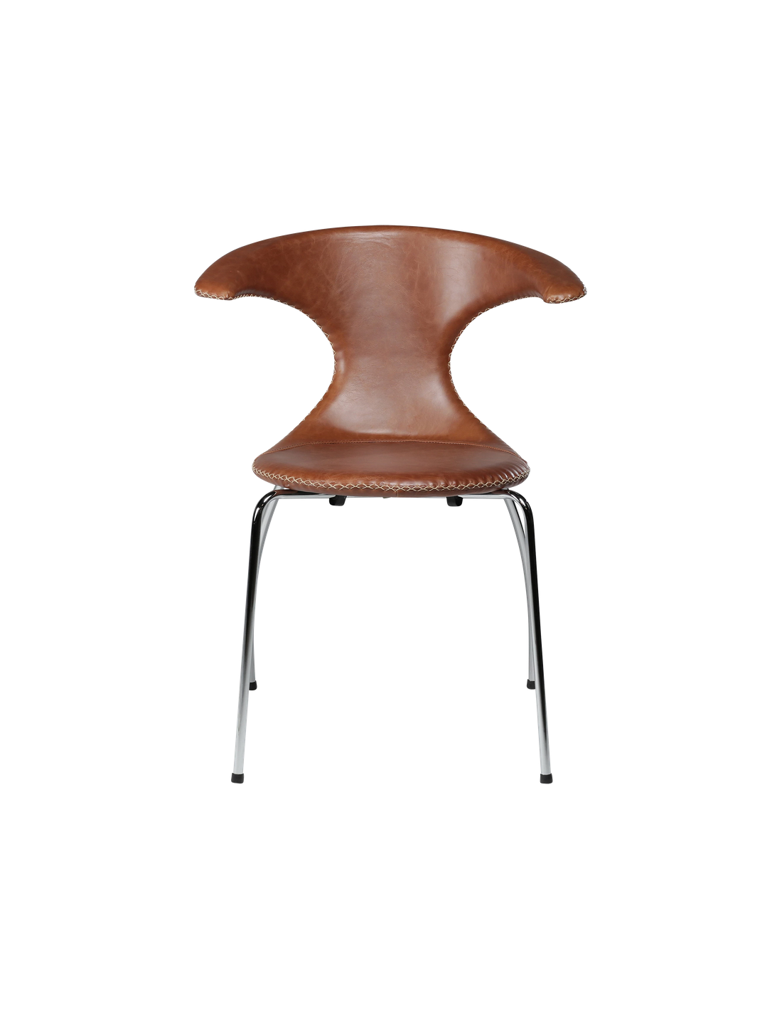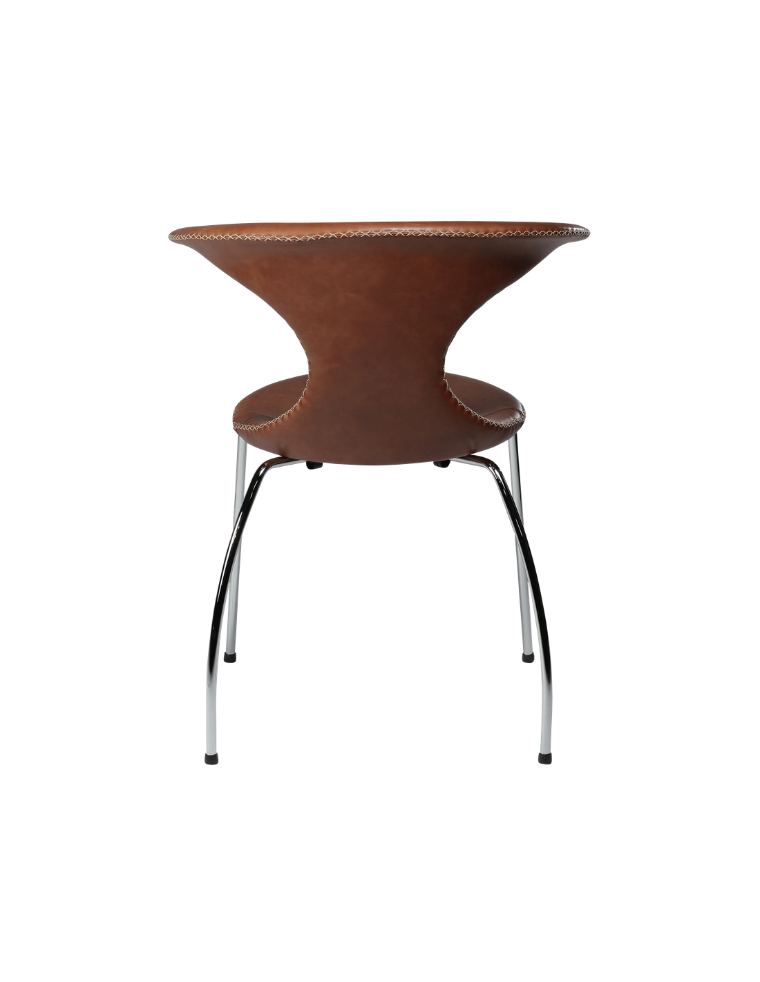 FLAIR Spisebordsstol udført i et dansk design fra danske Dan-Form, fremstillet af kromlakeret metal og brun ægte læder med tydelige syninger. Stolen måler 83,5 cm i højden over ryggen og 65 x 56,5 cm i bredde og dybde og er polstret med højkvalitets skum.