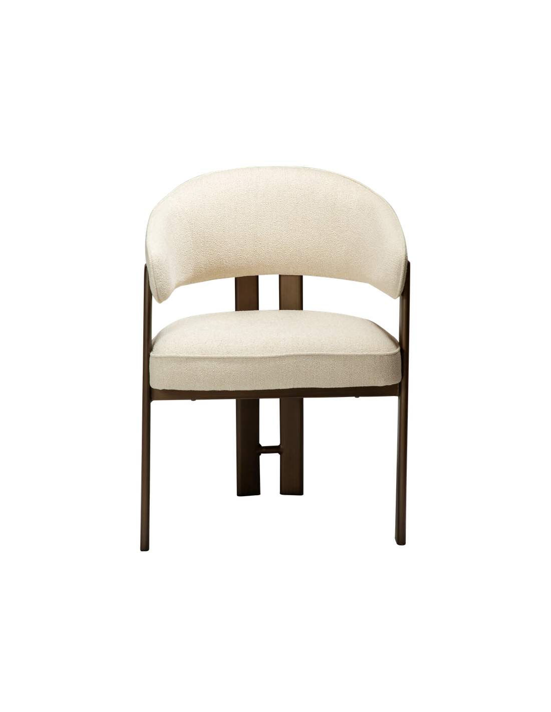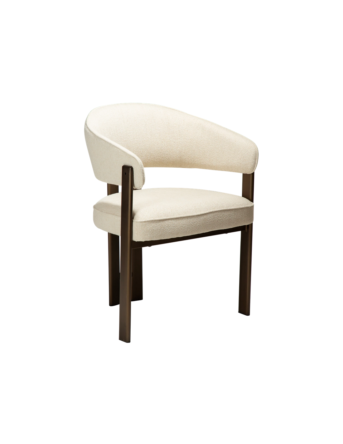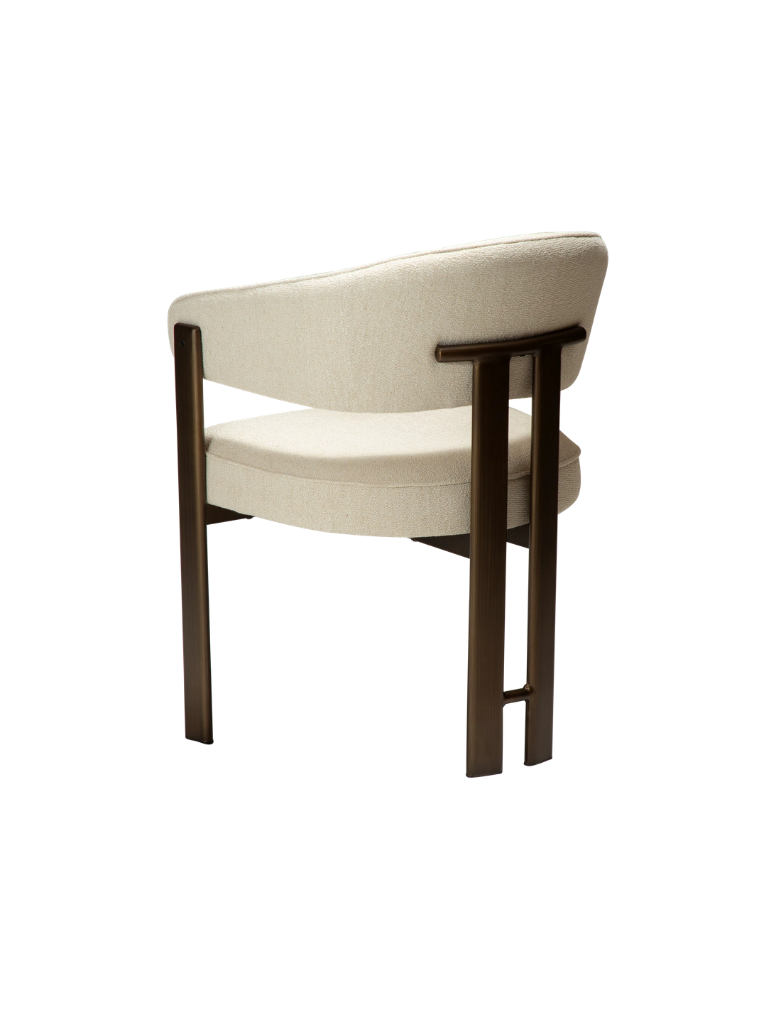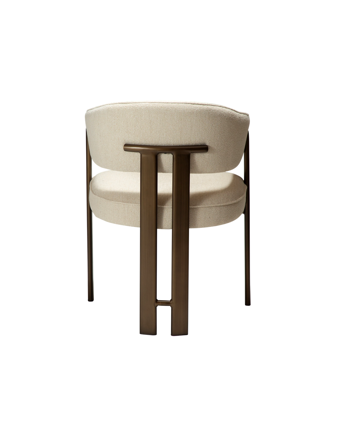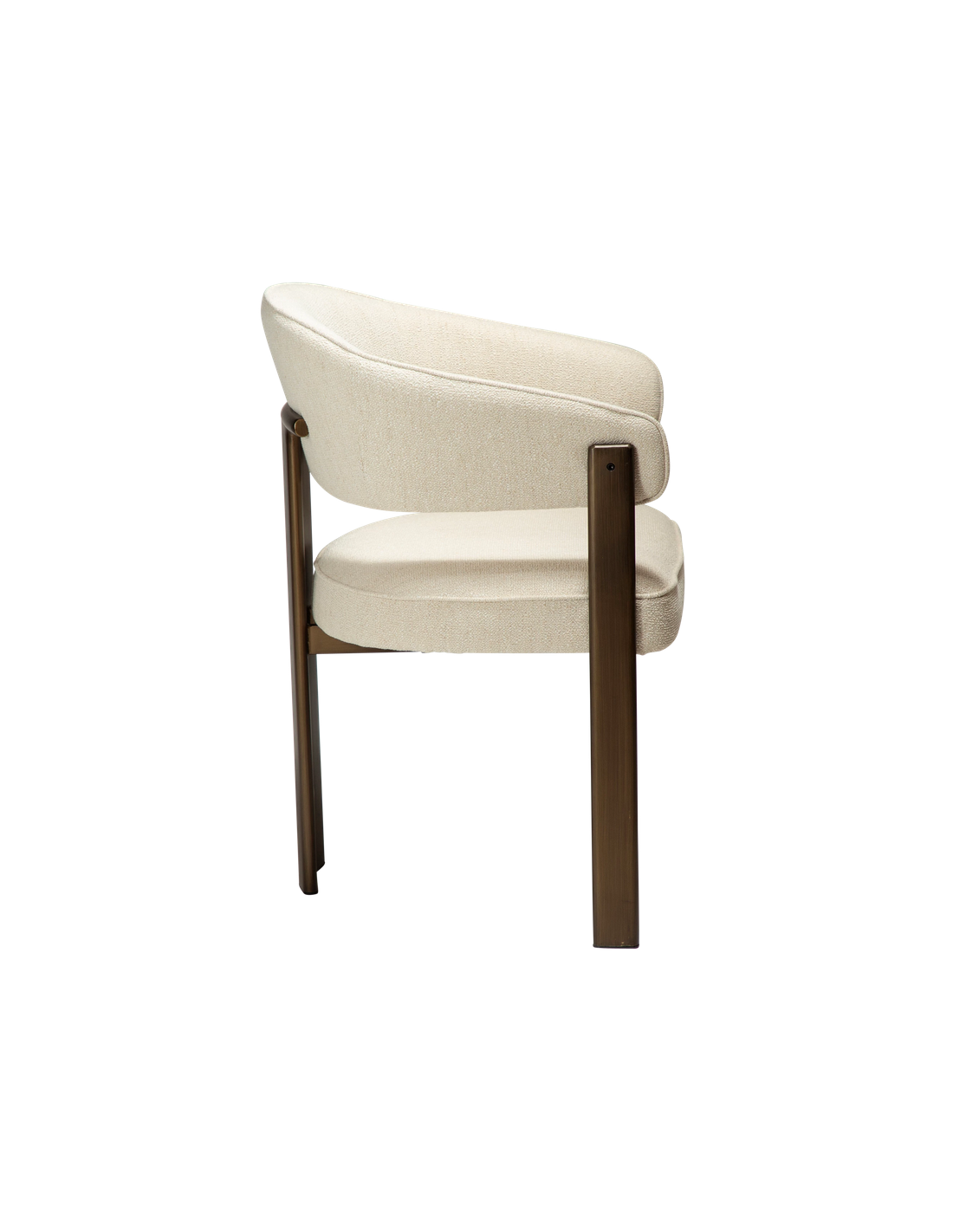 DUCT Spisebordsstol udført i et dansk design fra danske Dan-Form, fremstillet af antik børstet messinglakeret metal og beige bouclé polyester. Stolen måler 81,5 cm i højden over ryggen og 60,5 x 56,5 cm i bredde og dybde og er polstret med højkvalitets skum.