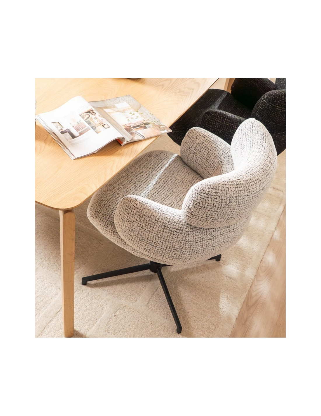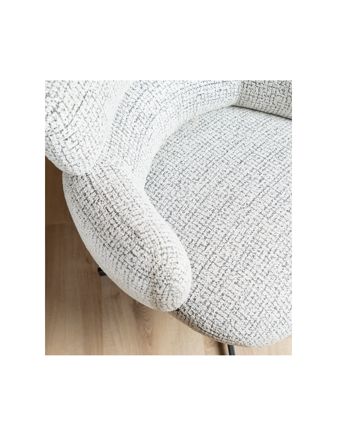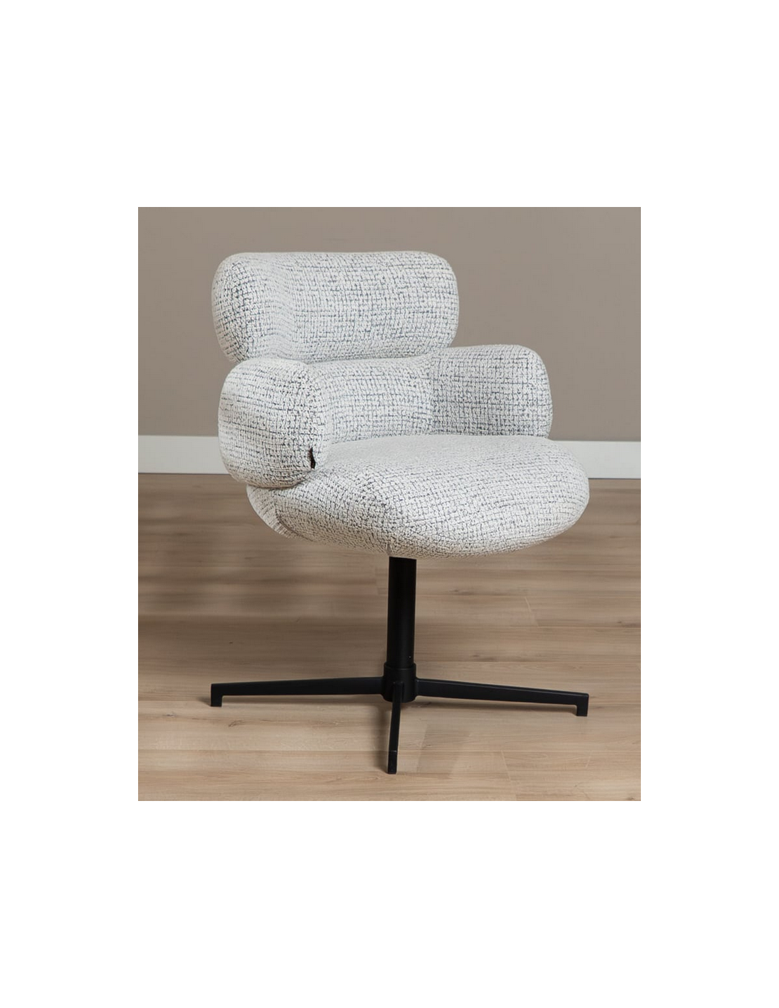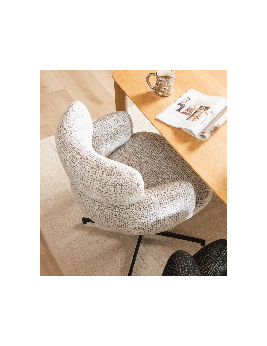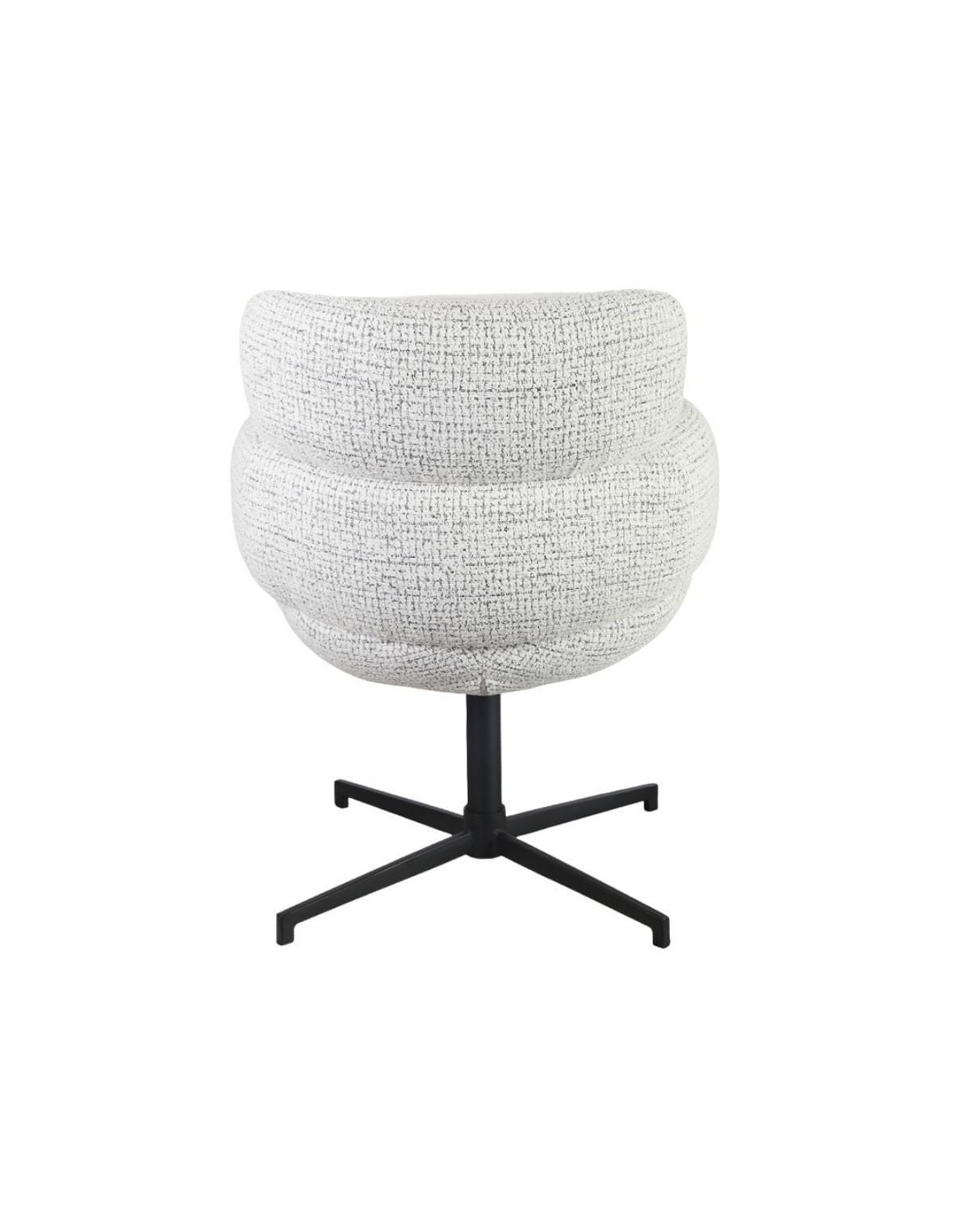 COCO Spisebordsstol med drejefod og armlæn udført i et Skandinavisk design af sortlakeret metal og off-white bouclé polyester. Spisebordsstolen måler 83,5 cm i højden over ryggen og med en siddehøjde på 51 cm.