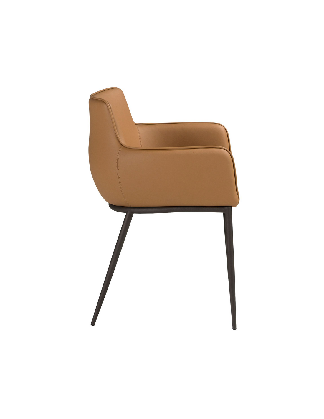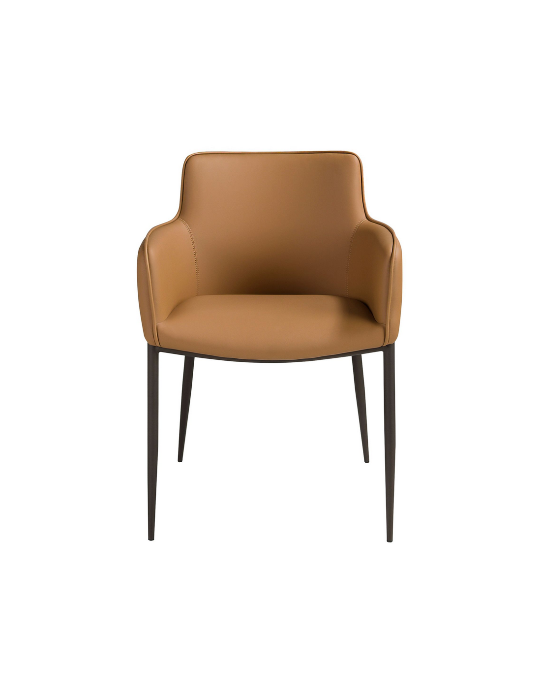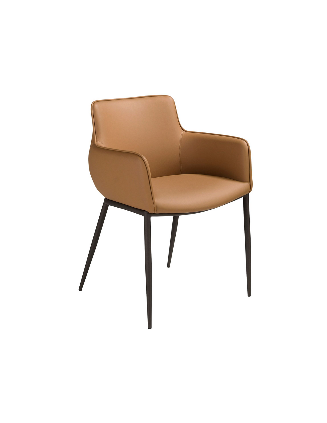 Spisebordsstol med armlæn udført i et moderne design fra Angel Cerdá. Spisebordsstolen er fremstillet med stel i sortlakeret stål og sæde i brun vegansk læder (leatherette). Stolen måler 81 cm i højden over ryggen og har en siddehøjde på 47 cm.