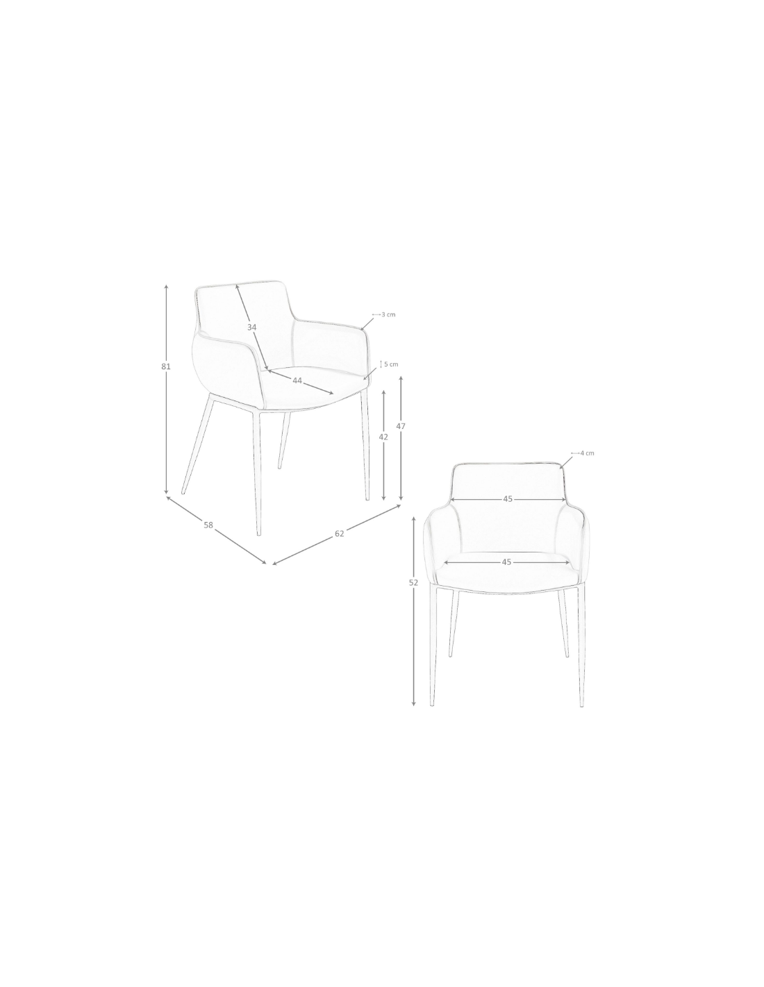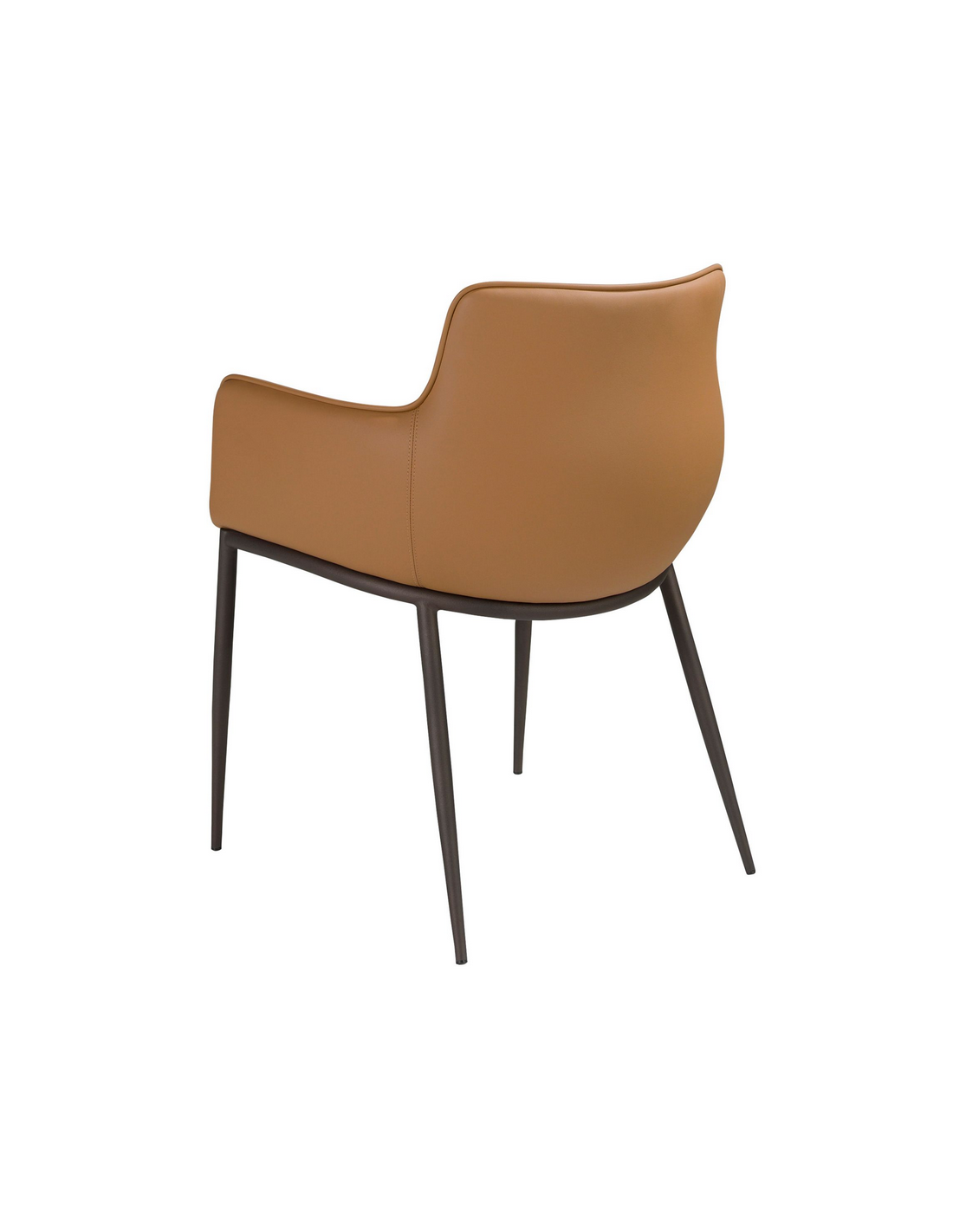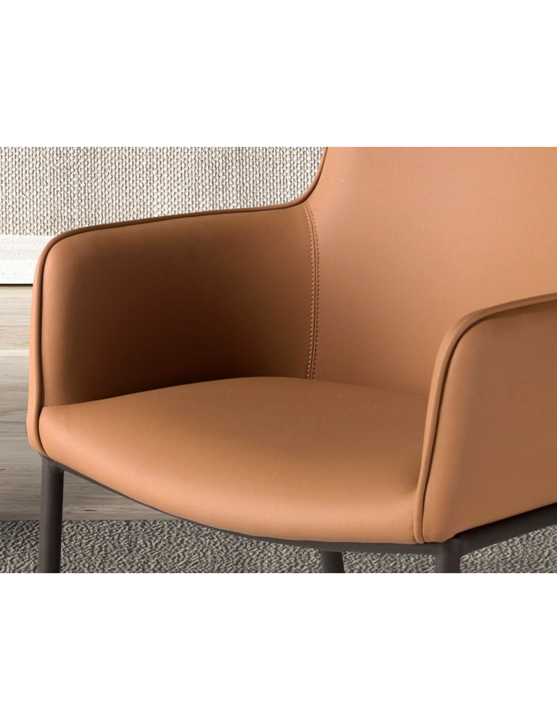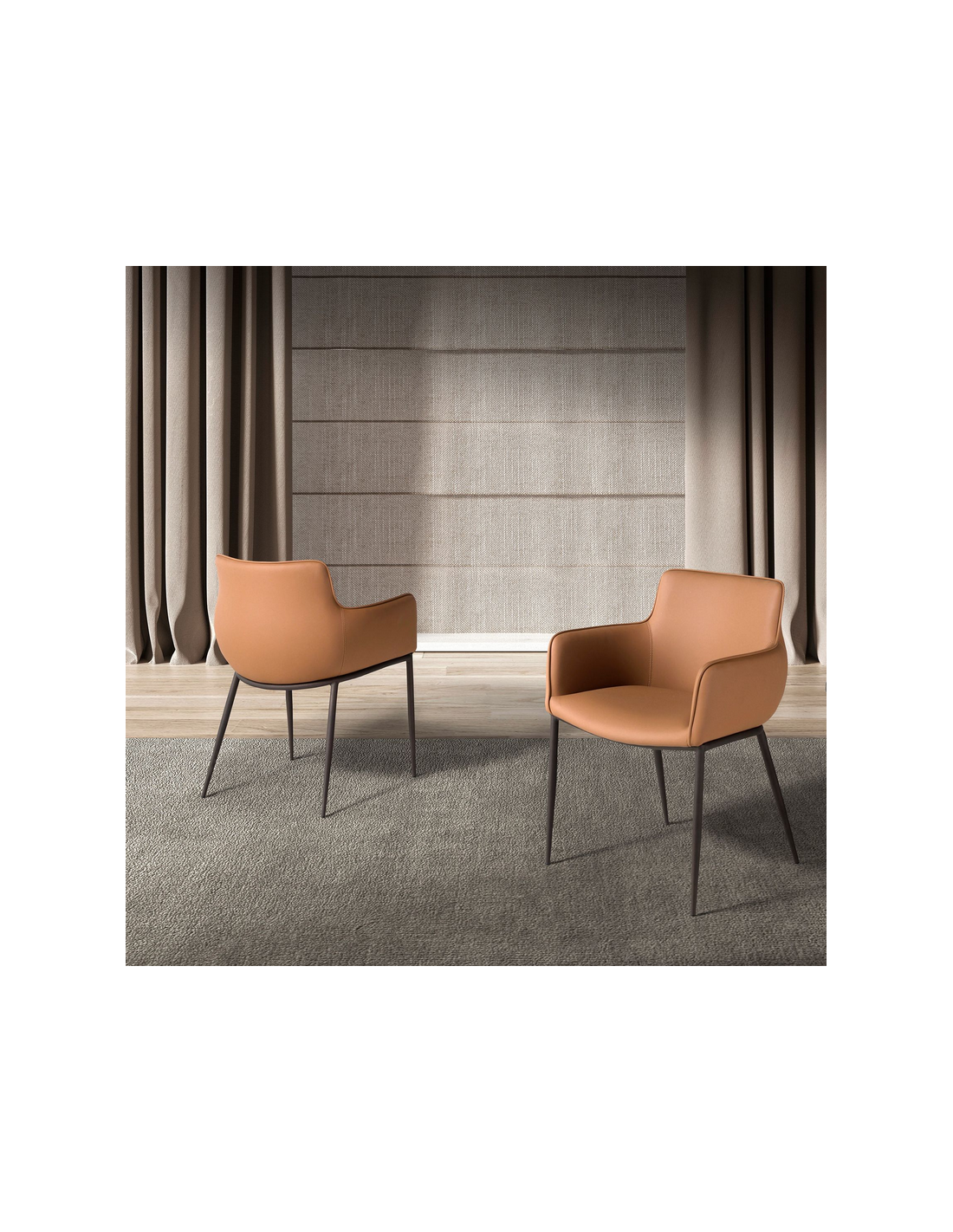 Spisebordsstol med armlæn udført i et moderne design fra Angel Cerdá. Spisebordsstolen er fremstillet med stel i sortlakeret stål og sæde i brun vegansk læder (leatherette). Stolen måler 81 cm i højden over ryggen og har en siddehøjde på 47 cm.