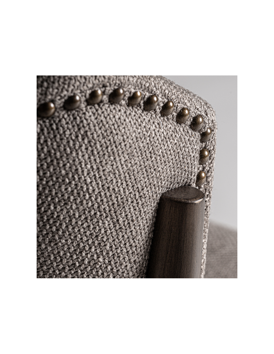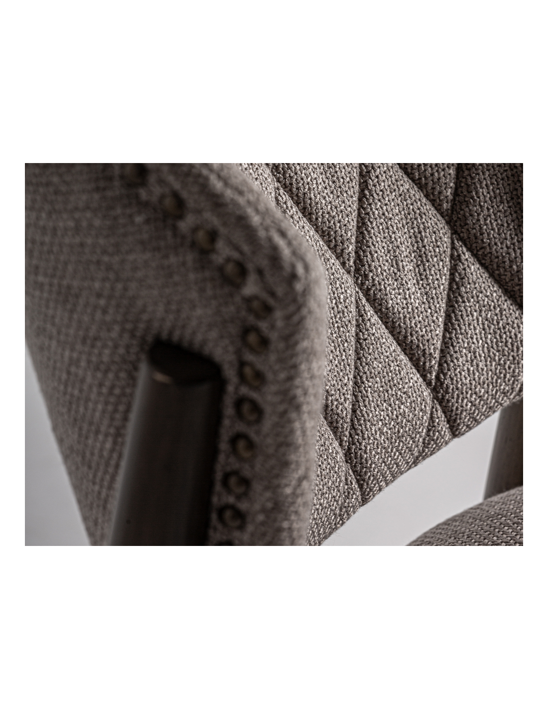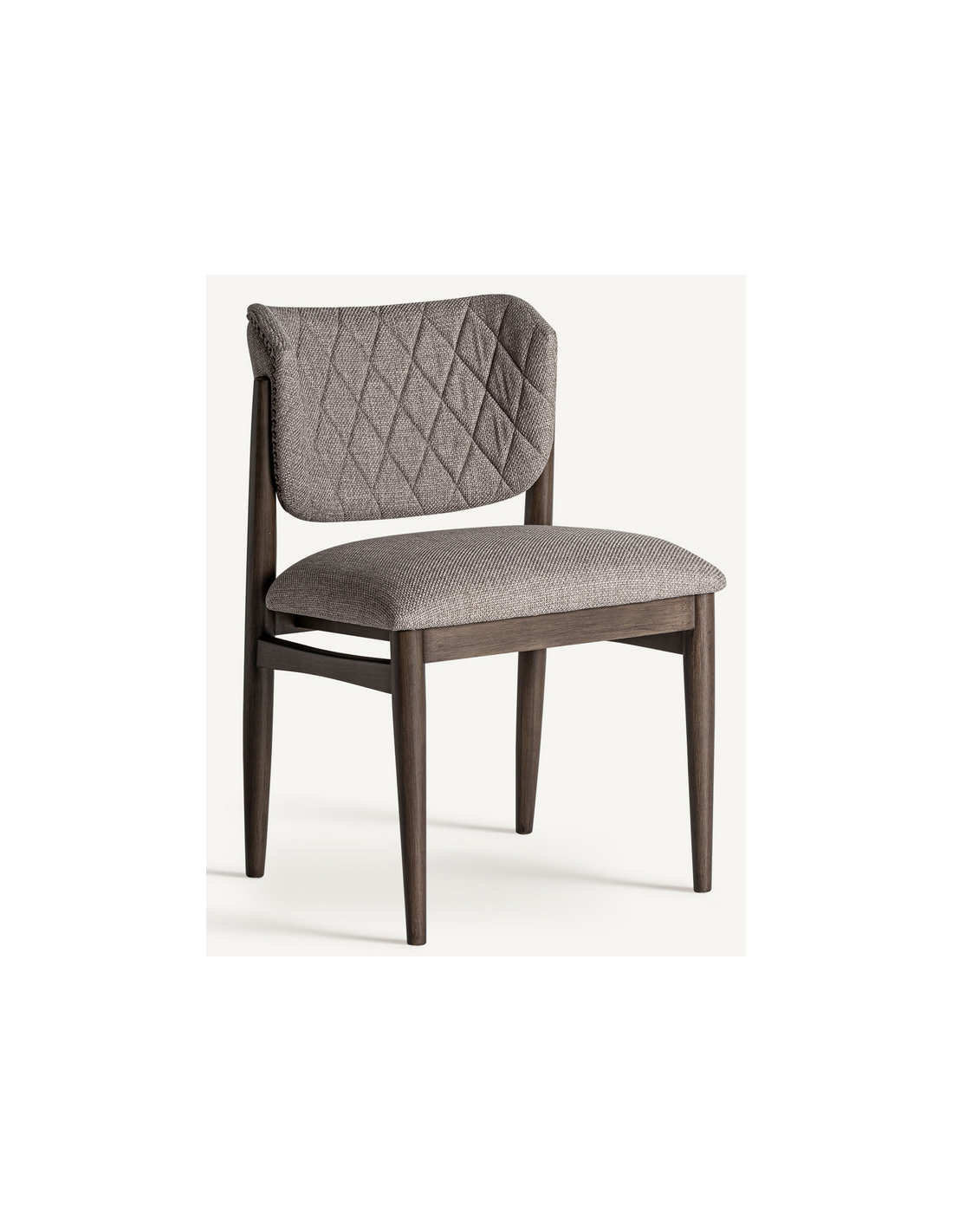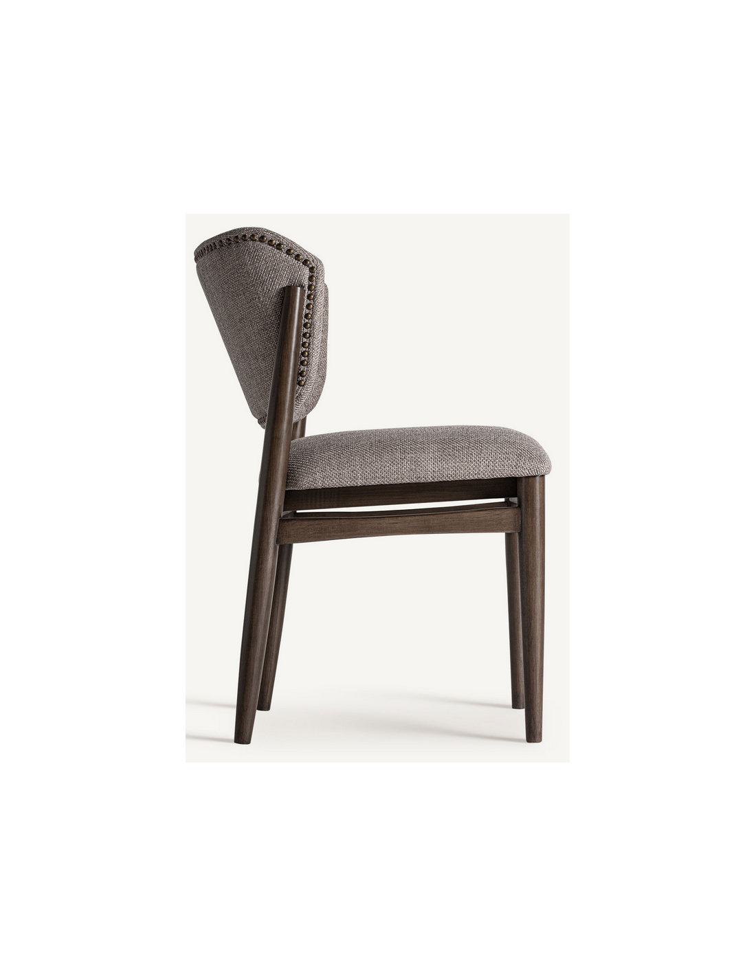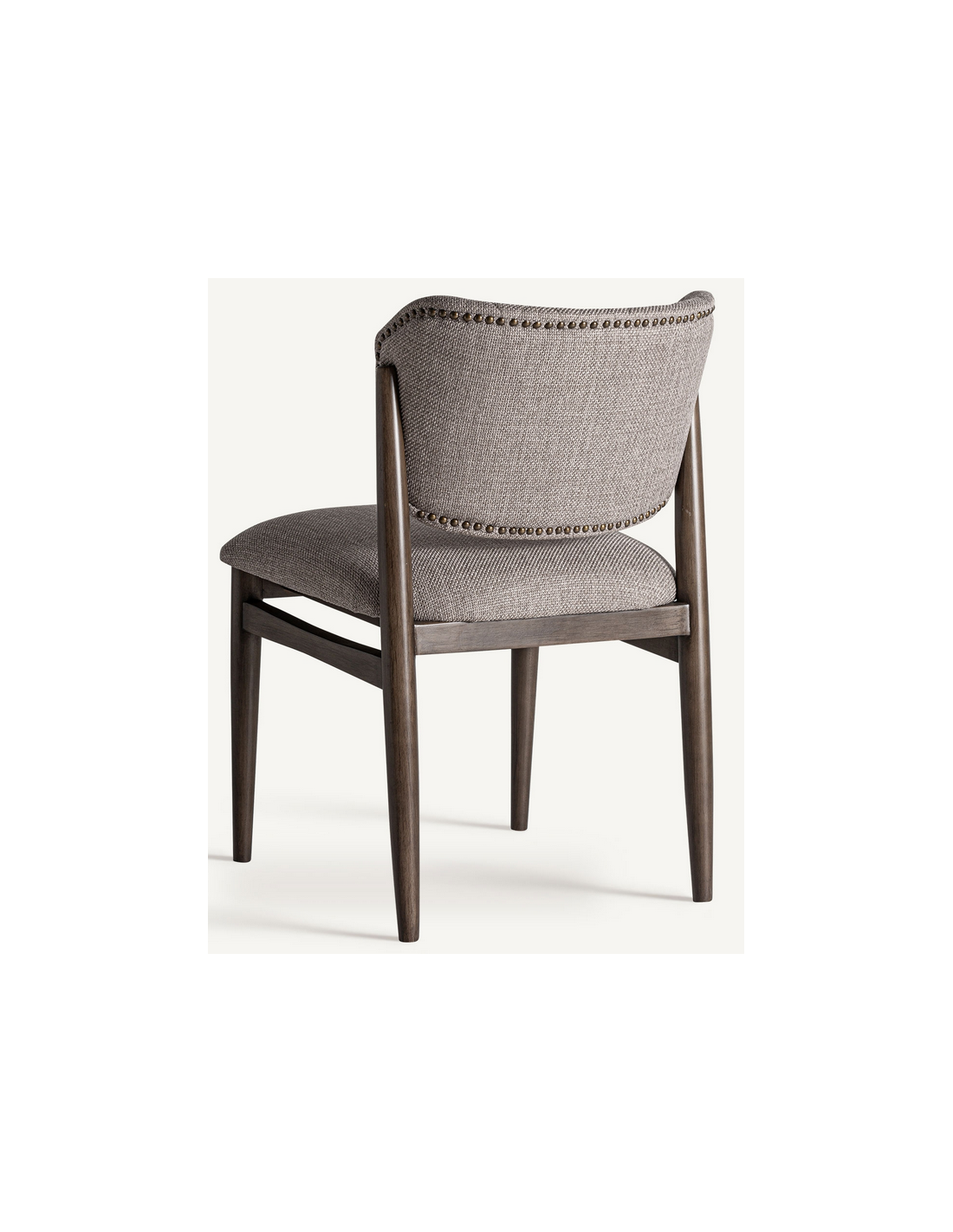 LAIVE Spisebordsstol udført i et design, fremstillet af brunlakeret asktræ og gråbrun polyester med nitter på ryglæn. Stolen måler 82 cm i højden over ryggen og 51 cm i siddehøjden.