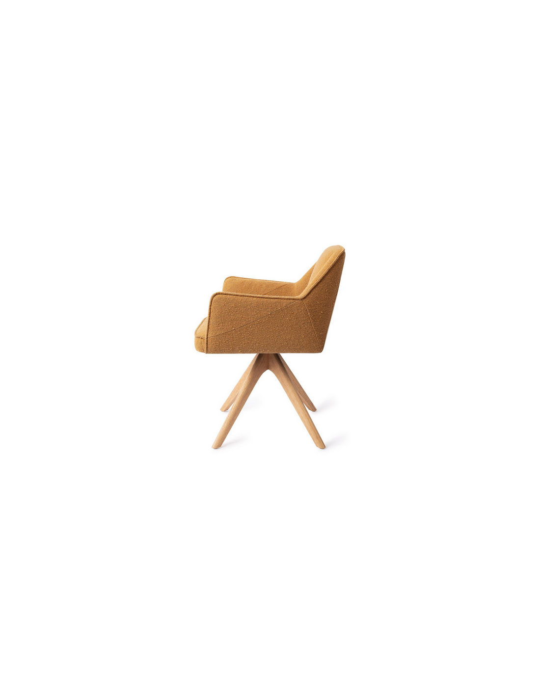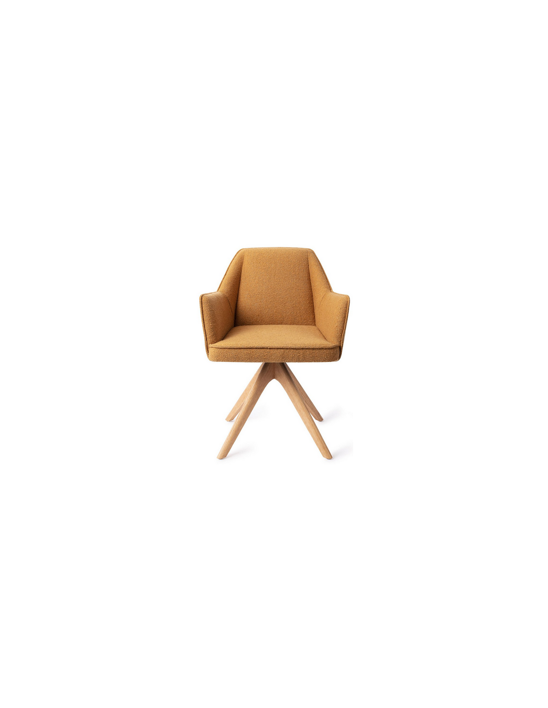Tome spisebordsstol med armlæn og drejefod, udført i et moderne design med stel i egetræ og sæde i kamelbrun polyester. Stolen måler 80 cm i højden over ryggen og med siddehøjde på 48 cm.