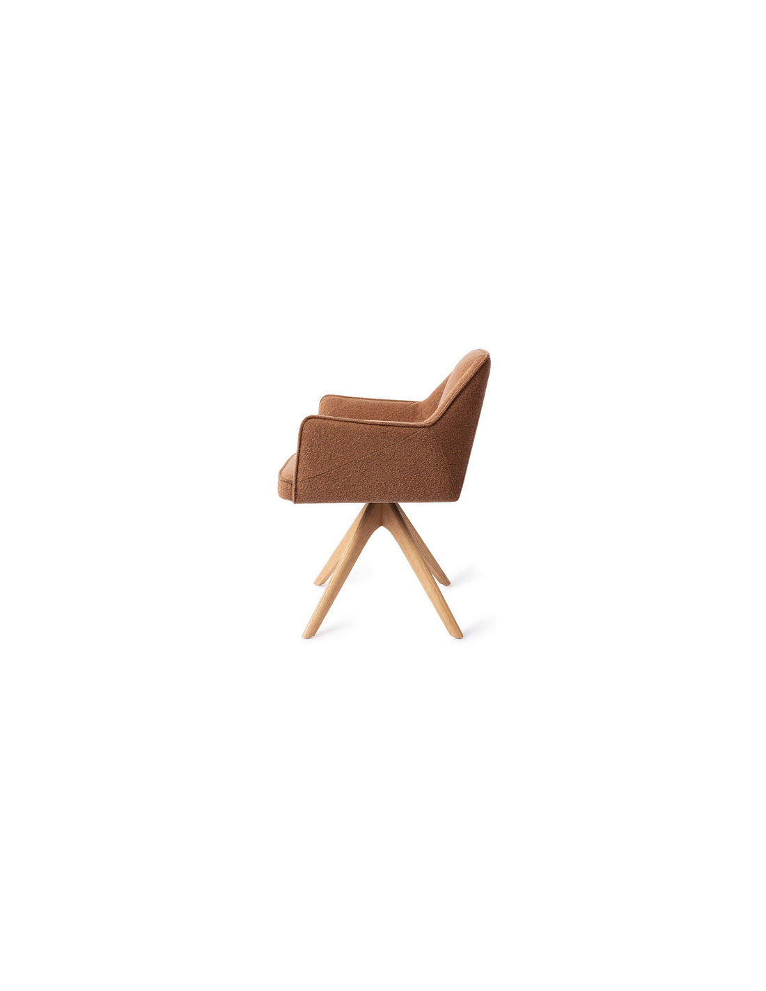 Tome spisebordsstol med armlæn og drejefod, udført i et moderne design med stel i egetræ og sæde i kanelbrun polyester. Stolen måler 80 cm i højden over ryggen og med siddehøjde på 48 cm.