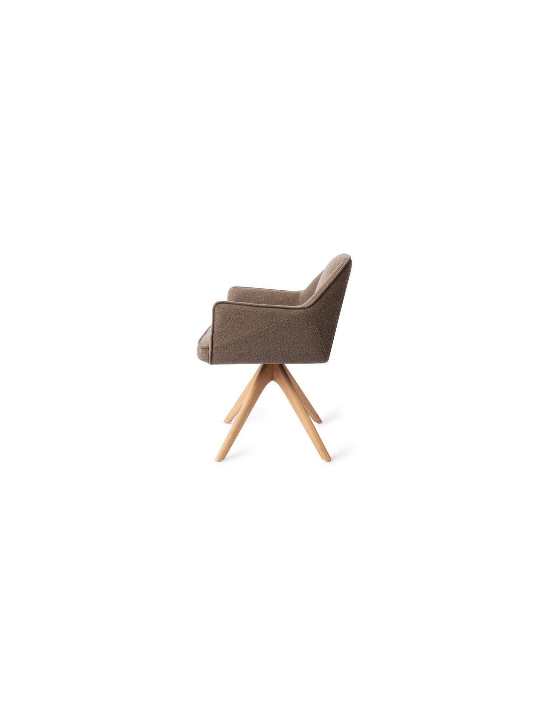 Tome spisebordsstol med armlæn og drejefod, udført i et moderne design med stel i egetræ og sæde i jordbrun polyester. Stolen måler 80 cm i højden over ryggen og med siddehøjde på 48 cm.