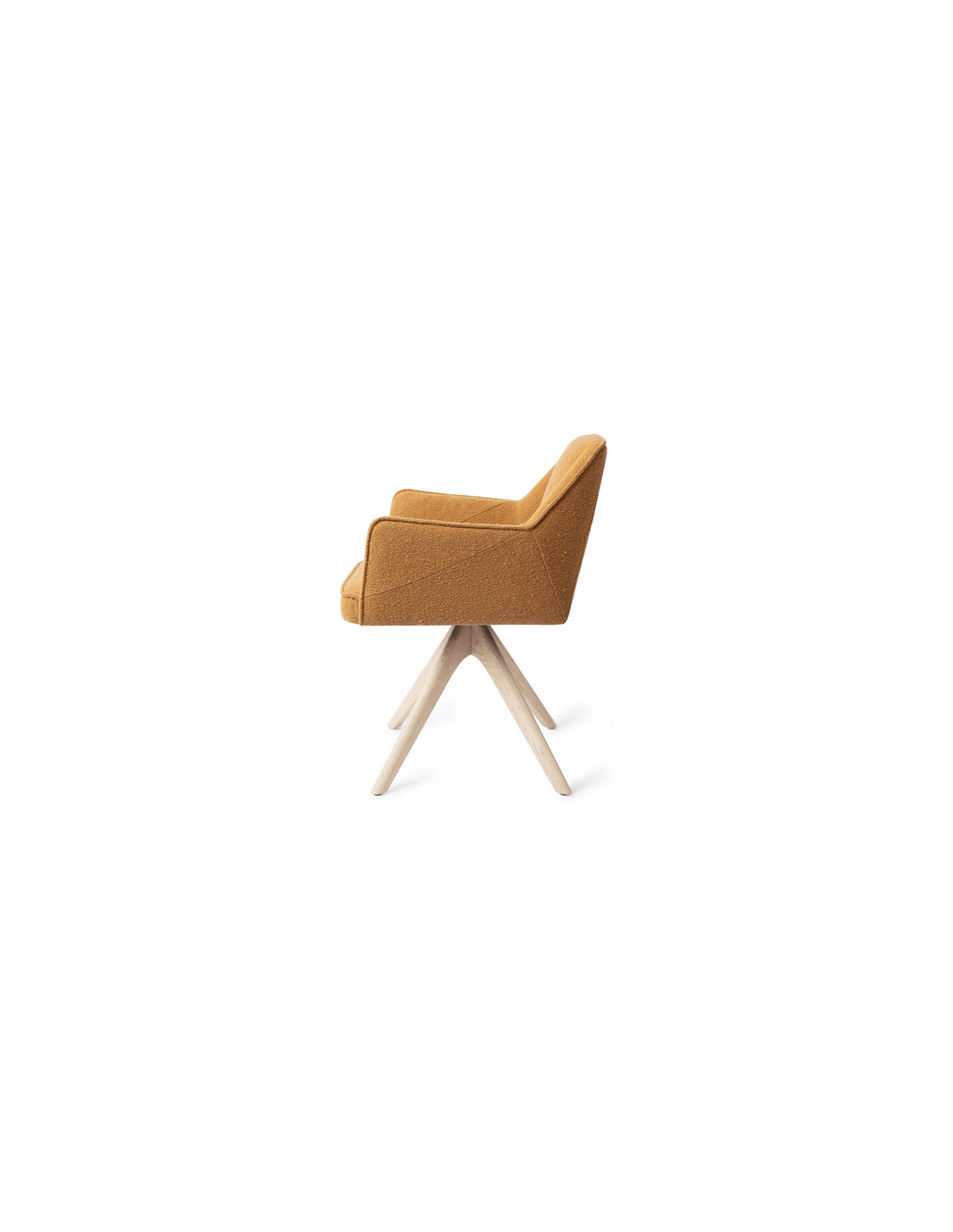 Tome spisebordsstol med armlæn og drejefod, udført i et moderne design med stel i bleget egetræ og sæde i kamelbrun polyester. Stolen måler 80 cm i højden over ryggen og med siddehøjde på 48 cm.