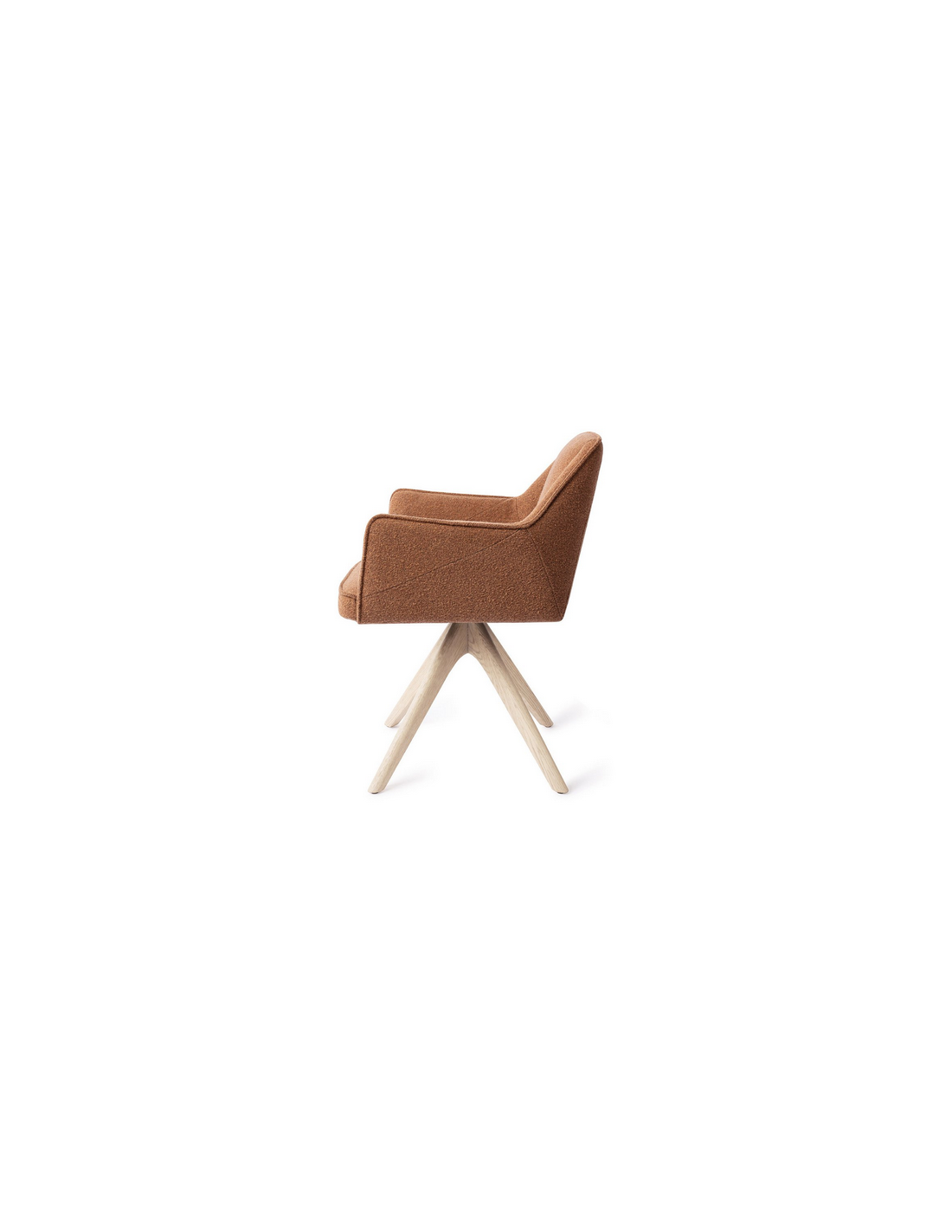 Tome spisebordsstol med armlæn og drejefod, udført i et moderne design med stel i bleget egetræ og sæde i kanelbrun polyester. Stolen måler 80 cm i højden over ryggen og med siddehøjde på 48 cm.