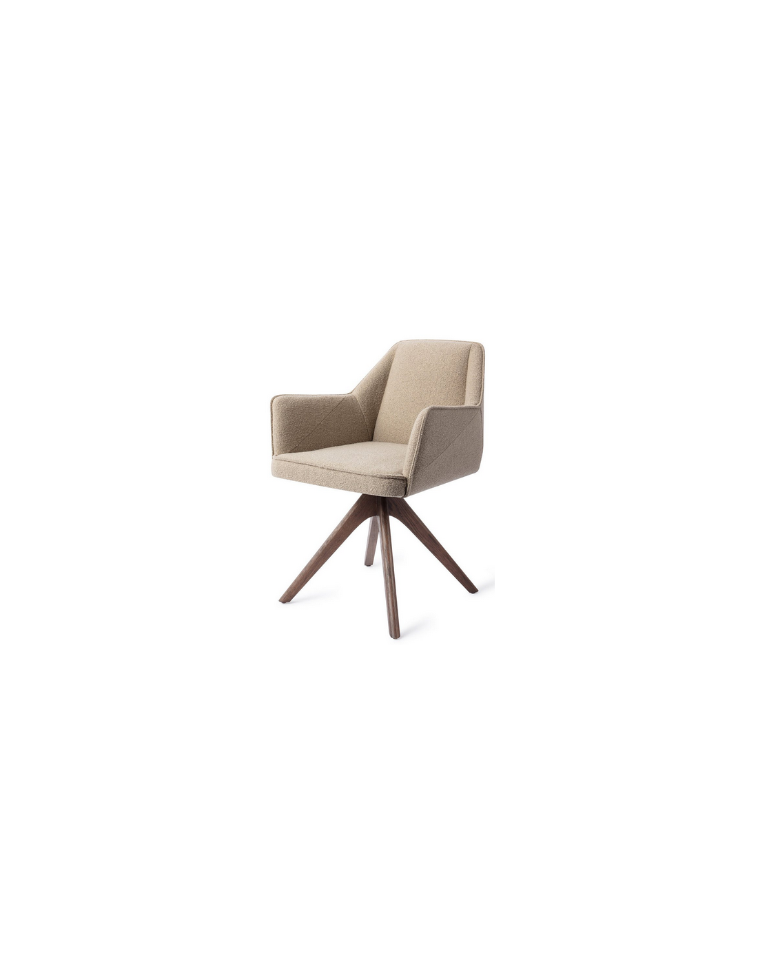 Tome spisebordsstol med armlæn og drejefod, udført i et moderne design med stel i valnøddebrun egetræ og sæde i greigefarvet polyester. Stolen måler 80 cm i højden over ryggen og med siddehøjde på 48 cm.