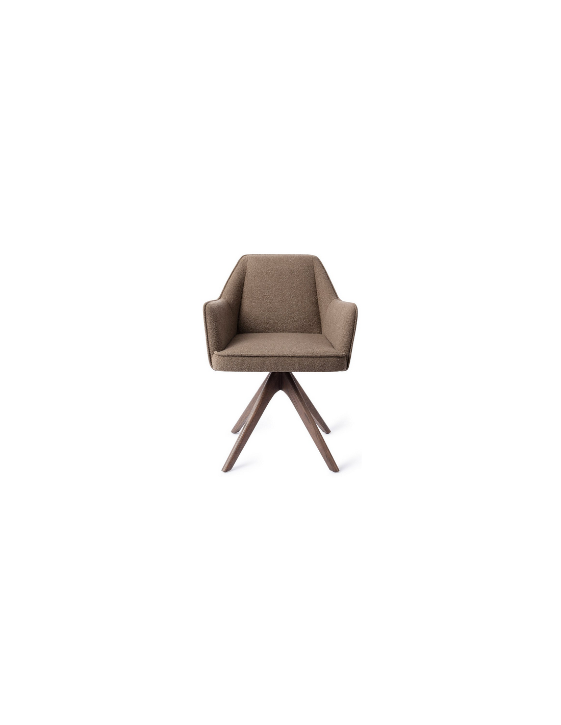 Tome spisebordsstol med armlæn og drejefod, udført i et moderne design med stel i valnøddebrun egetræ og sæde i jordbrun polyester. Stolen måler 80 cm i højden over ryggen og med siddehøjde på 48 cm.