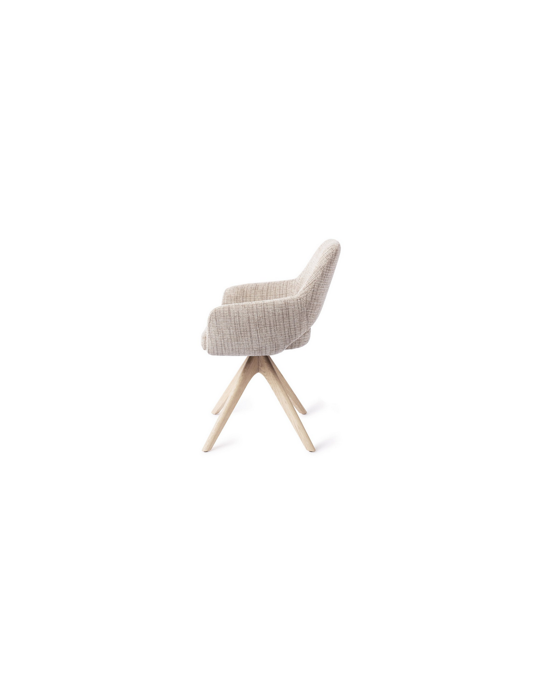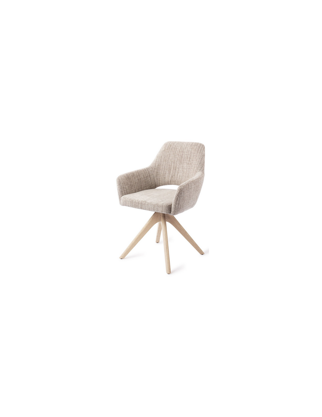 YANAI Spisebordsstol med armlæn og drejefod, udført i et moderne design med stel i bleget egetræ og sæde i meleret toffeefarvet polyester. Stolen måler 83 cm i højden over ryggen og med siddehøjde på 49 cm.