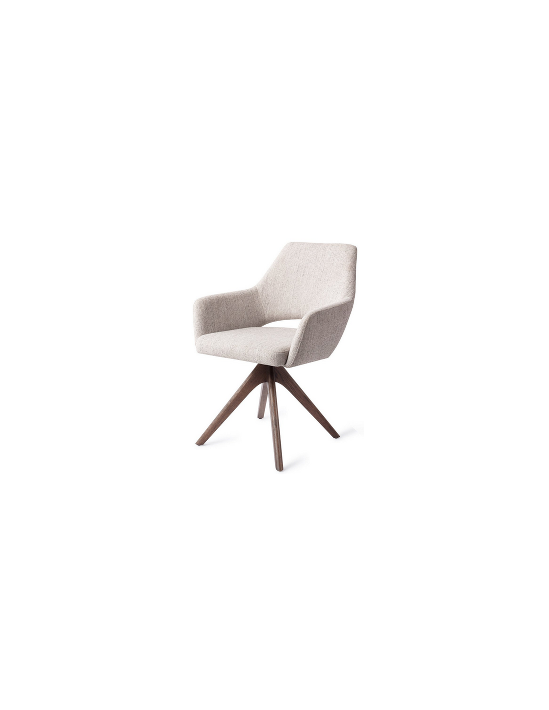 YANAI Spisebordsstol med armlæn og drejefod, udført i et moderne design med stel i valnøddefarvet egetræ og sæde i lysegrå polyester. Stolen måler 83 cm i højden over ryggen og med siddehøjde på 49 cm.
