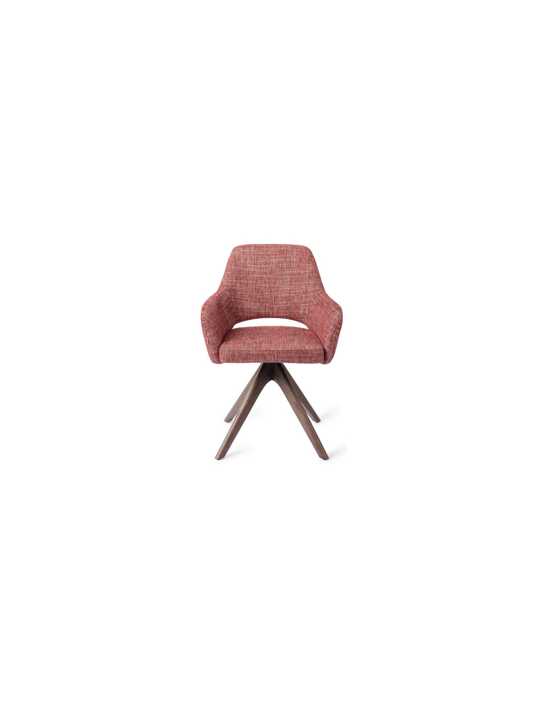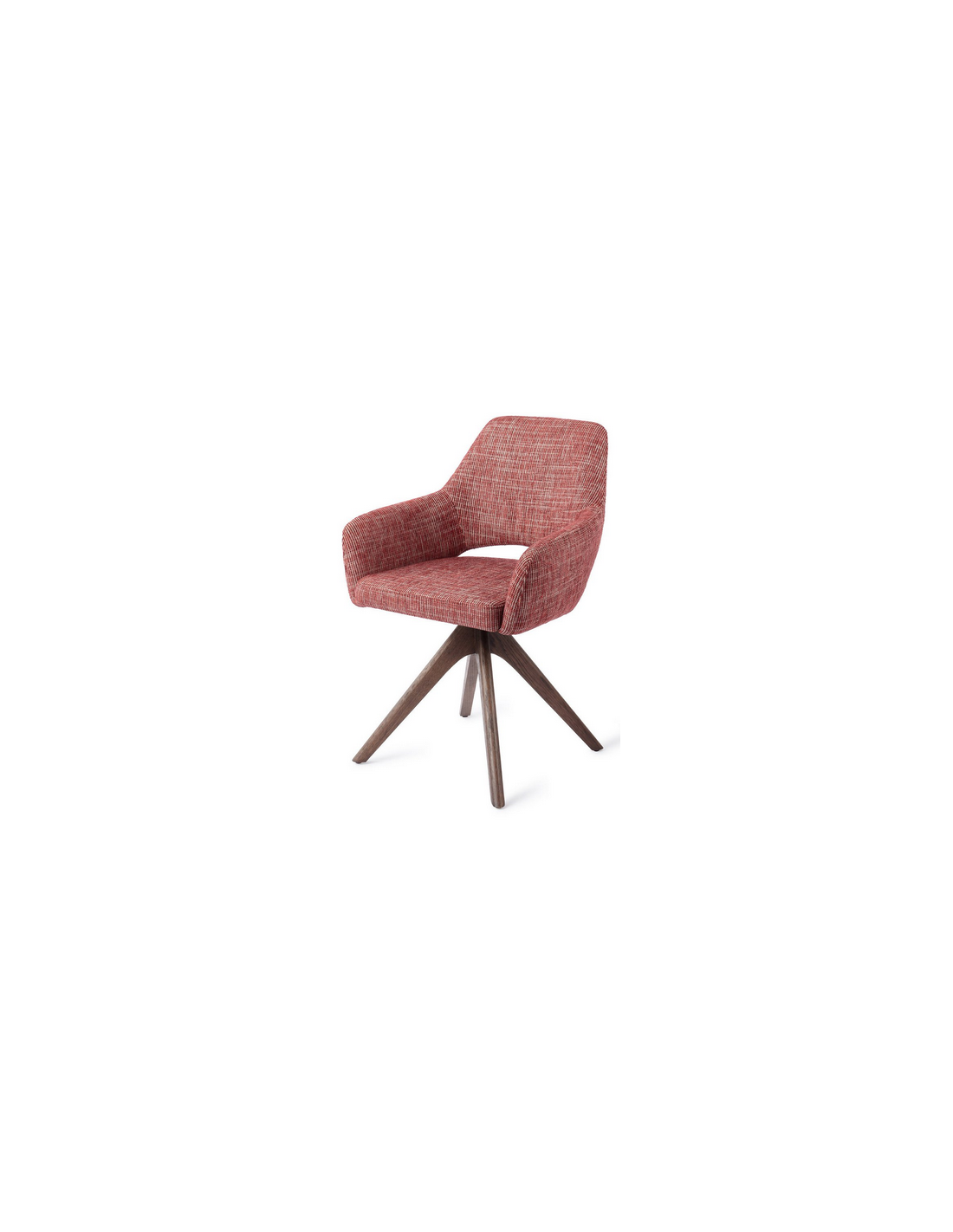 YANAI Spisebordsstol med armlæn og drejefod, udført i et moderne design med stel i valnøddefarvet egetræ og sæde i bær rød polyester. Stolen måler 83 cm i højden over ryggen og med siddehøjde på 49 cm.