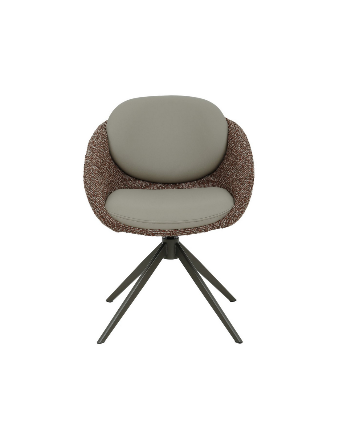 AVERIK Spisebordsstol med armlæn og drejefod, udført i et moderne design med stel i grålakeret stål og sæde i rødbrun bouclé polyester med ryg og sæde i grå kunstlæder. Spisebordsstolen måler 80 cm i højden over ryggen og har en siddehøjde på 48 cm.