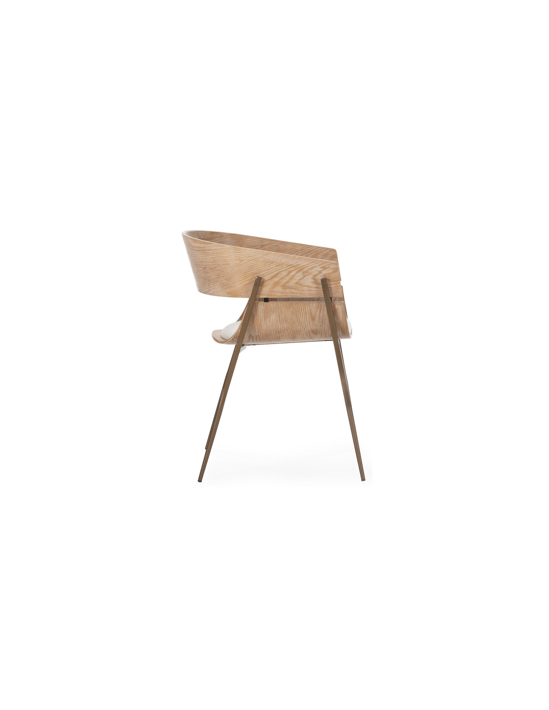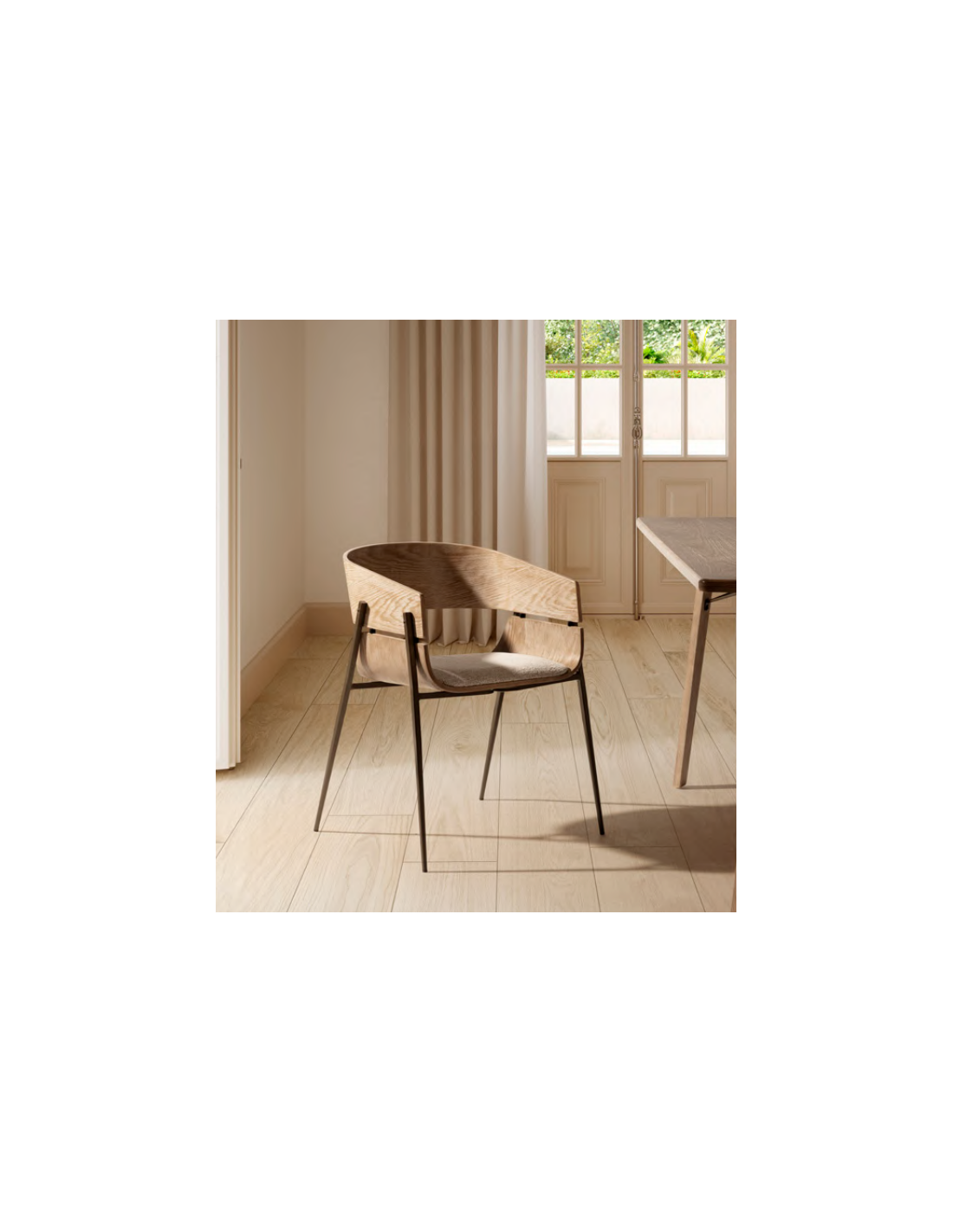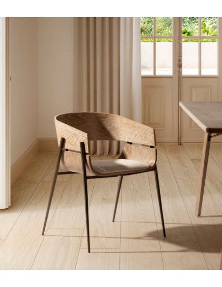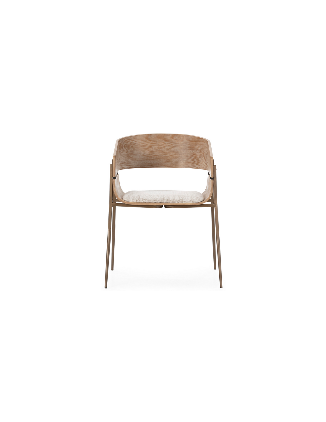 Sæt med 2 x NAIA Spisebordsstole med armlæn, udført i et Skandinavisk design af bronzebrunlakeret metal og lys egetræsfarvet finér med sæde i beige polyester. Stolene måler 77 cm i højden over ryggen og 51 x 56 cm i bredde og dybde.