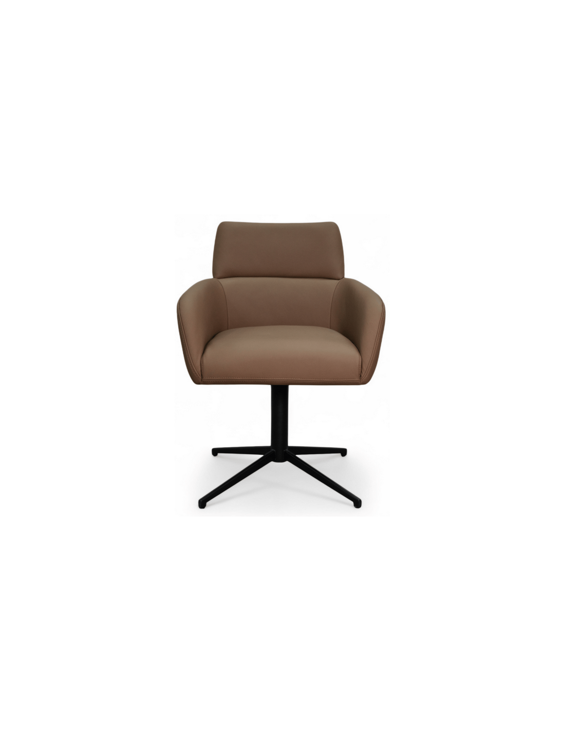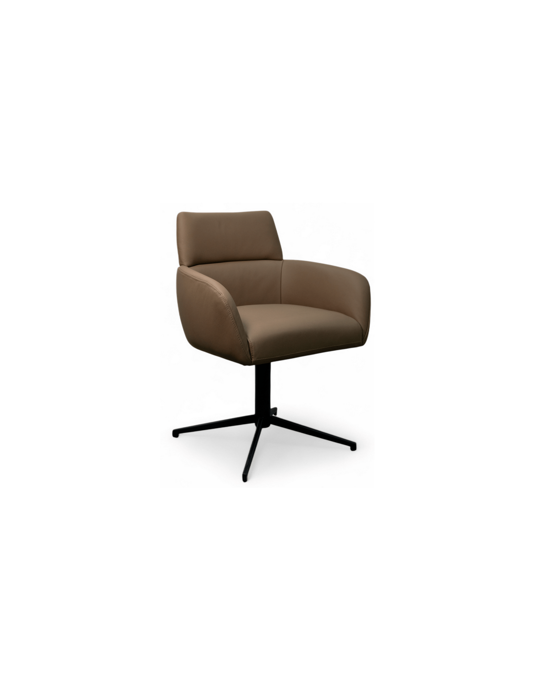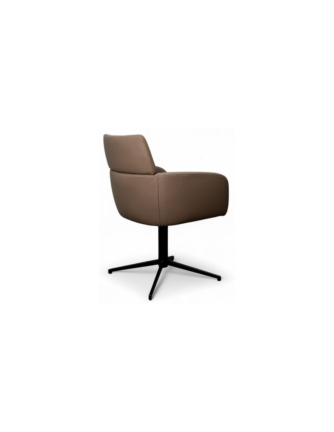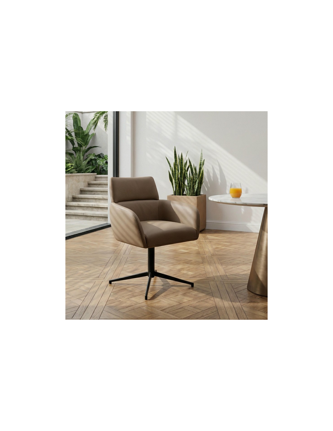 MARC Spisebordsstol med armlæn og drejefod, udført i et design fremstillet i sortlakeret metal og taupefarvet ægte læder. Stolen måler 83 cm i højden over ryggen og med siddehøjde på 49 cm.