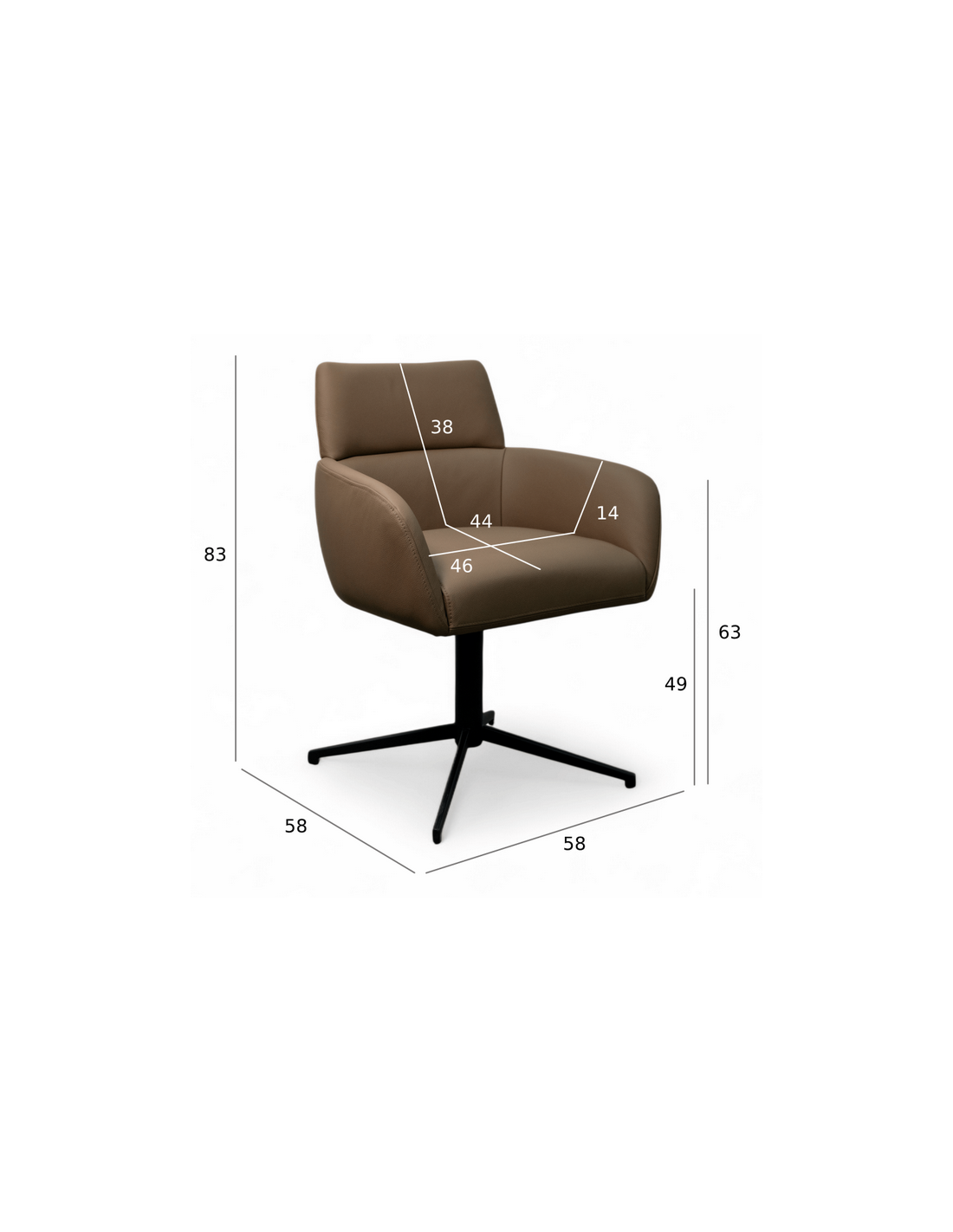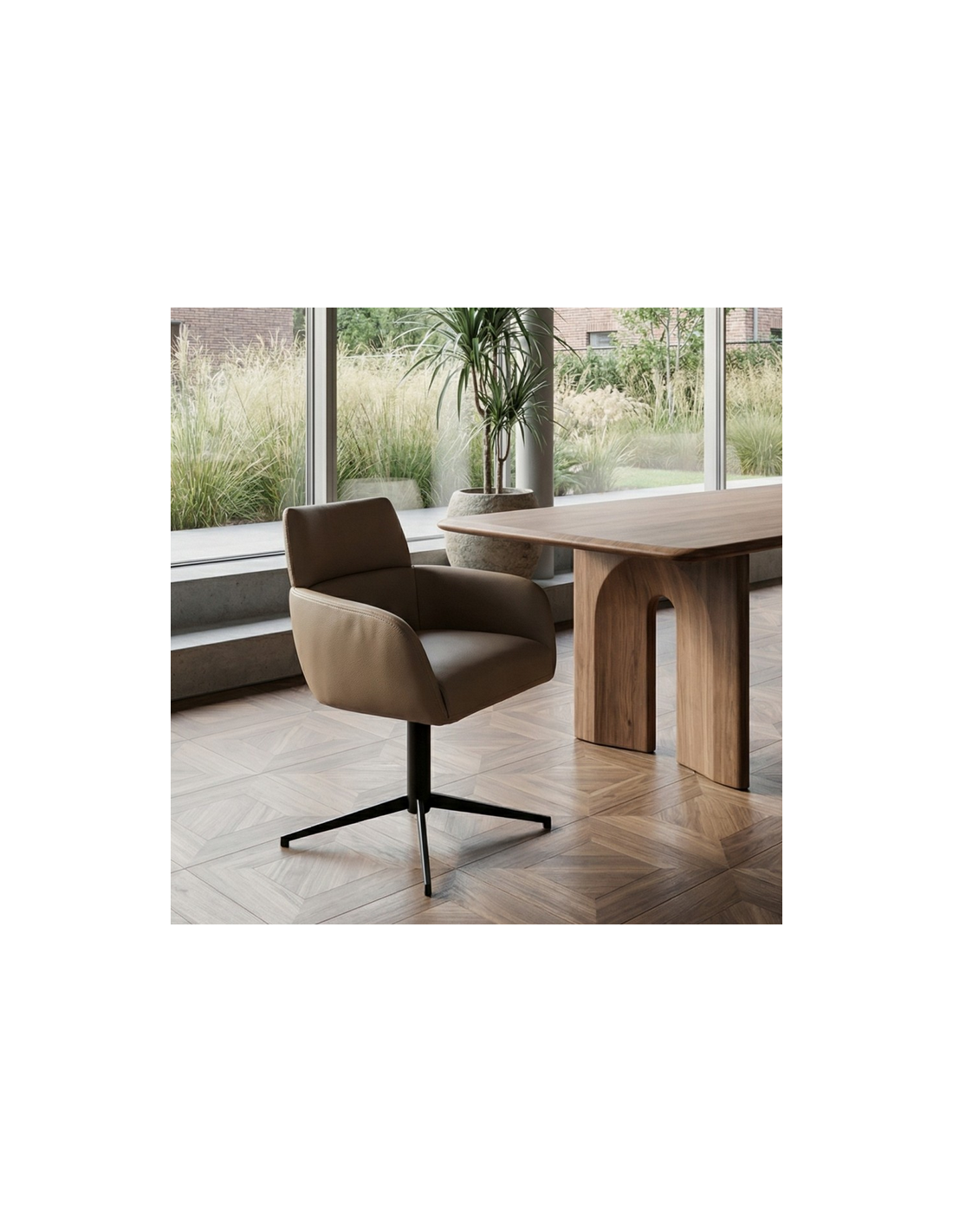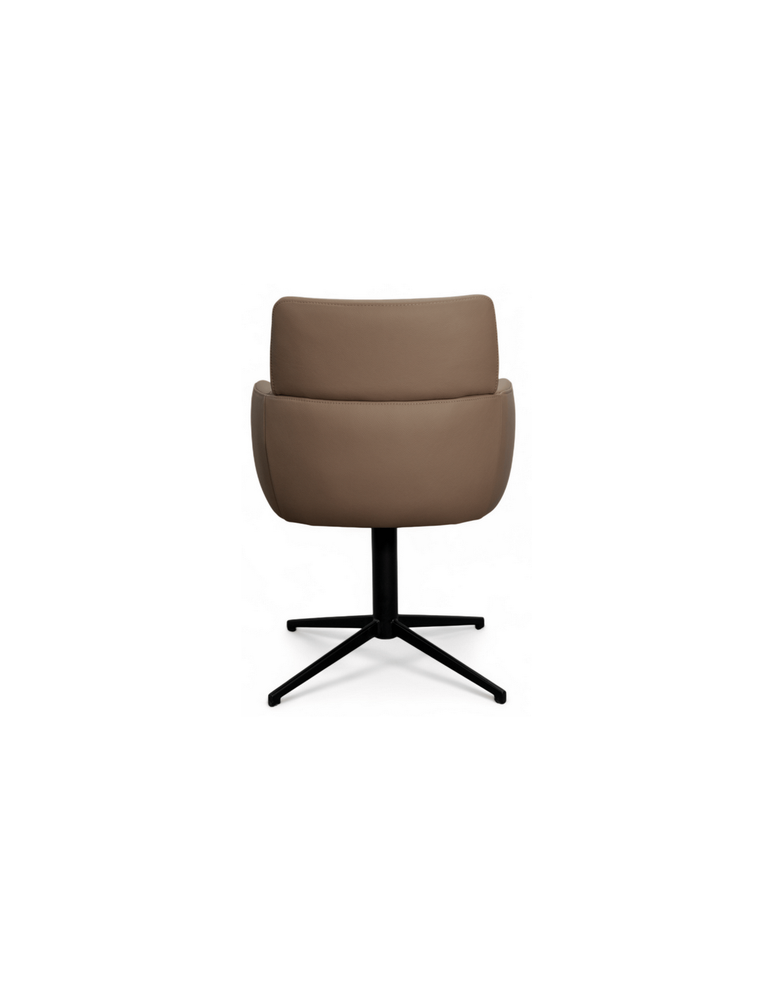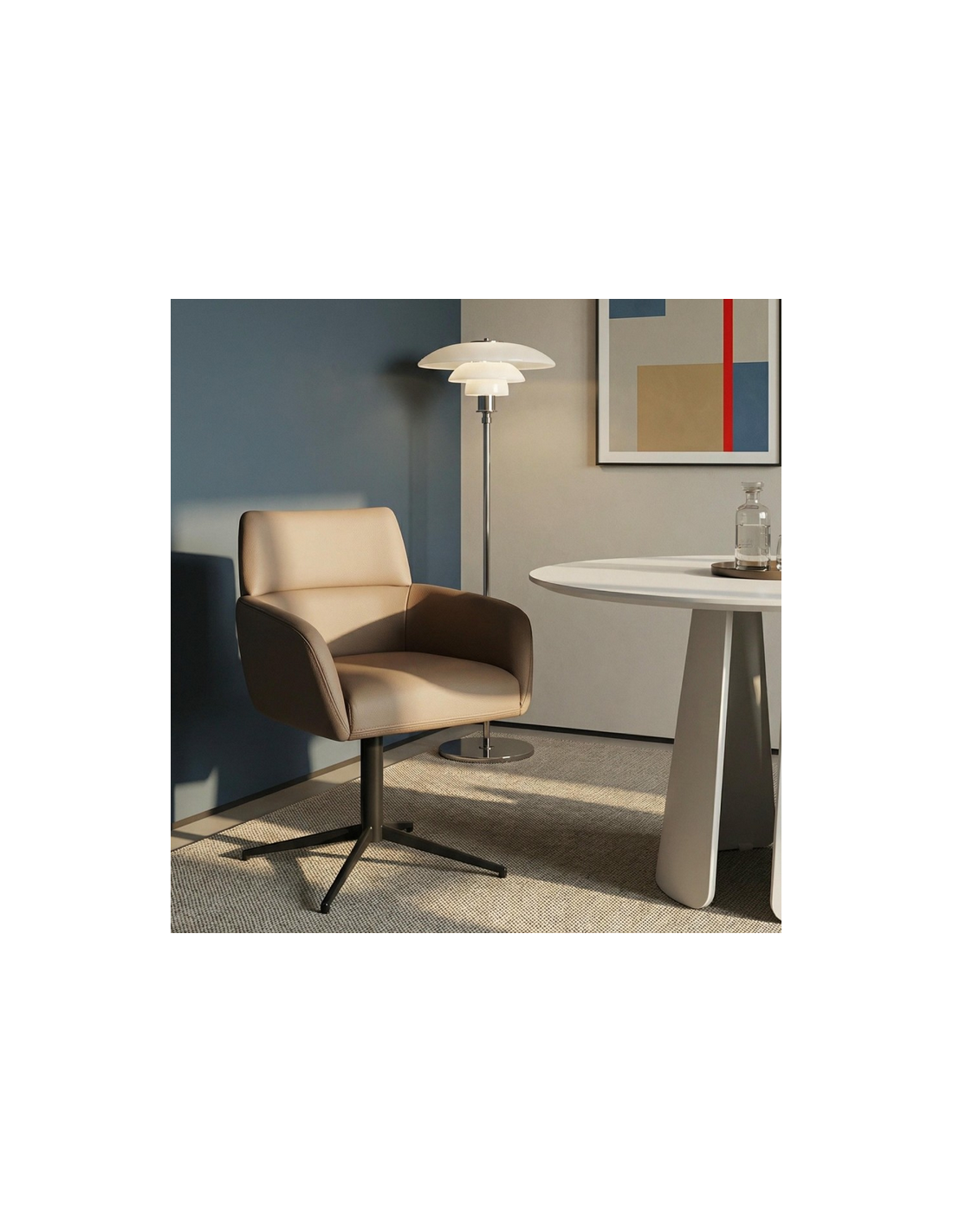 MARC Spisebordsstol med armlæn og drejefod, udført i et design fremstillet i sortlakeret metal og taupefarvet ægte læder. Stolen måler 83 cm i højden over ryggen og med siddehøjde på 49 cm.